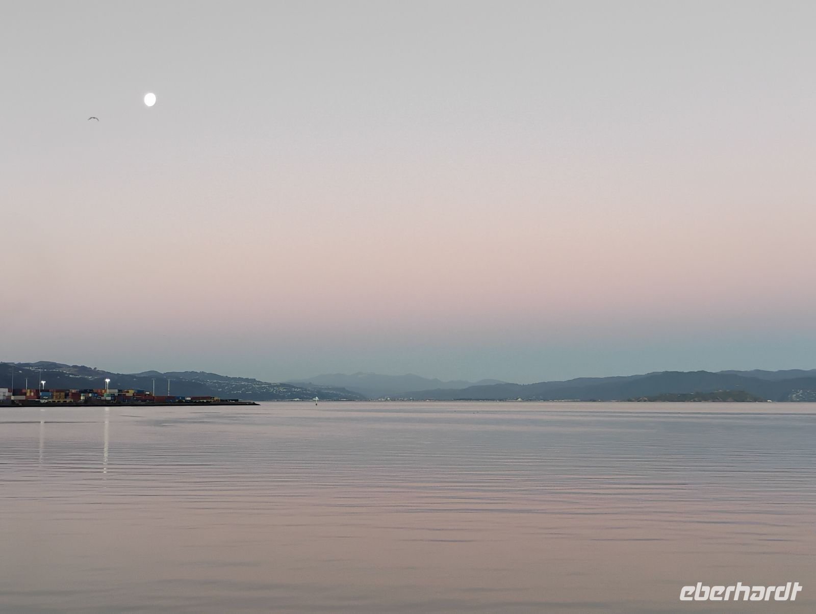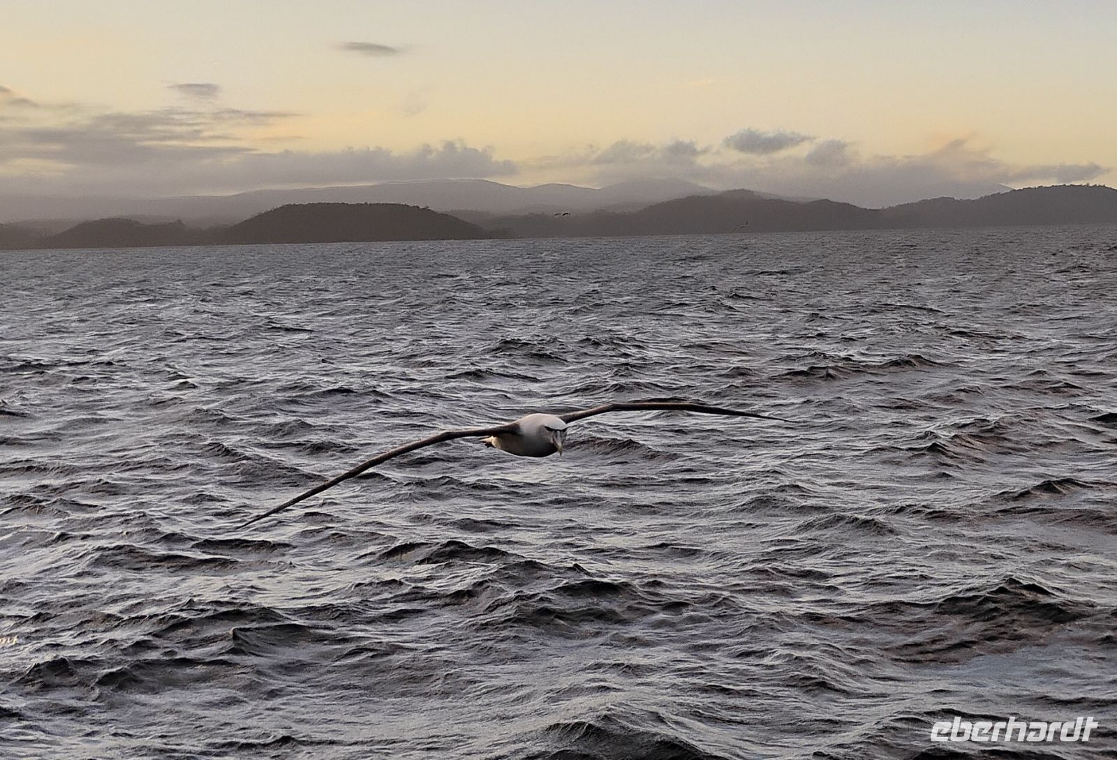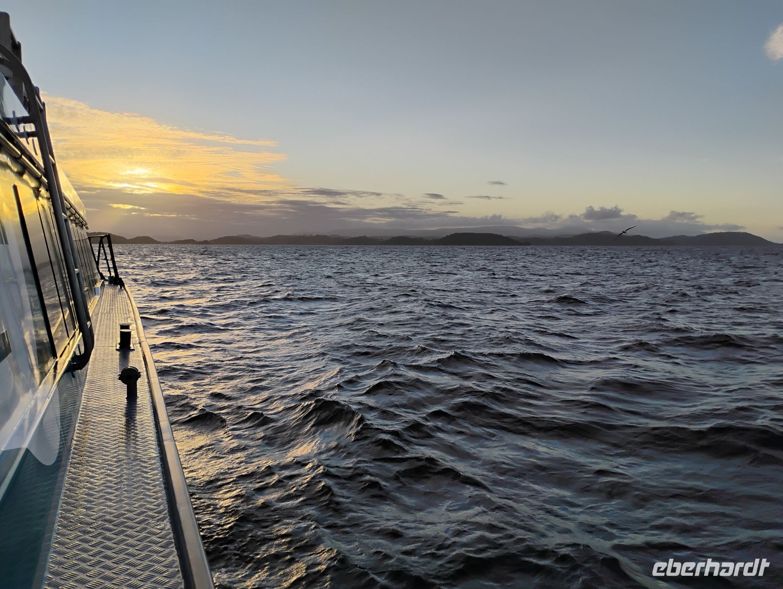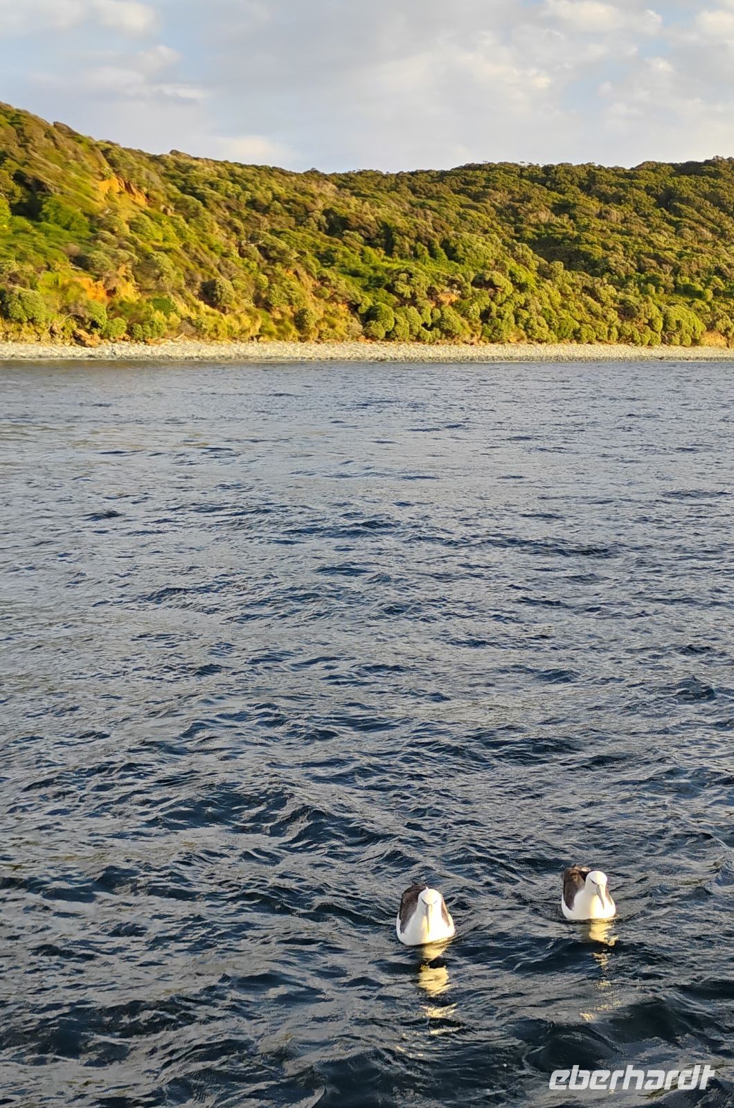 Danach gehen wir noch einmal zum Steg, wo wir für einen weiteren besonderen Programmpunkt einchecken: die Kiwi-Experience am Abend. Der Wind ist noch immer deutlich spürbar und auf dem offenen Meer macht sich die raue See bemerkbar.