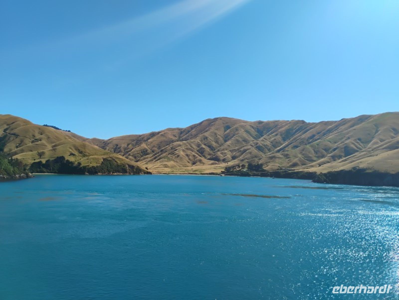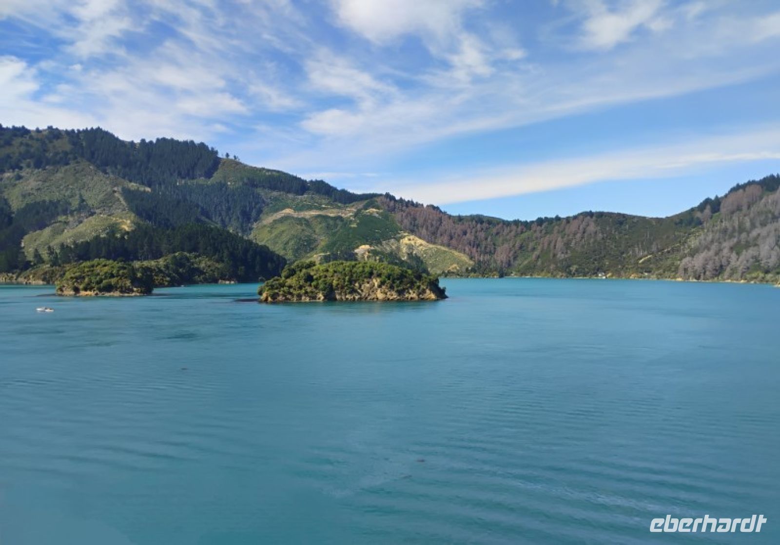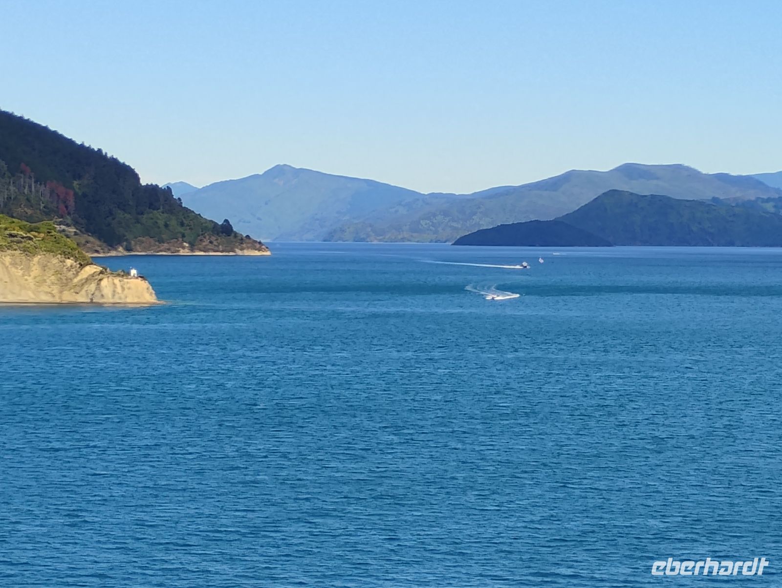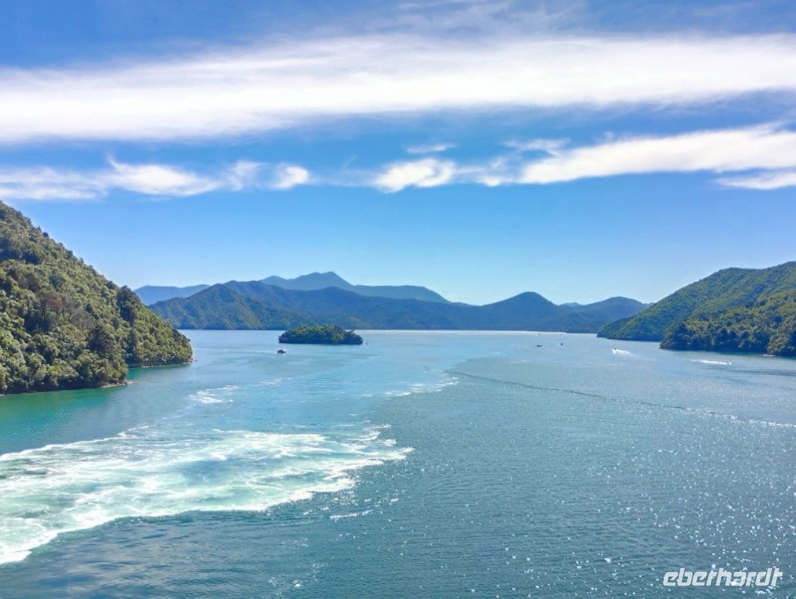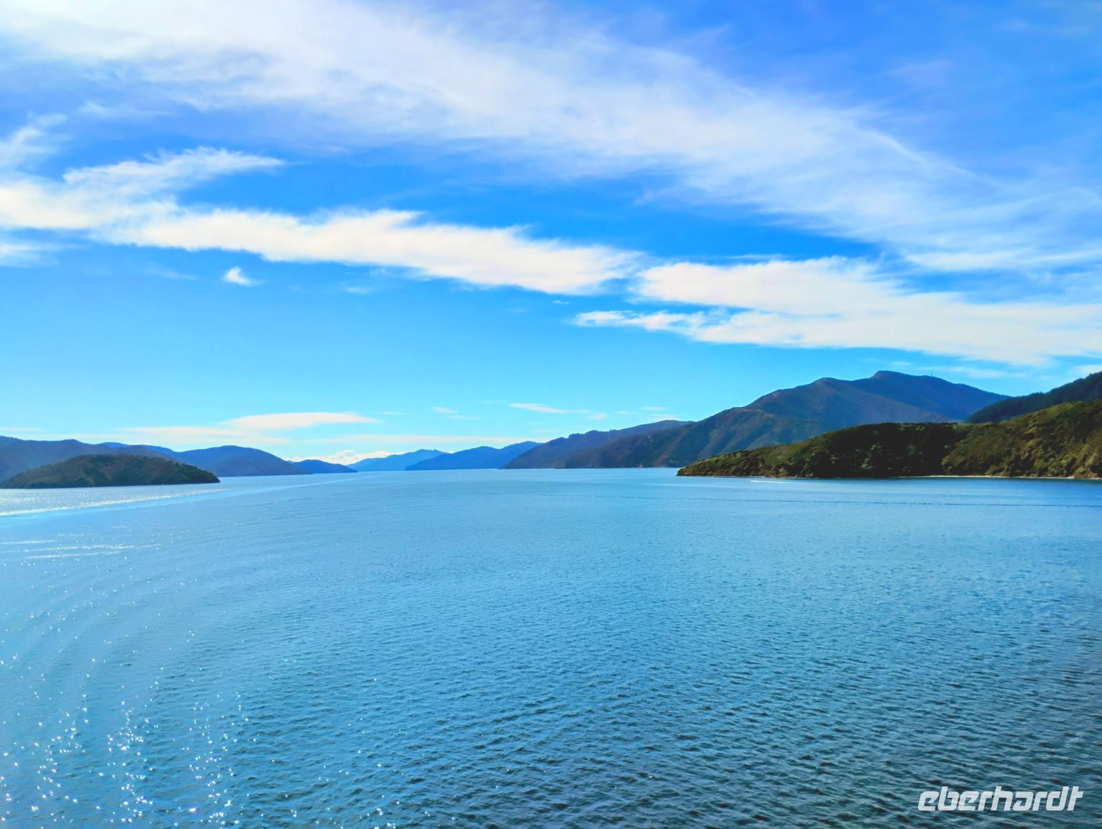 Auf zu neuen Ufern! Heute verabschiedeten wir uns von Neuseelands Nordinsel und setzten mit der Interislander-Fähre nach Picton über. Zunächst ging es über die Cook Strait, die Meerenge zwischen Nord- und Südinsel, bevor die Fähre in die Marlborough Sounds einfährt.