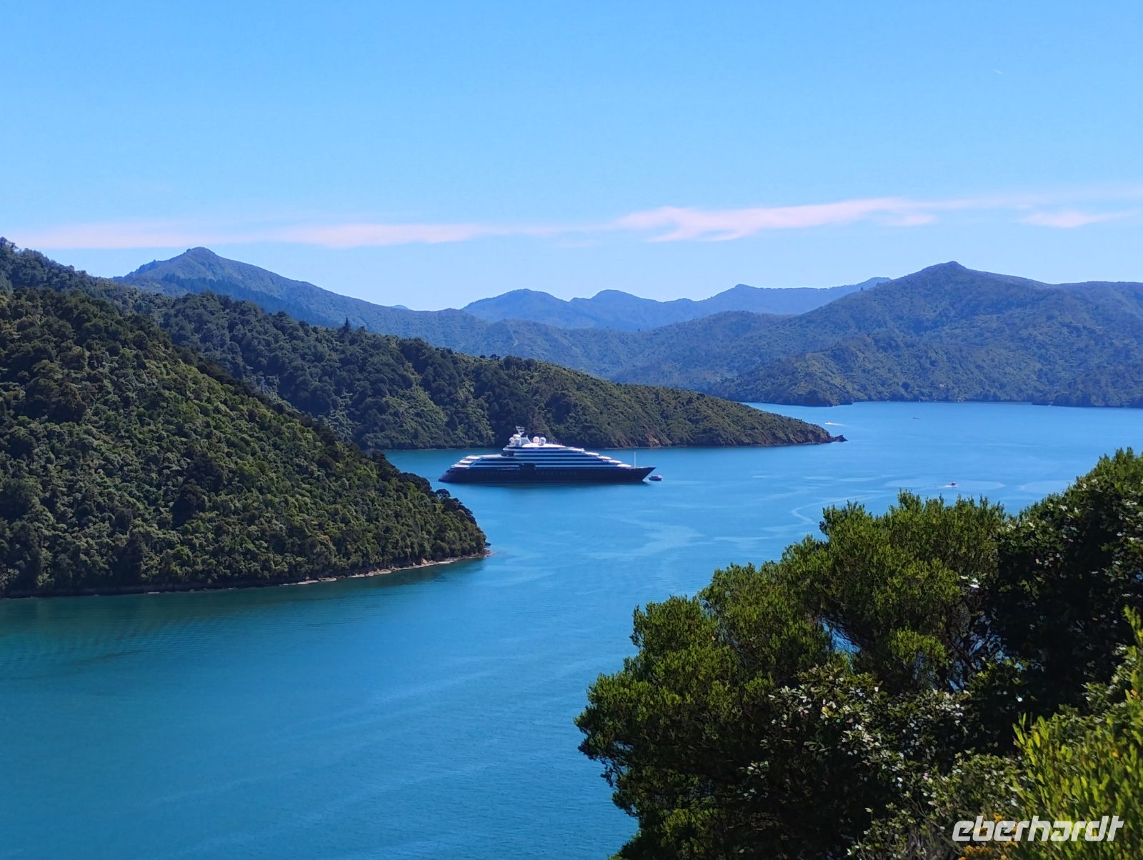 Genau genommen befuhren wir den Queen Charlotte Sound, einen der Hauptarme dieses weitläufigen Systems aus vom Meer gefluteten Flusstälern. Die Landschaft wirkt ruhig und abgeschieden. Viele standen an Deck, um diesen ersten Eindruck der Südinsel zu genießen.