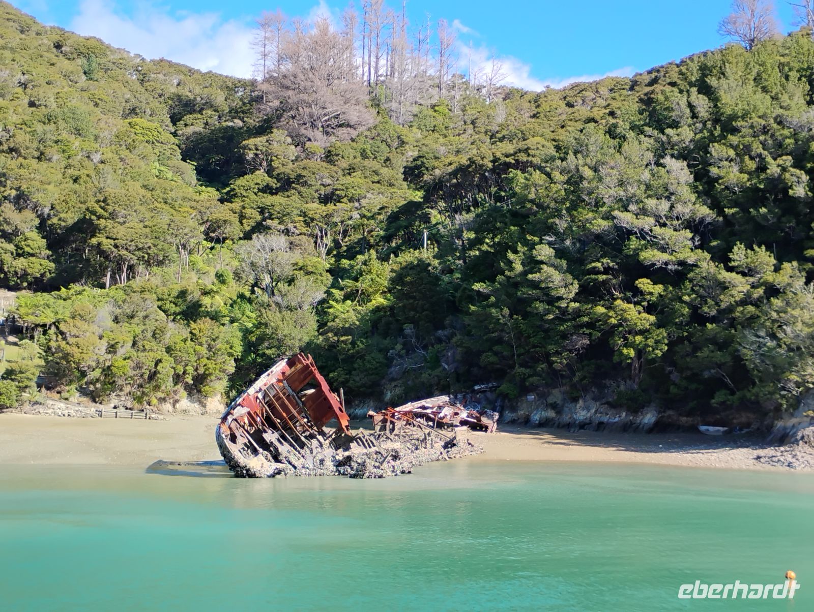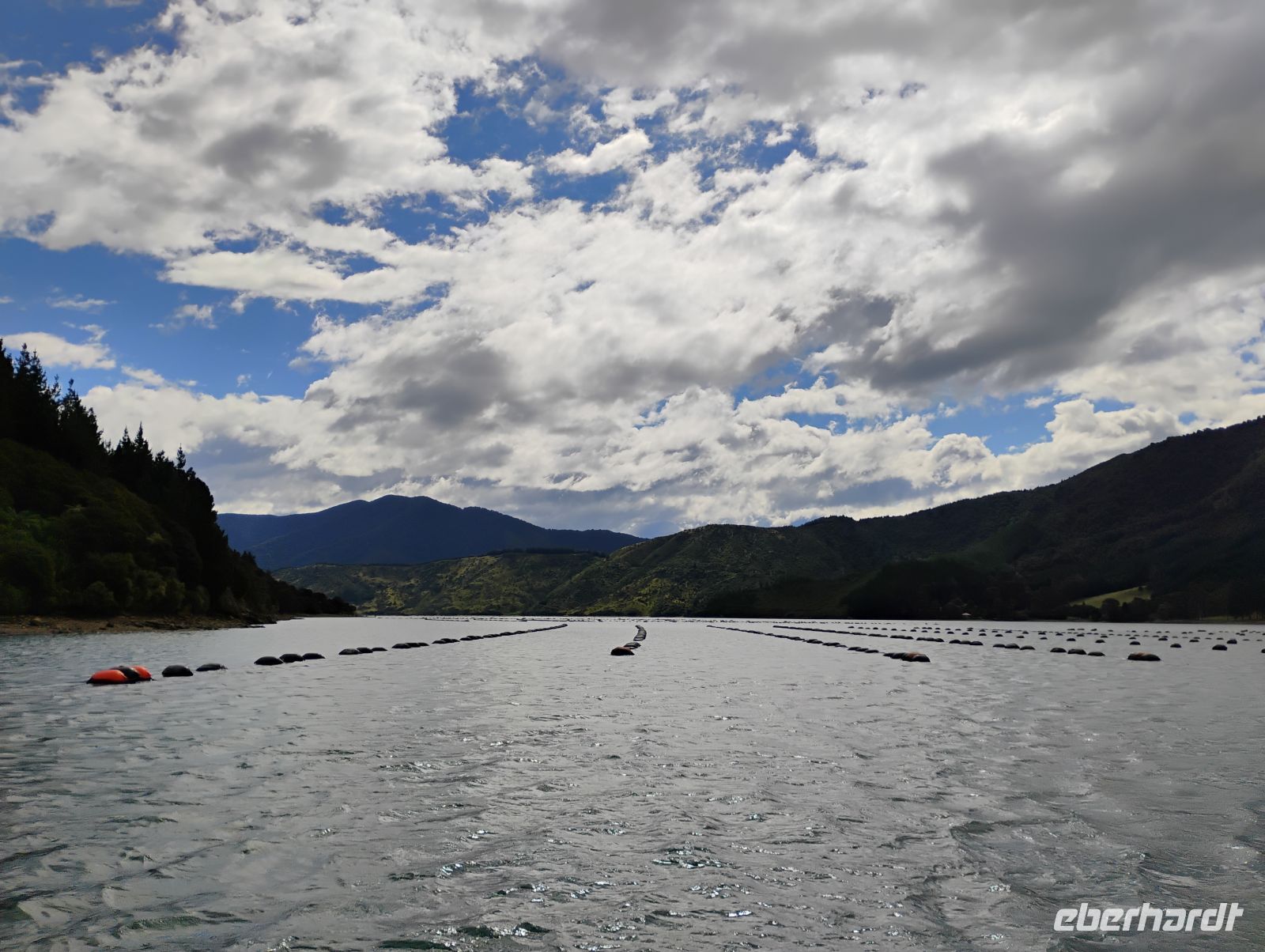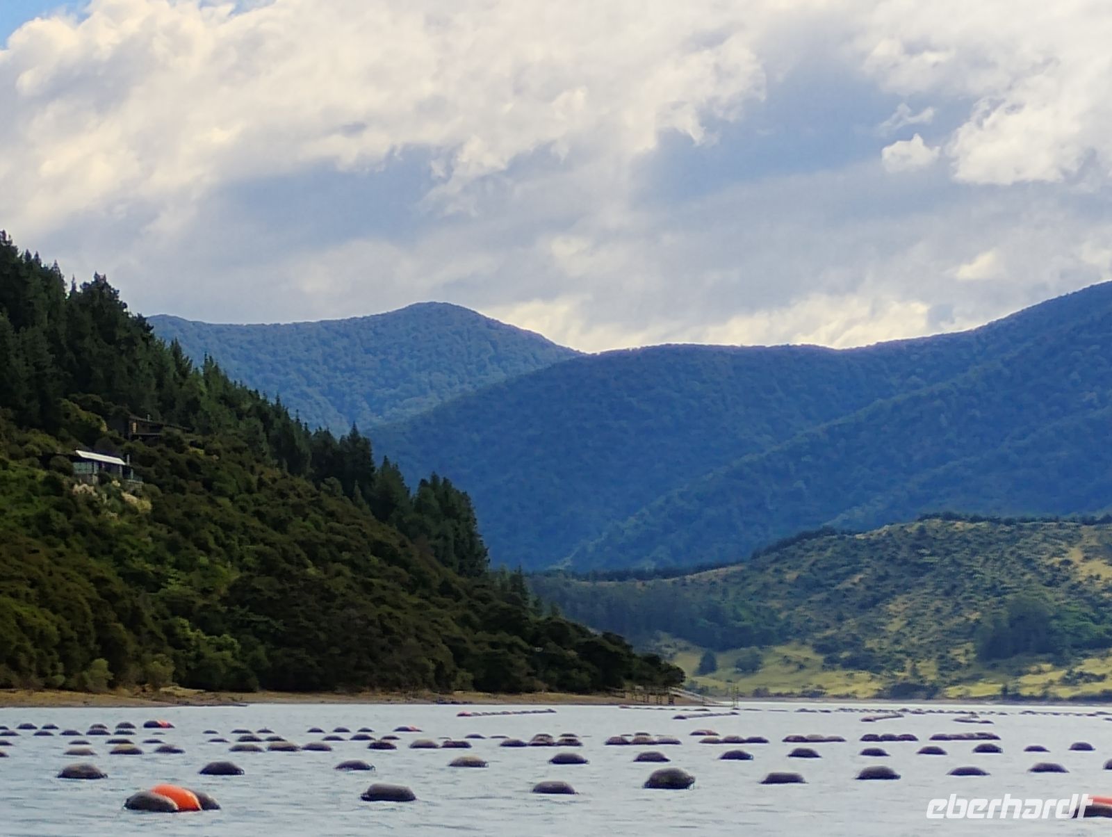 Ganz wohl war uns zunächst nicht: Der Wind hatte am Vormittag kräftig geblasen, unsere Handys zeigten starke Böen an, und wir fragten uns, wie angenehm die Bootsfahrt wohl werden würde. Doch kaum waren wir im geschützten Gewässer unterwegs, zeigte sich ein anderes Bild. Im Kenepuru Sound, einem Seitenarm der Marlborough Sounds, war es überraschend ruhig. Wir fuhren an einsamen Buchten, wenigen Ferienhäusern oder Muschelfarmen vorbei. Kormorane saßen auf ihren Nestern, am Ufer schimmerten Muschelschalen.