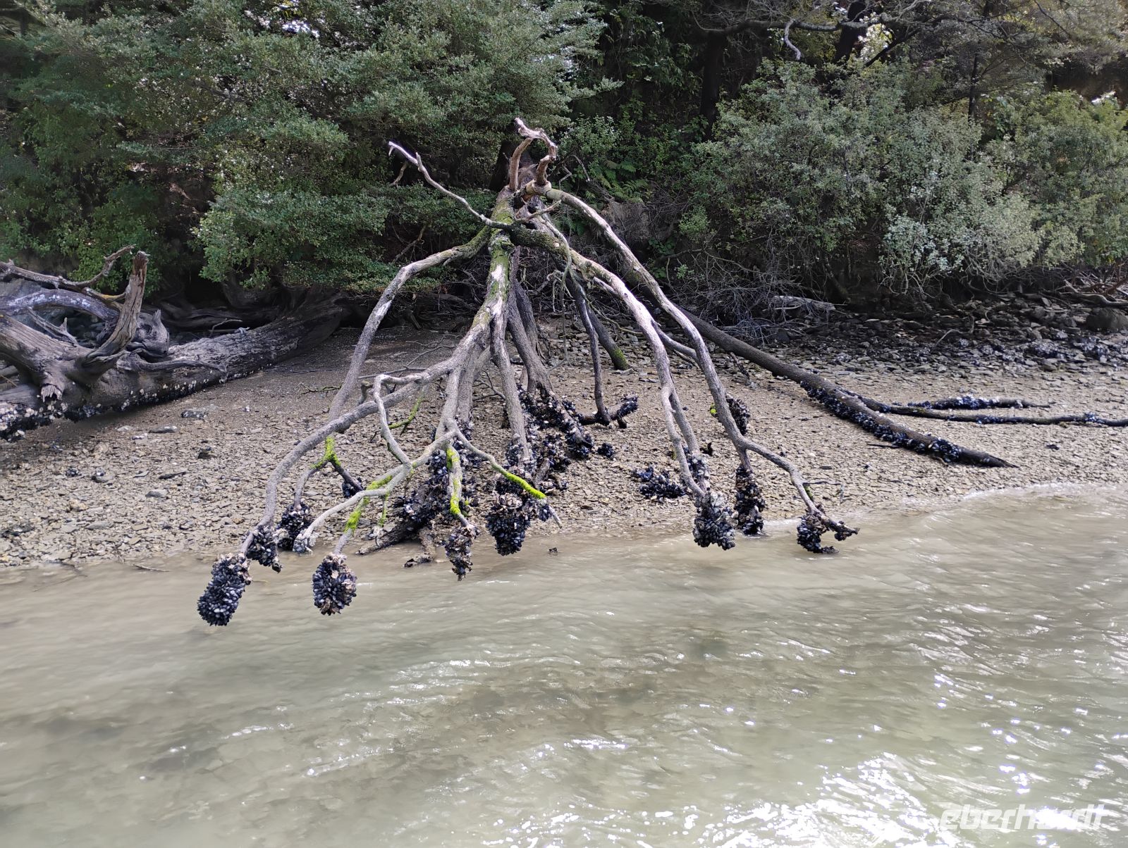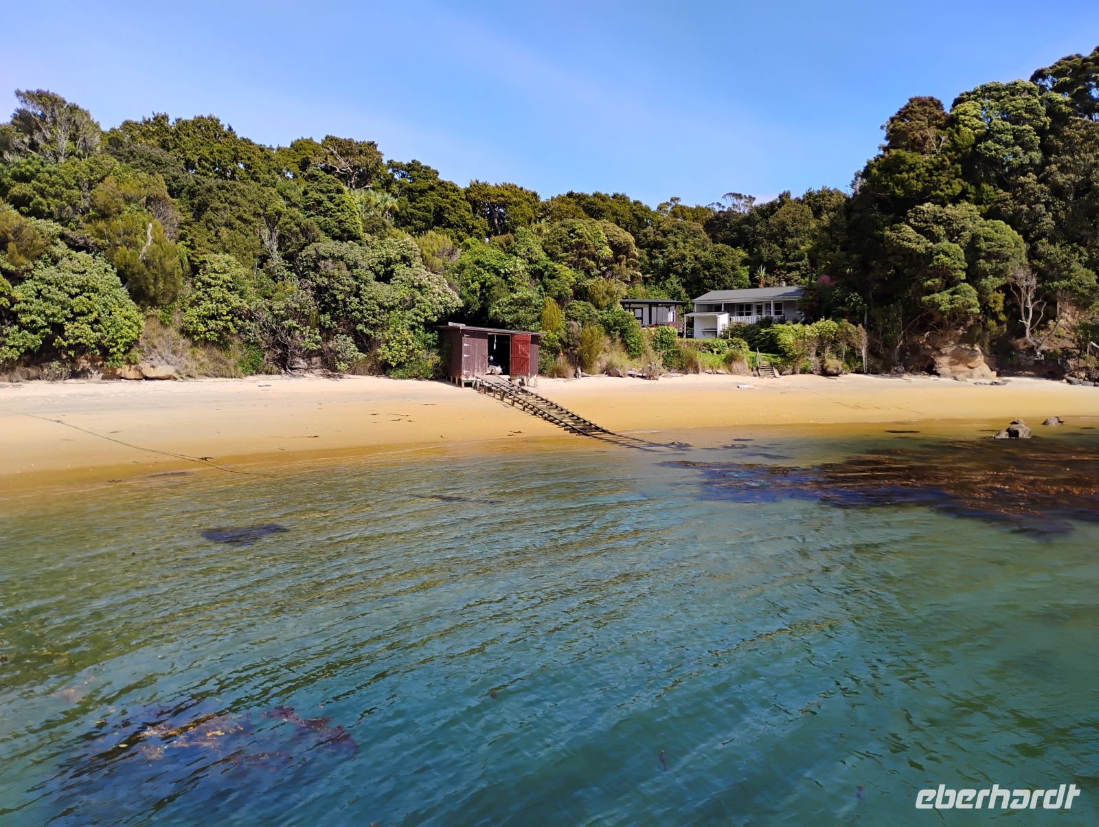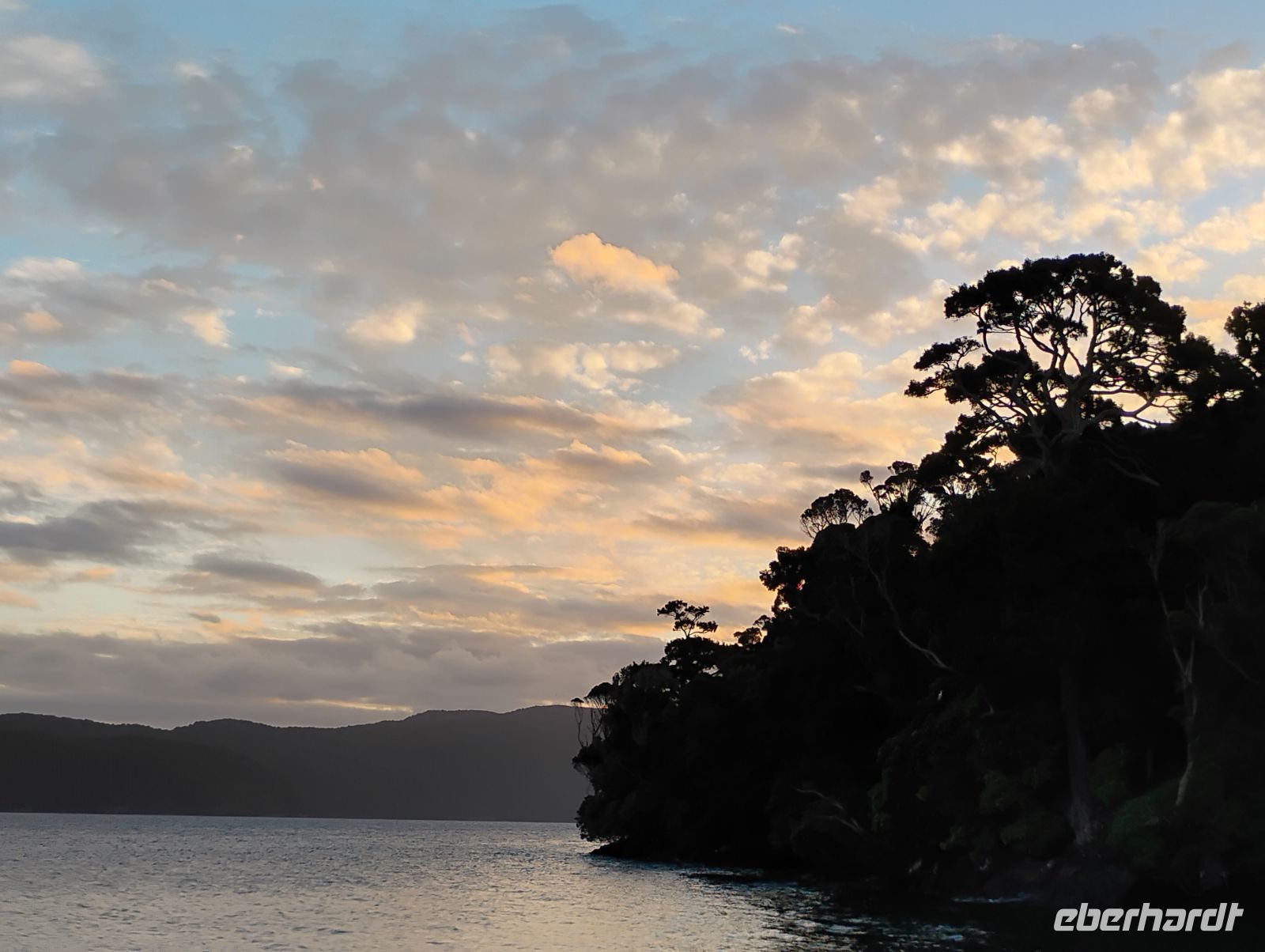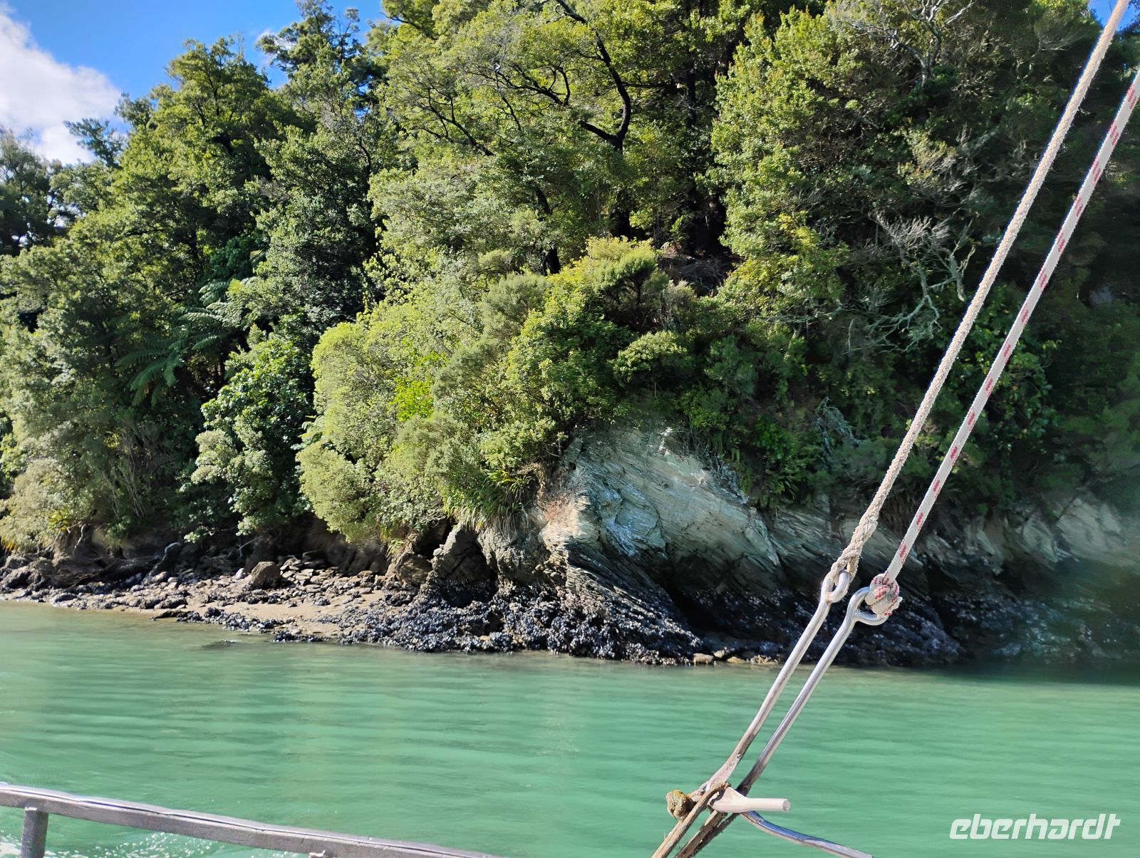 Ganz wohl war uns zunächst nicht: Der Wind hatte am Vormittag kräftig geblasen, unsere Handys zeigten starke Böen an, und wir fragten uns, wie angenehm die Bootsfahrt wohl werden würde. Doch kaum waren wir im geschützten Gewässer unterwegs, zeigte sich ein anderes Bild. Im Kenepuru Sound, einem Seitenarm der Marlborough Sounds, war es überraschend ruhig. Wir fuhren an einsamen Buchten, wenigen Ferienhäusern oder Muschelfarmen vorbei. Kormorane saßen auf ihren Nestern, am Ufer schimmerten Muschelschalen.