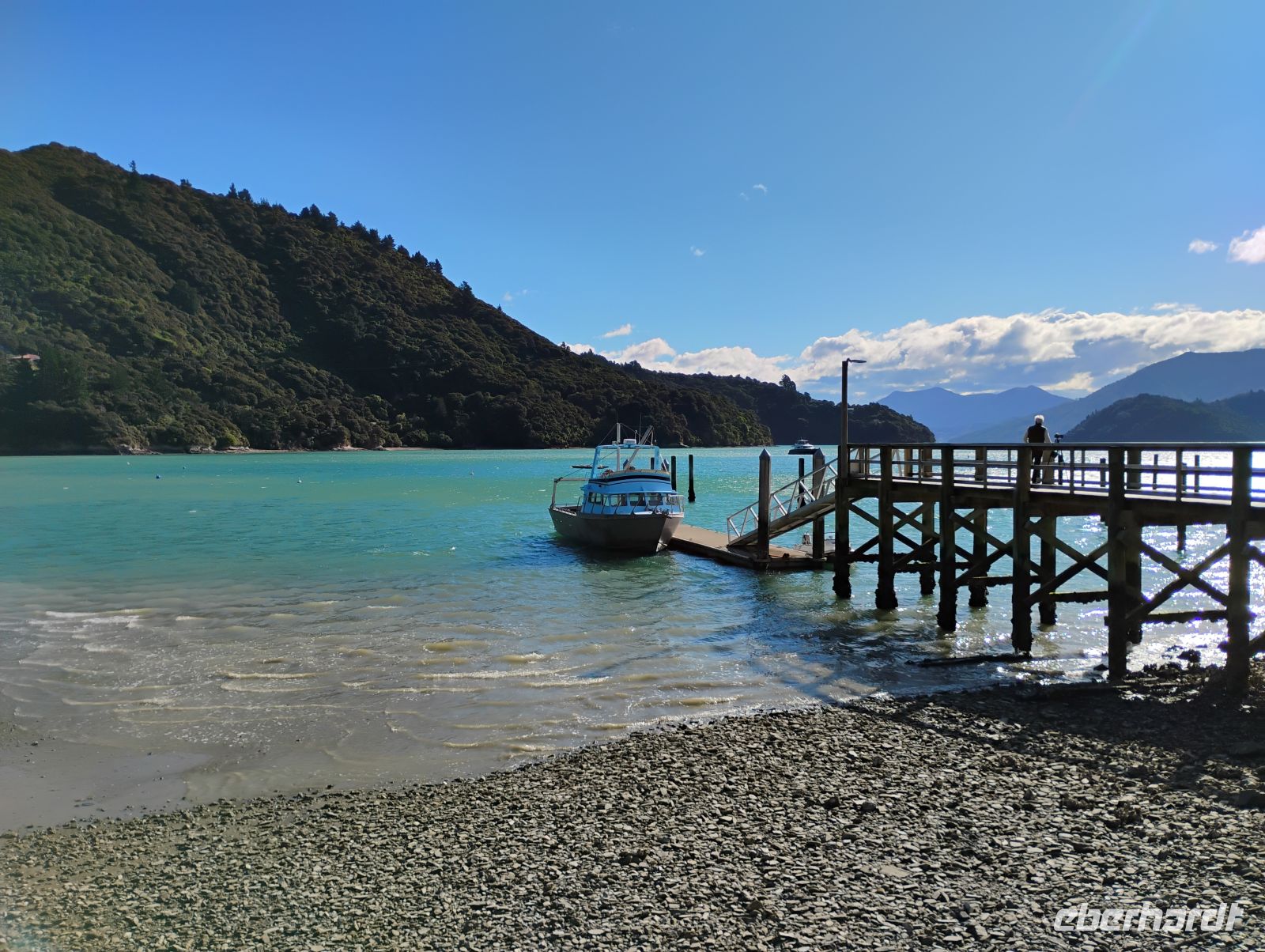 Um 13 Uhr trafen wir uns vor der Rezeption und warteten auf Gary von Pelorus Tours, dessen Familie hier bereits in vierter Generation tätig ist. Sein Unternehmen existiert seit 1912 – vom Postboot über Wassertaxi bis zur Muschelfarm.
