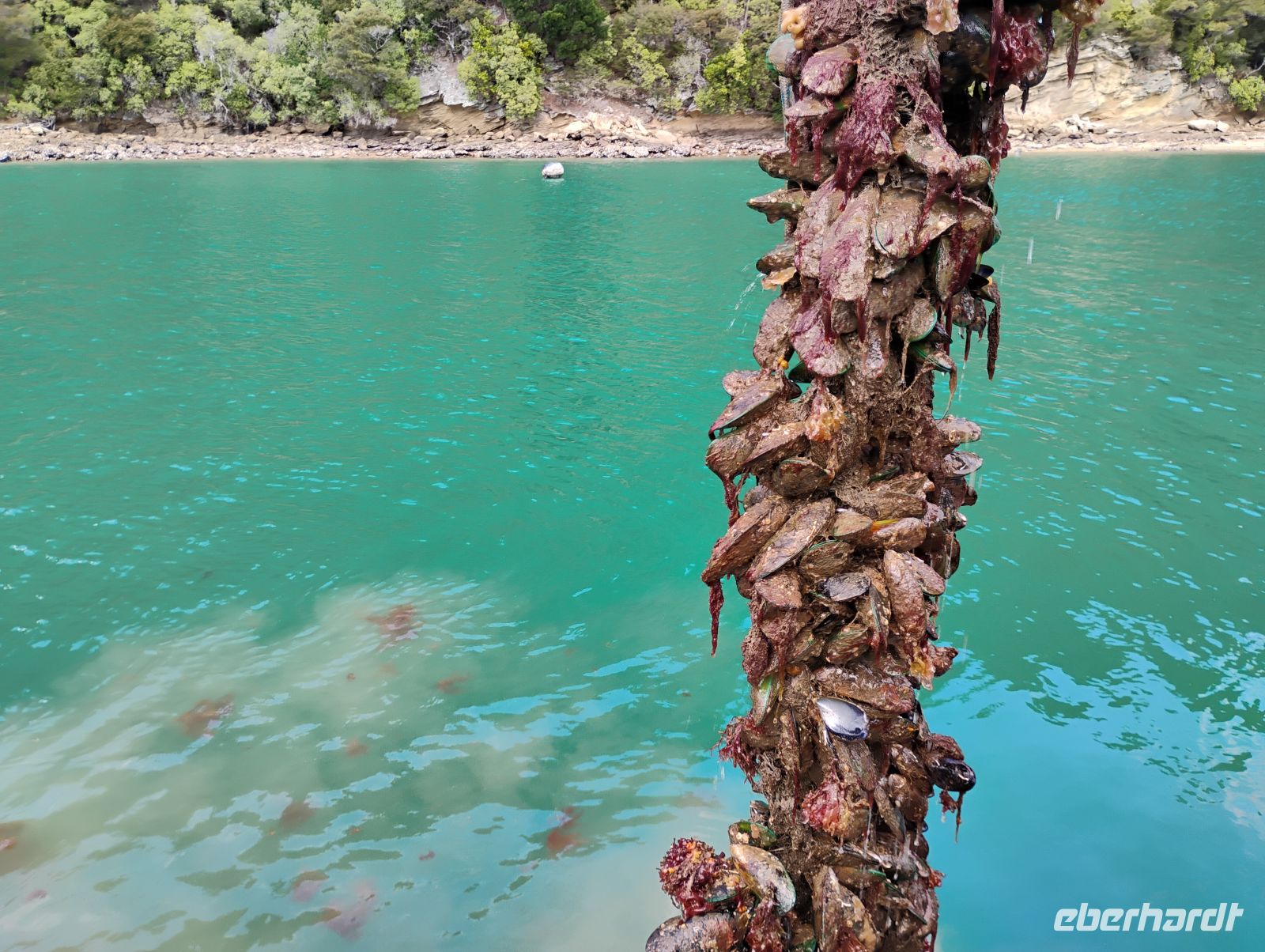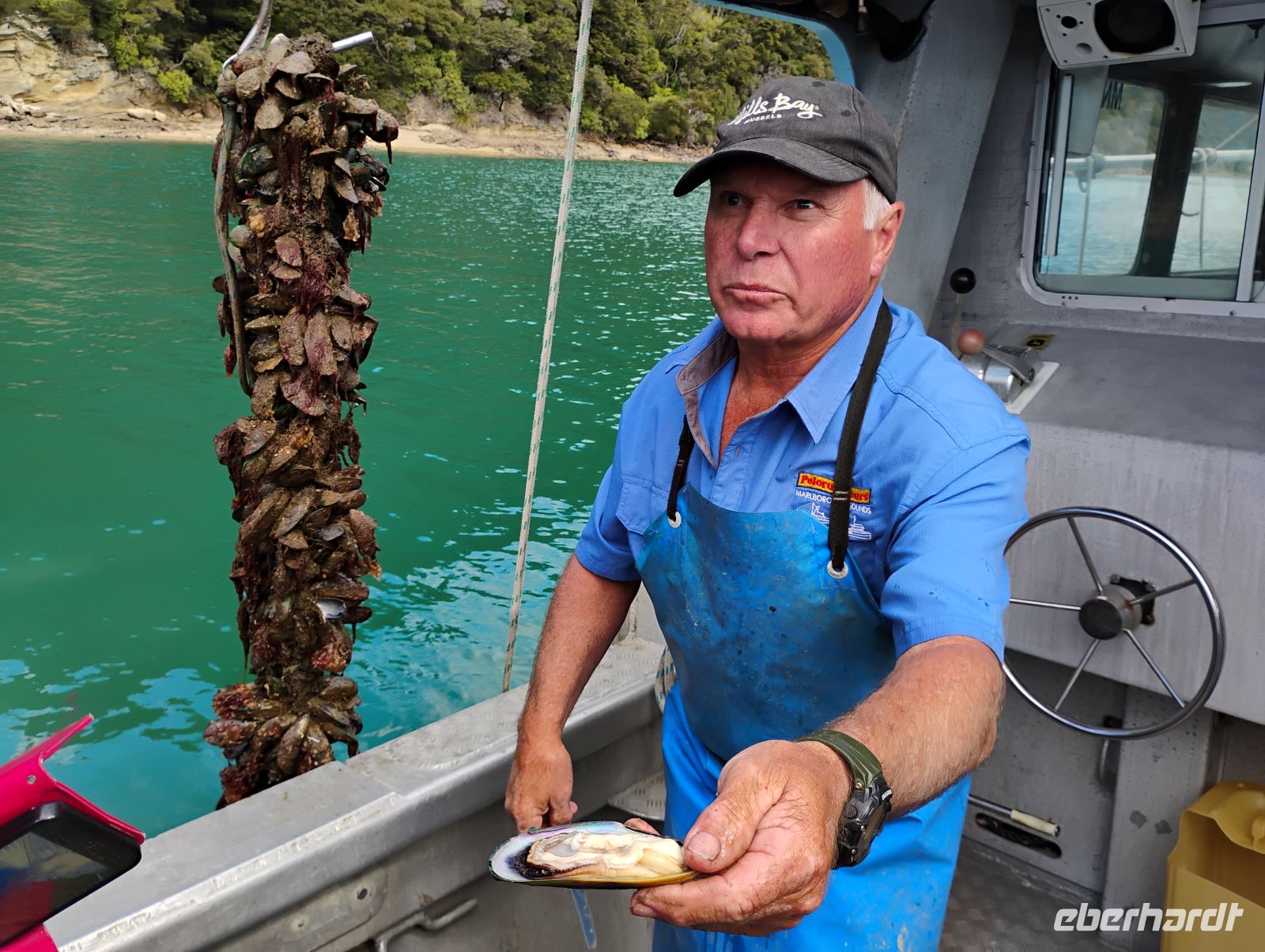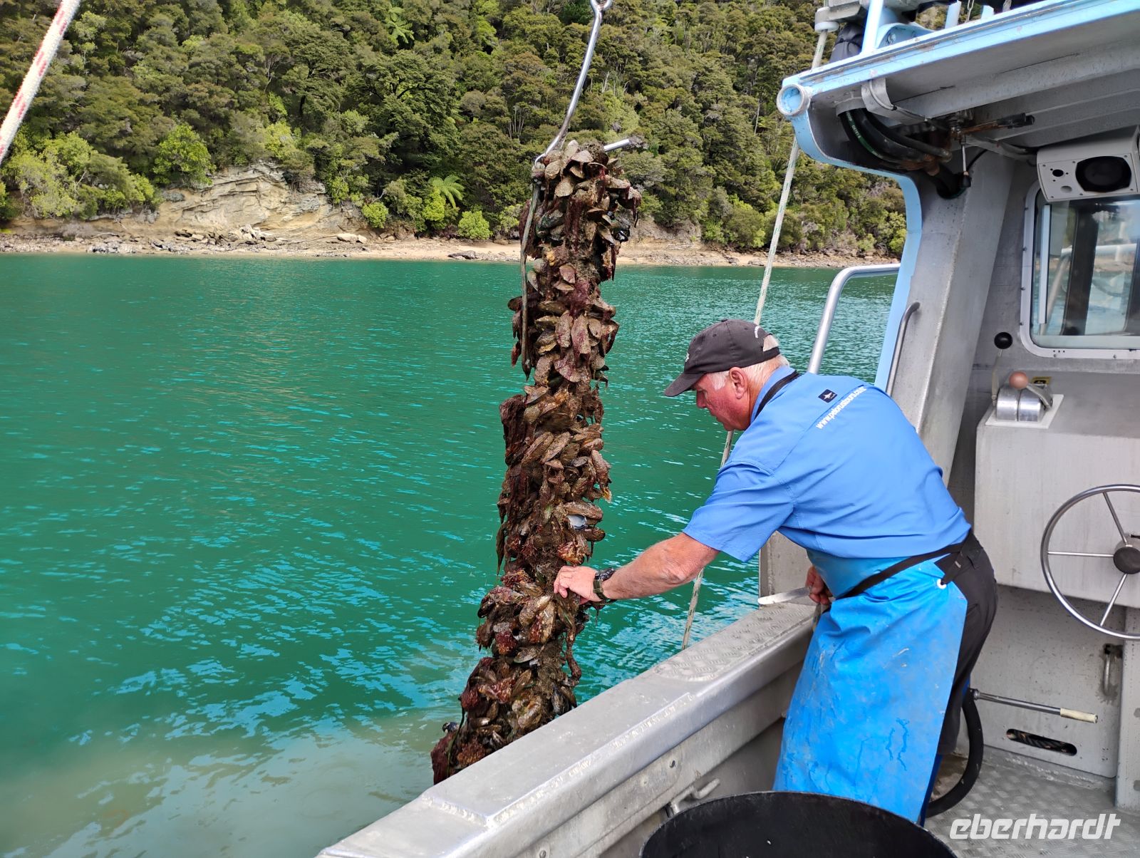 Unser Ziel war Garys eigene Muschelfarm. Dort holte er frische Grünlippmuscheln aus dem Wasser – bis zu einer Tonne kann an einer Boje hängen, erfuhren wir. Die Muscheln brauchen rund zwei Jahre, bis sie erntereif sind. Kurz darauf wurden sie für uns gekocht und mit frischem Brot serviert. Dazu hatte Michael passenden neuseeländischen Wein mitgebracht und Garys Frau hatte zudem eine leckere Käseplatte für uns vorbereitet. Besser hätte ein Lunch kaum schmecken können: frisch, regional und in geselliger Runde direkt auf dem Wasser.