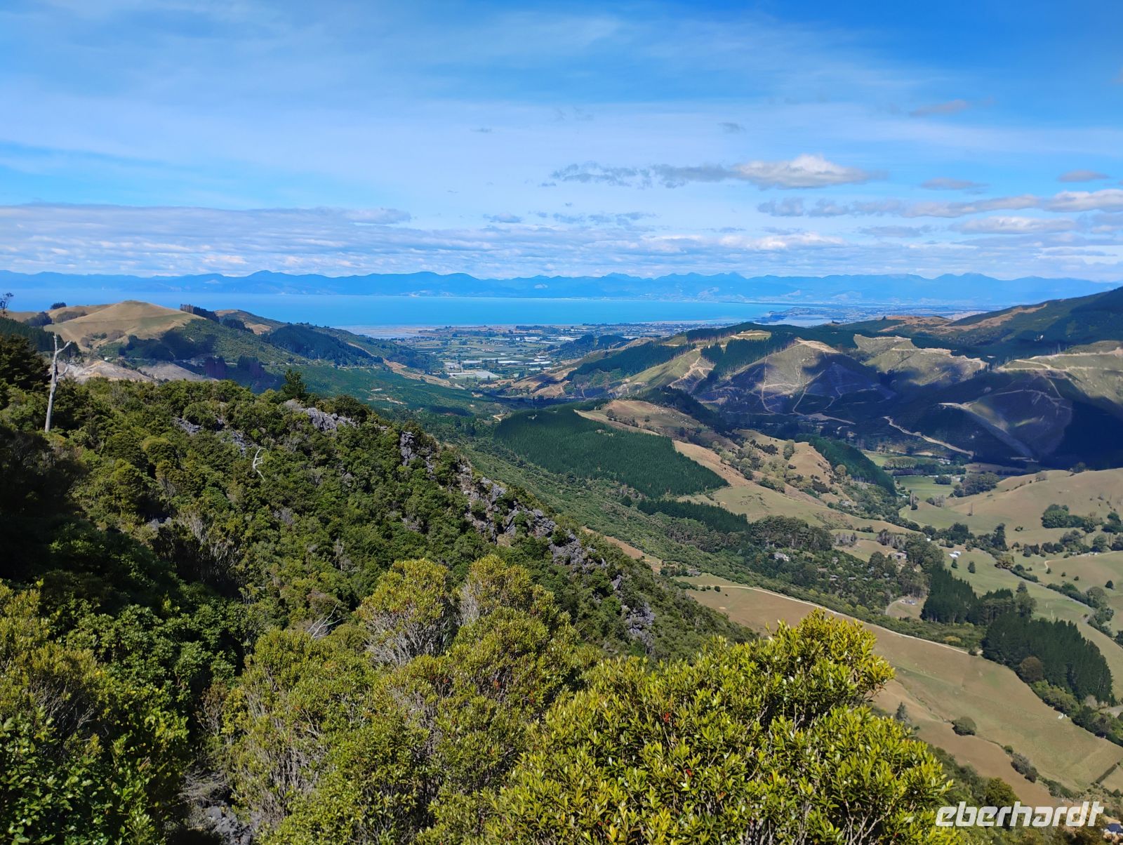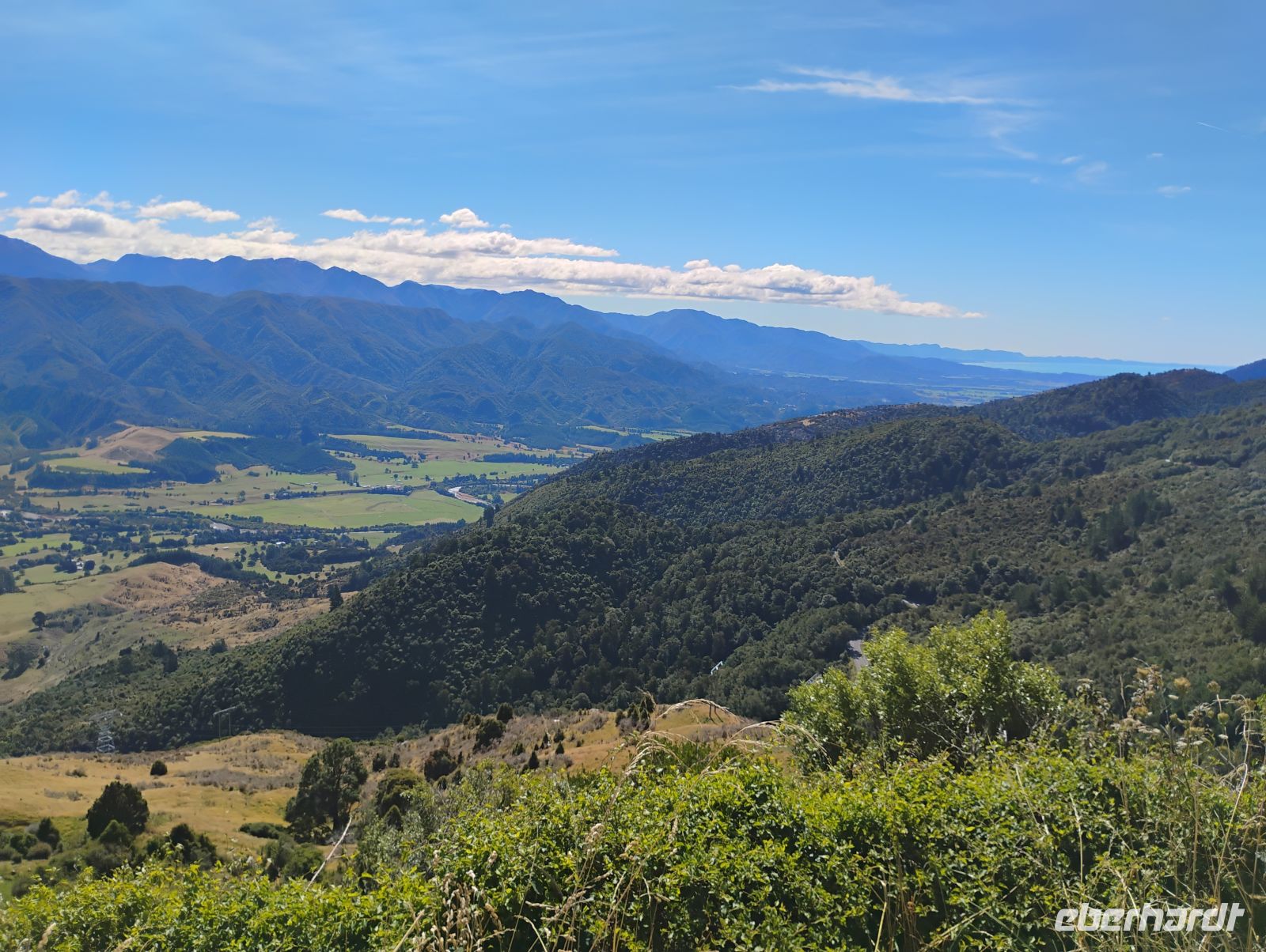 Die Straße über den Takaka Hill schlängelt sich eindrucksvoll in die Höhe und eröffnet immer wieder weite Ausblicke über Küste und Meer. Ein kurzer Spaziergang zum Aussichtspunkt belohnte uns mit einem herrlichen Blick auf die Golden Bay.