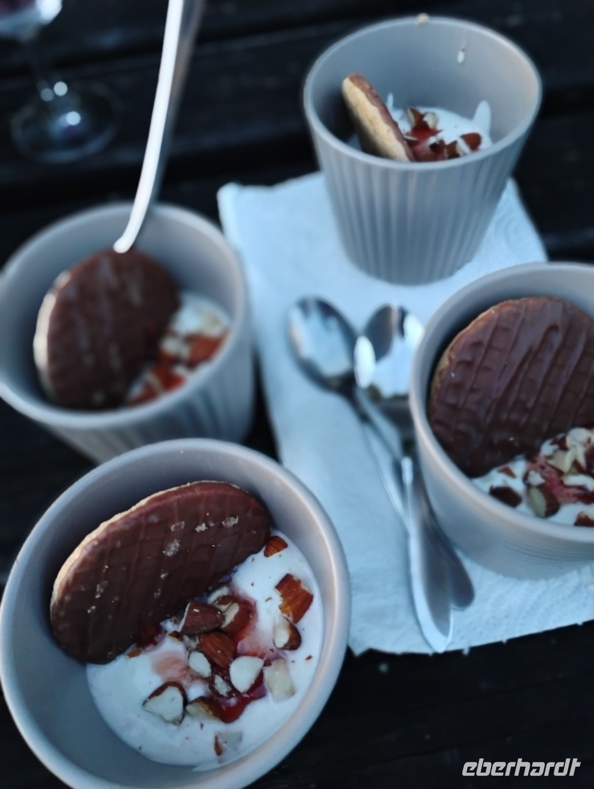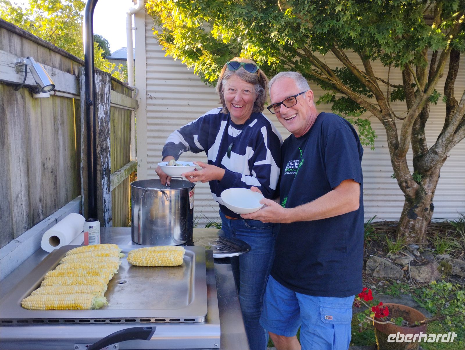 Anschließend genießen wir einen Kiwi-Grillabend und setzen dabei unsere Weinprobe mit einem Pinot Noir und einem Shiraz fort. Den Abschluss bildet ein Apple-Crumble (mit Hokey-Pokey-Eis), den ich vorbereitet hatte. Unsere entdeckten Flohmarkt-Schälchen und Weingläser kommen an diesem Abend somit auch wieder zum Einsatz. Kaum auf dem Tisch, war das Dessert jedoch schon fast verschwunden – ein Foto davon gibt es deshalb leider nicht.