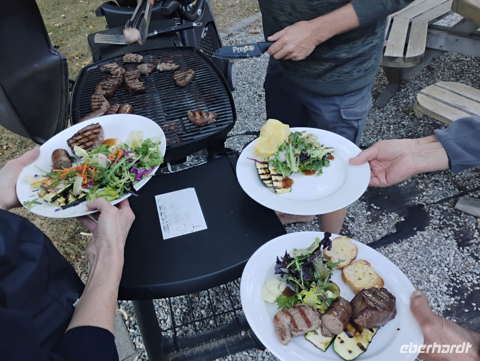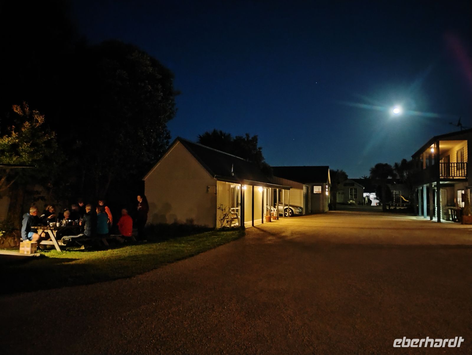 Am Abend wurde gemeinsam gegrillt: verschiedene Steakarten, Hirschbratwurst und Maiskolben. Dazu ein frischer Salat. Die beim Flohmarkt entdeckten Schälchen erwiesen sich als praktisch für die Nachspeise, ebenso kamen die Weingläser wieder zum Einsatz. Über uns leuchtete der Vollmond und in der Nacht konnte man sogar eine Mondfinsternis beobachten! Ein besonderer Abschluss eines rundum gelungenen Tages zwischen Tasman Bay und Golden Bay.