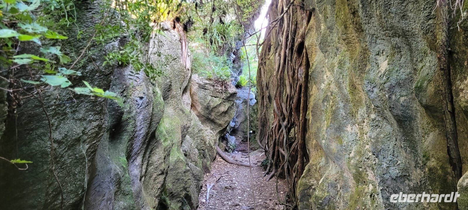 Weiter ging es ins Grove Scenic Reserve. Zwischen moosbewachsenen Kalksteinformationen und dichtem Grün führte ein schmaler Pfad hinauf zu einem Aussichtspunkt – und überraschend öffnete sich der Blick weit hinaus bis zum Meer. Die bizarren Karstformen und die üppige Vegetation verliehen dem Ort eine fast märchenhafte Stimmung. Am Wegesrand probierten wir die Frucht des Kawakawa-Strauchs. Wie auch die Blätter, schmecken die Früchte leicht pfeffrig und finden in der traditionellen Pflanzenkunde der Māori Verwendung.