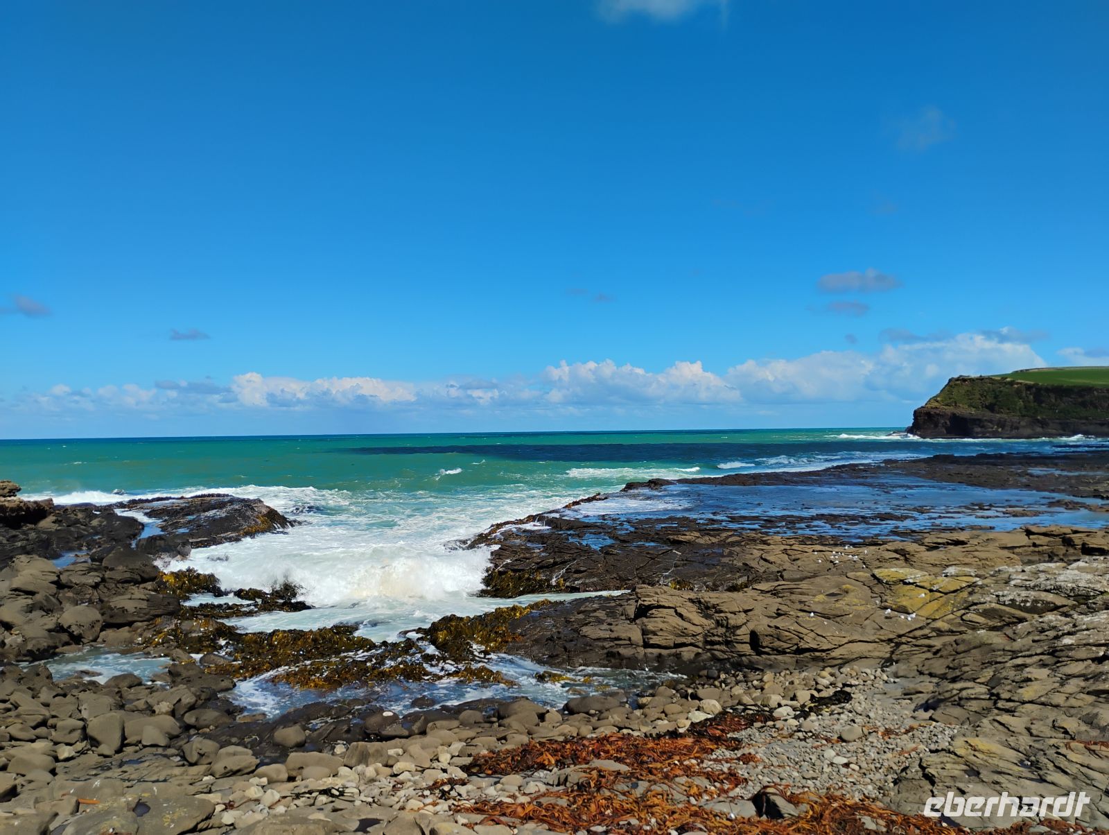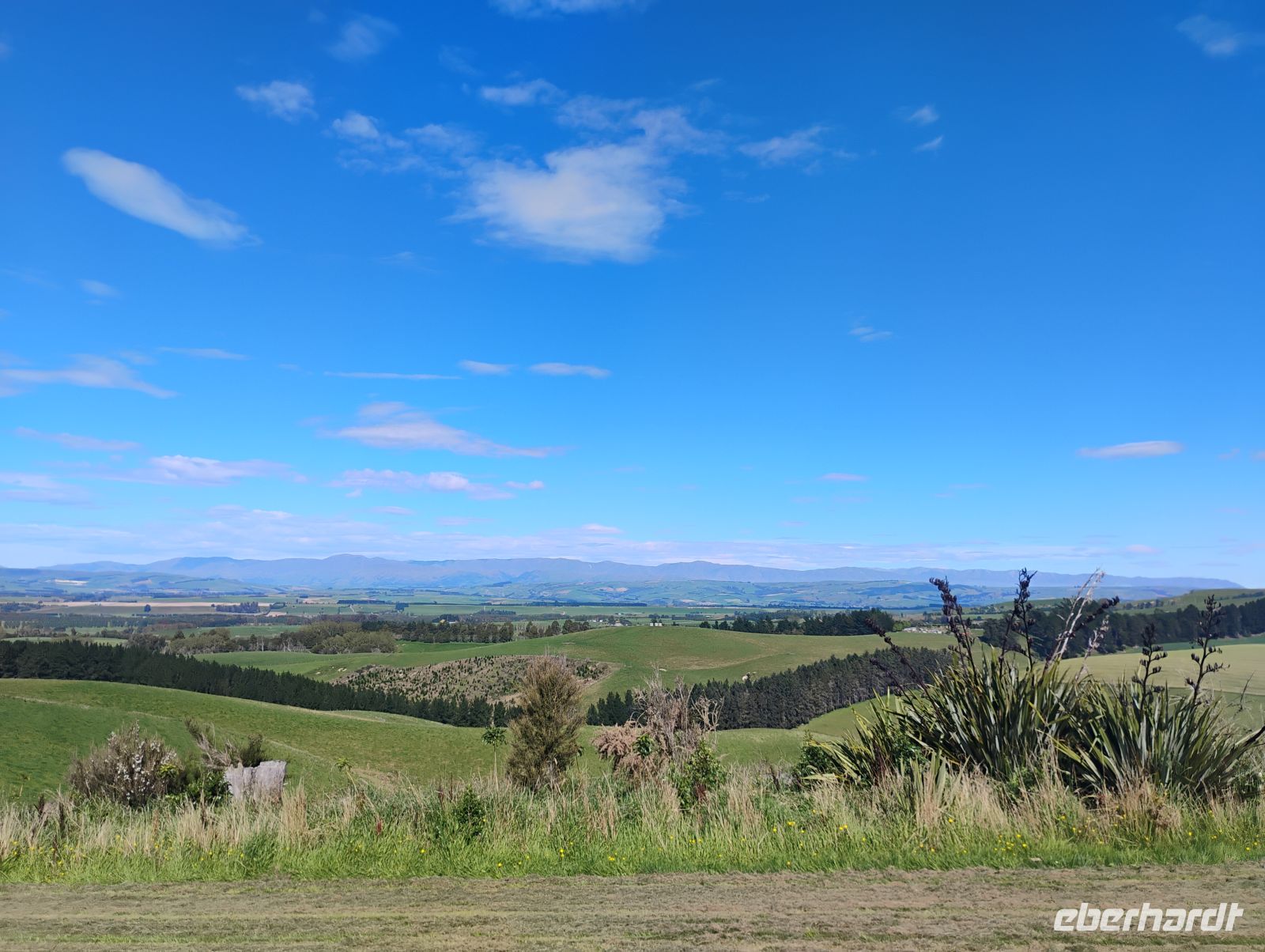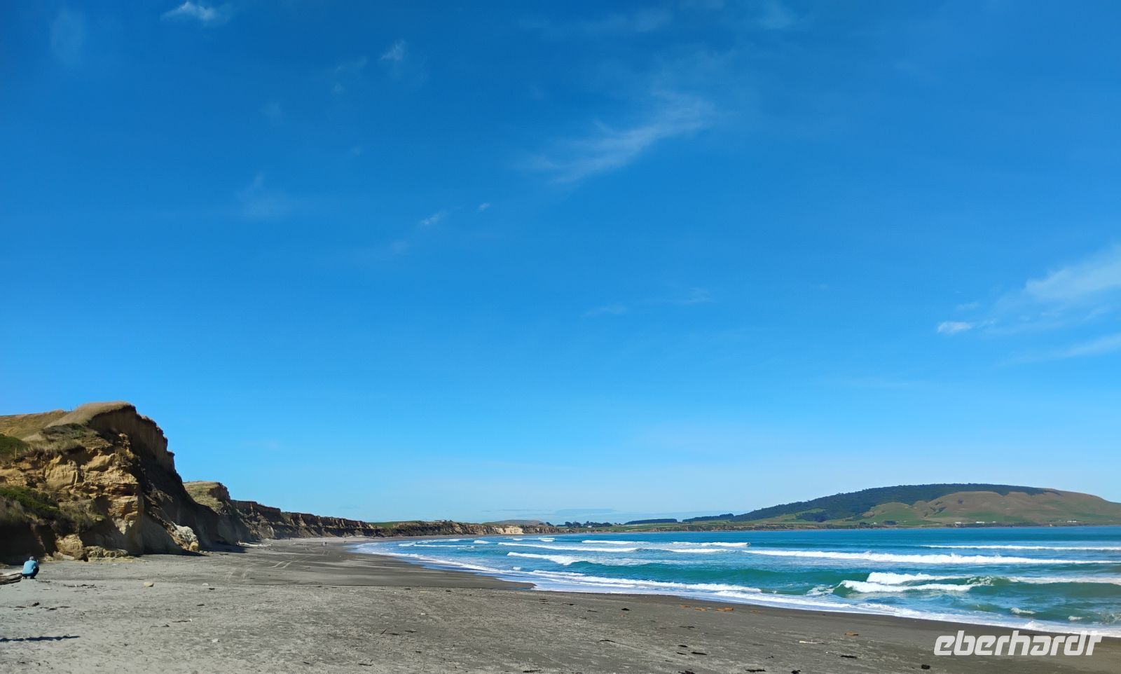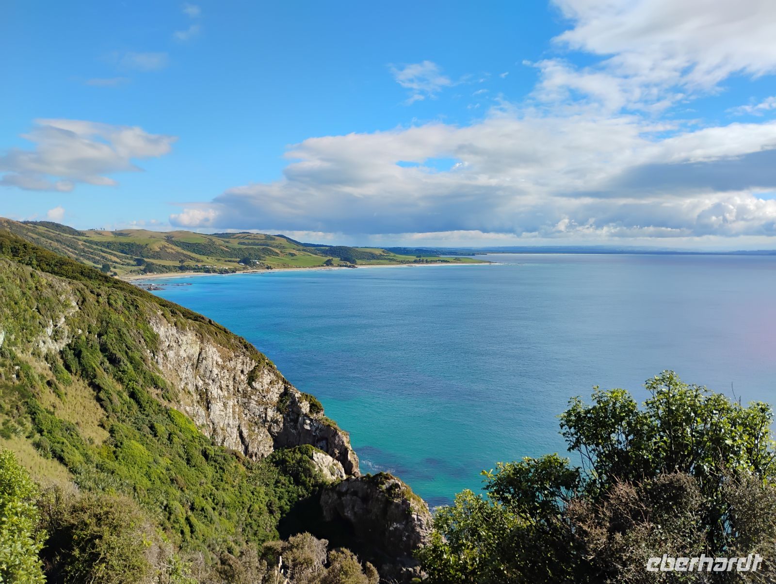 Am Nachmittag setzen wir unsere Fahrt fort. Die Landschaft bleibt abwechslungsreich: grüne Hügel, abgelegene Farmen, dichte Küstenvegetation und immer wieder weite Blicke über das Meer. Wir durchfahren eine der stilleren, aber besonders eindrucksvollen Regionen Neuseelands.