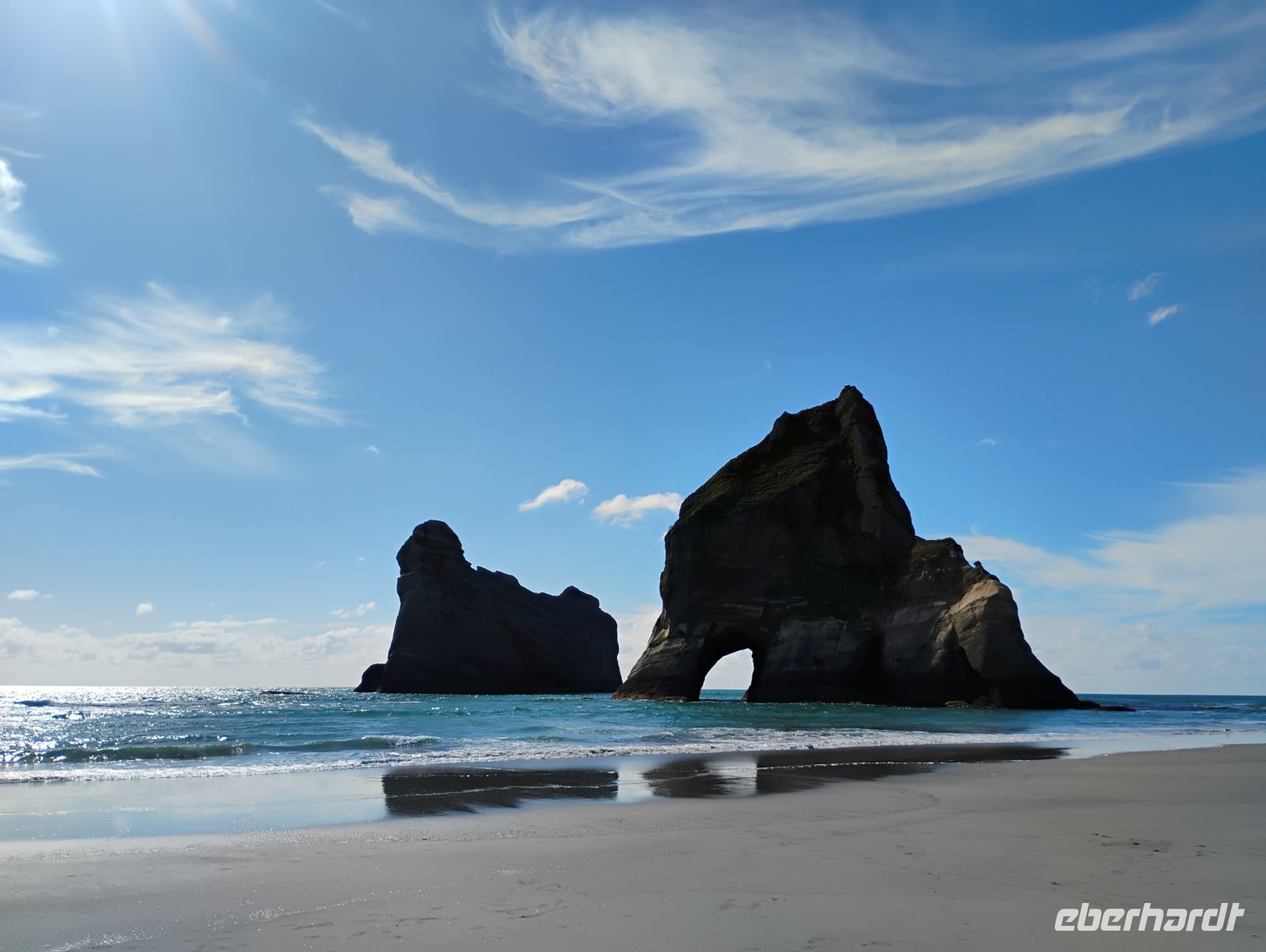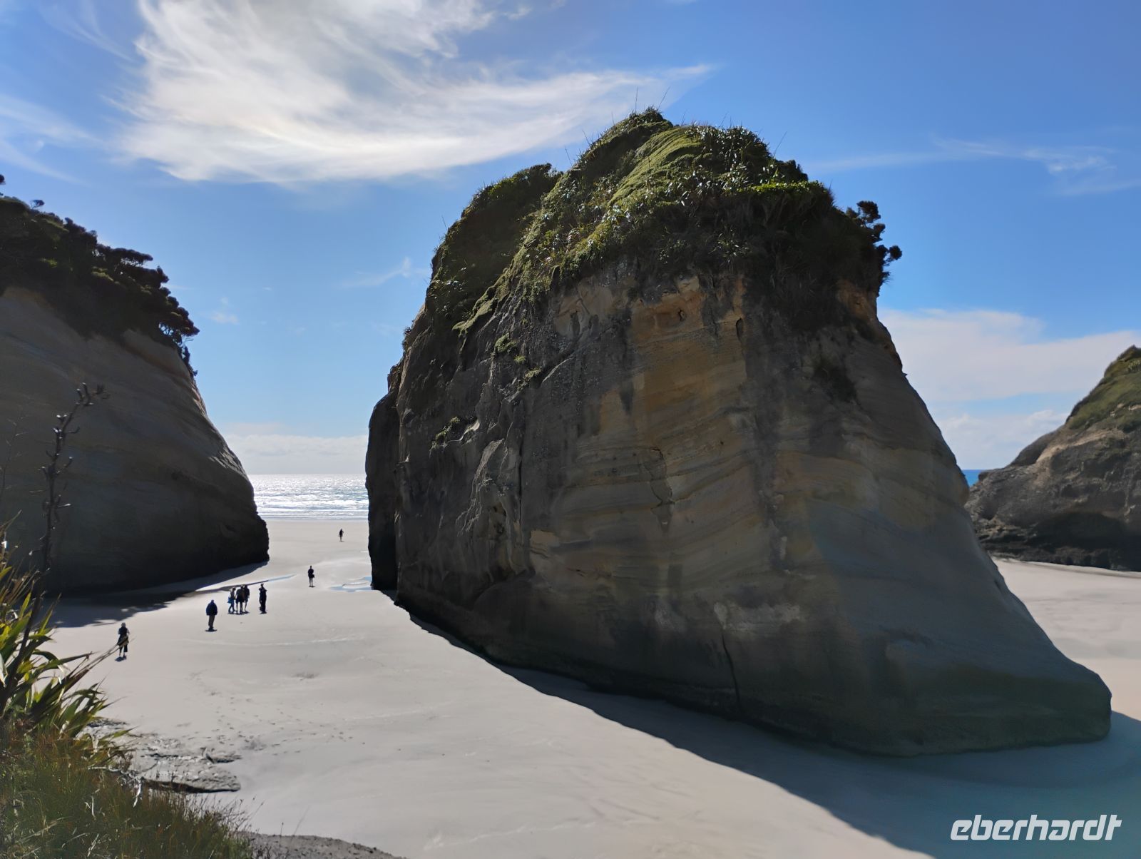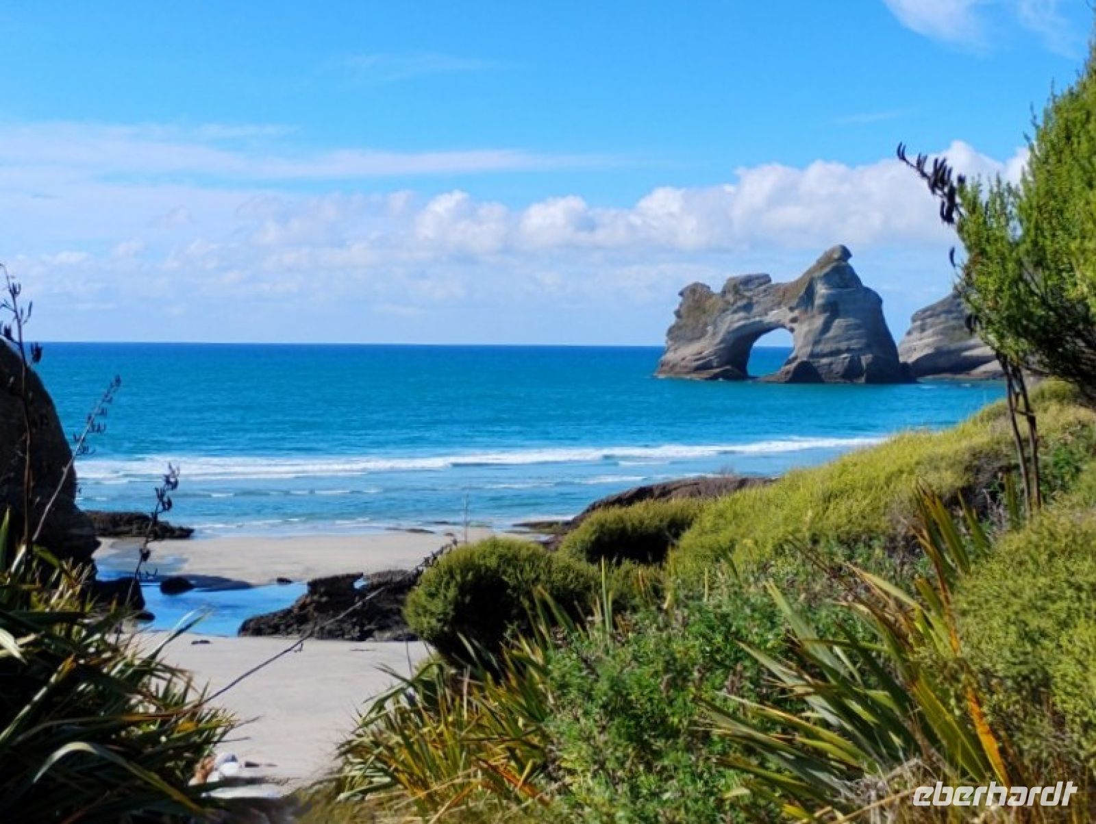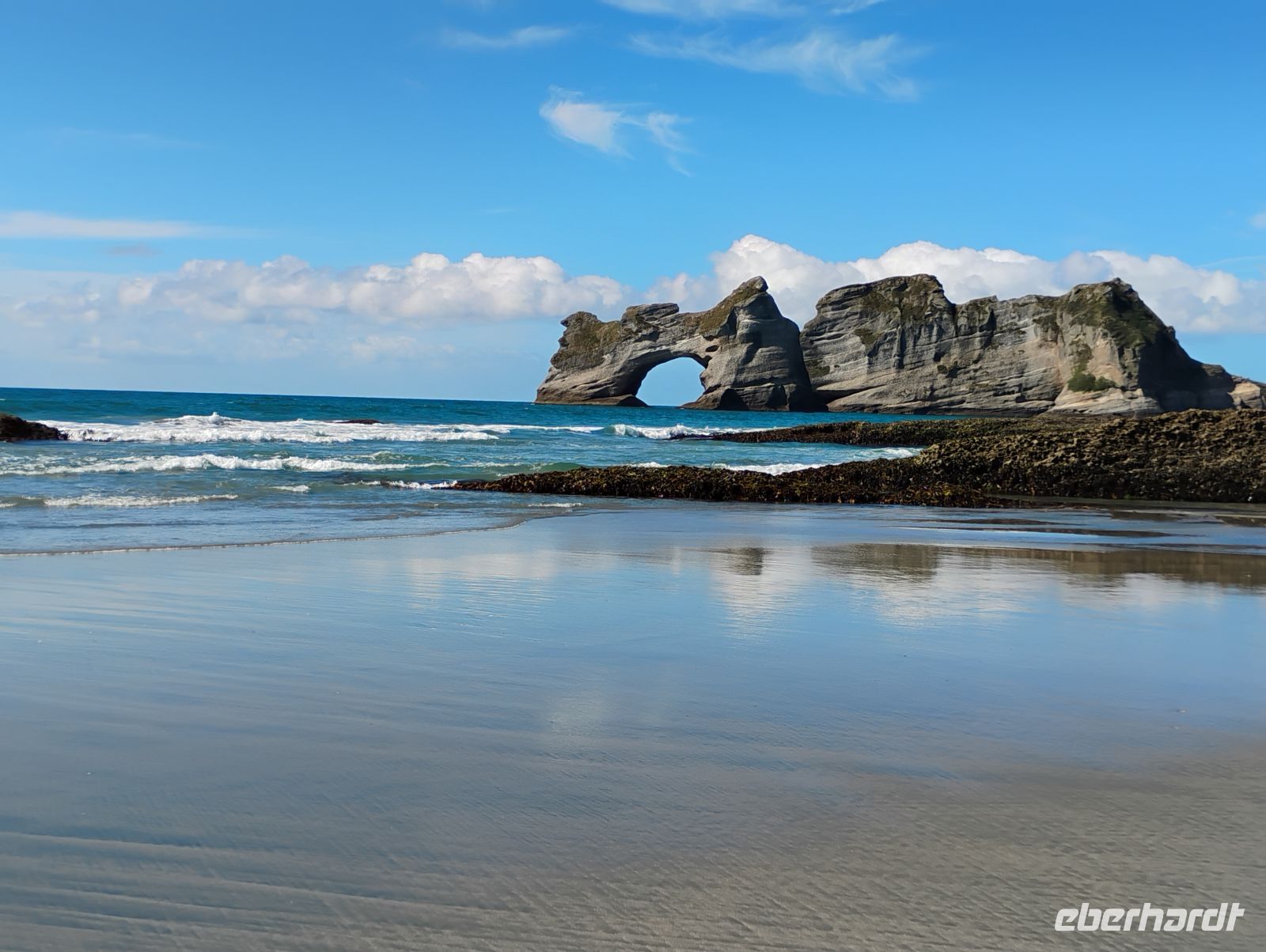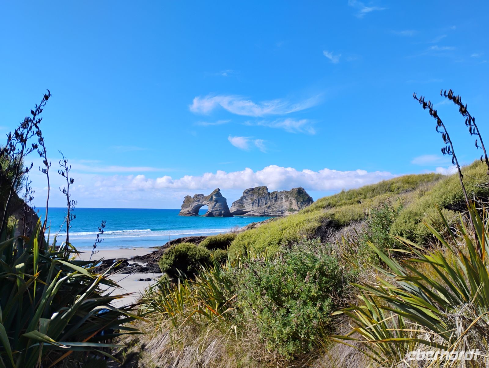 Die Golden Bay hat sich durch ihre abgeschiedene Lage viel Ursprünglichkeit bewahrt. Betrachtet man auf der Landkarte die Bucht zusammen mit der schmalen, sichelförmigen Landzunge des Farewell Spit, erkennt man mit etwas Fantasie die Umrisse eines Kiwis – fast so, als hätte sich Neuseelands Wappenvogel hier selbst verewigt.