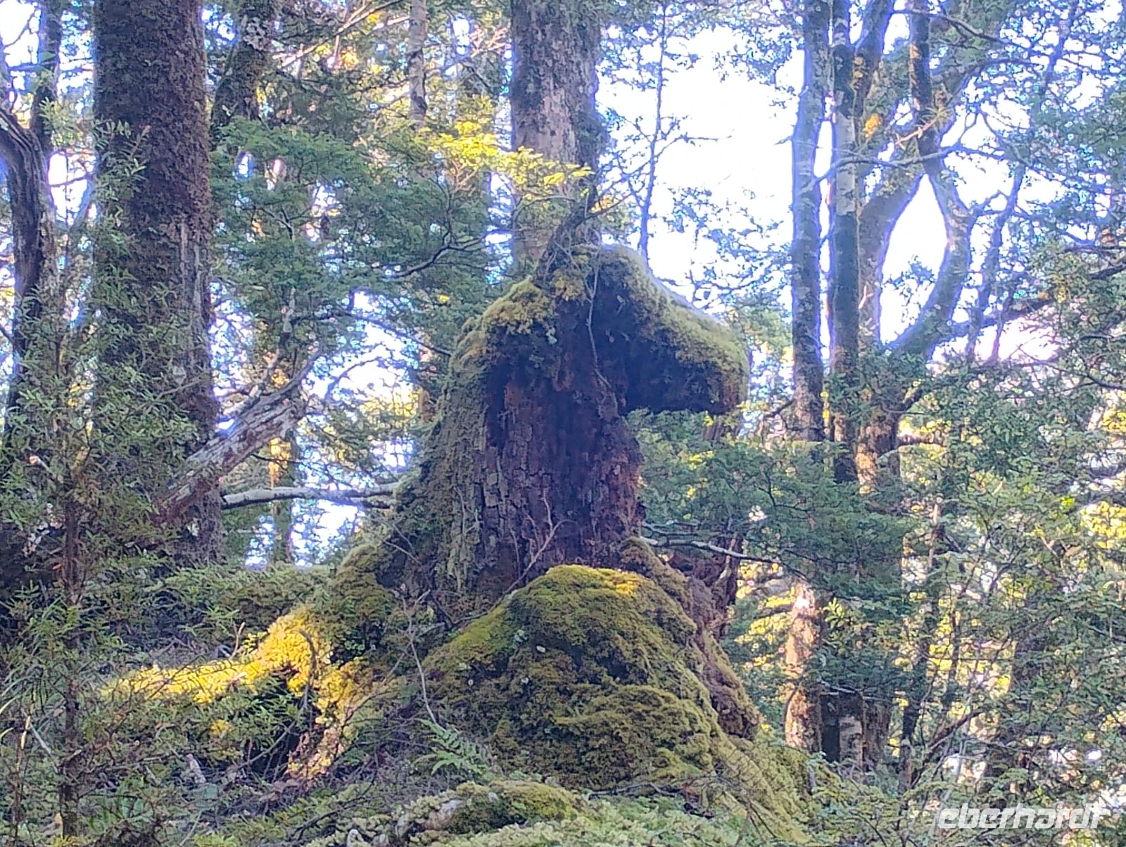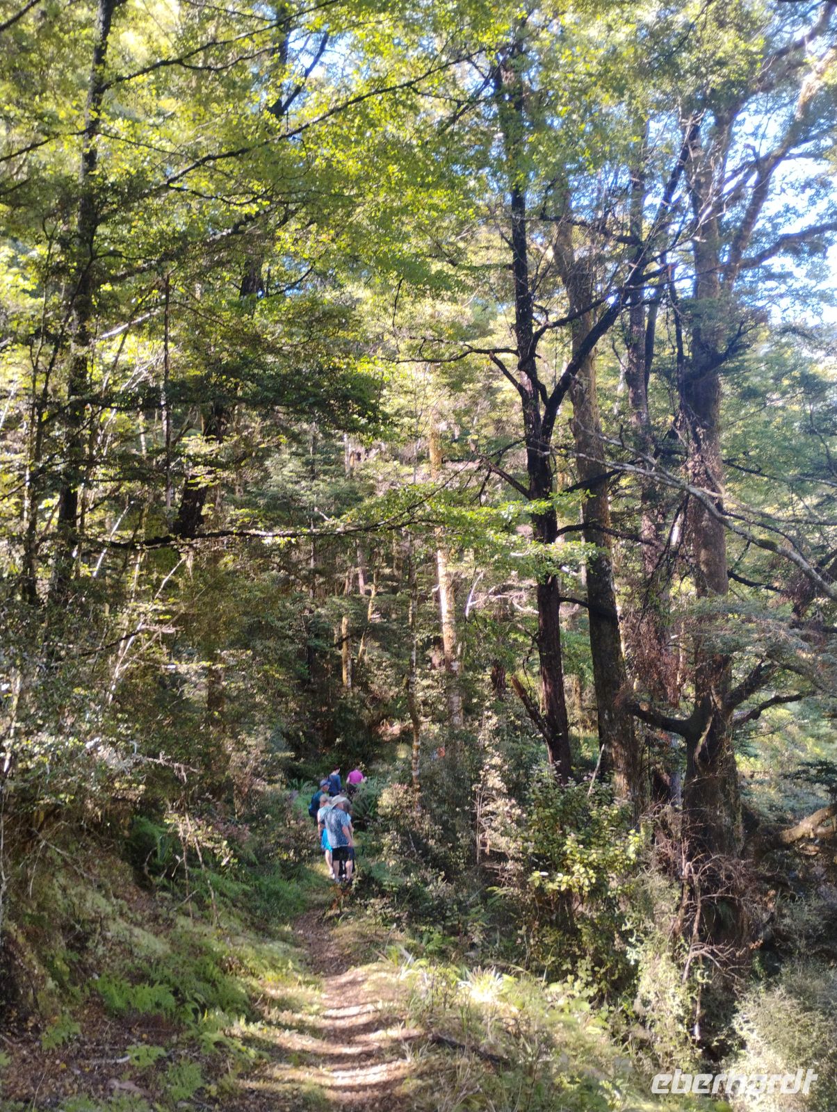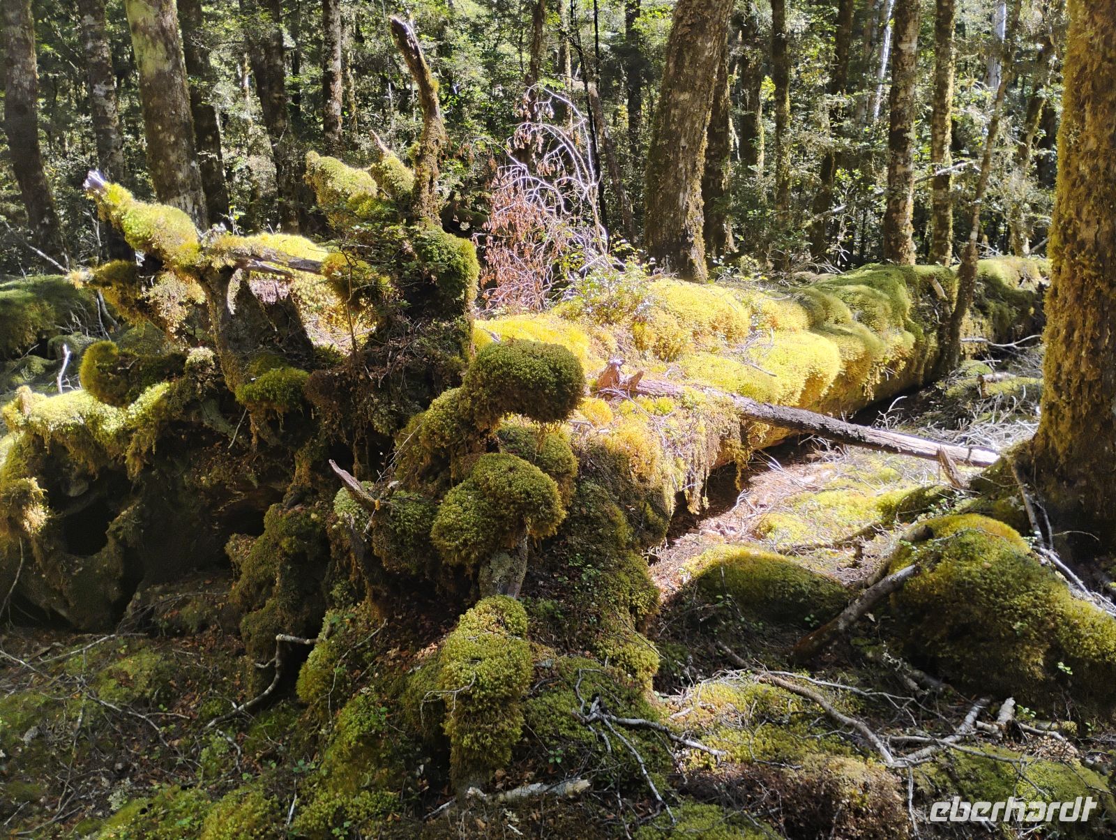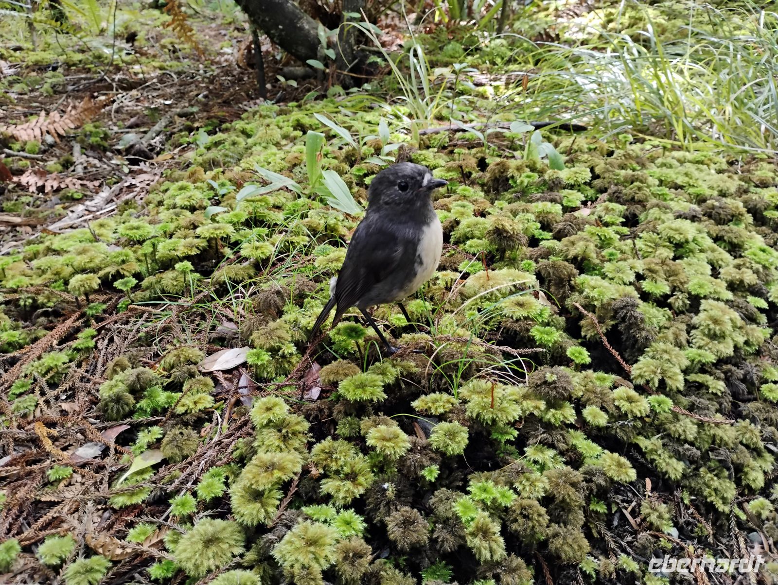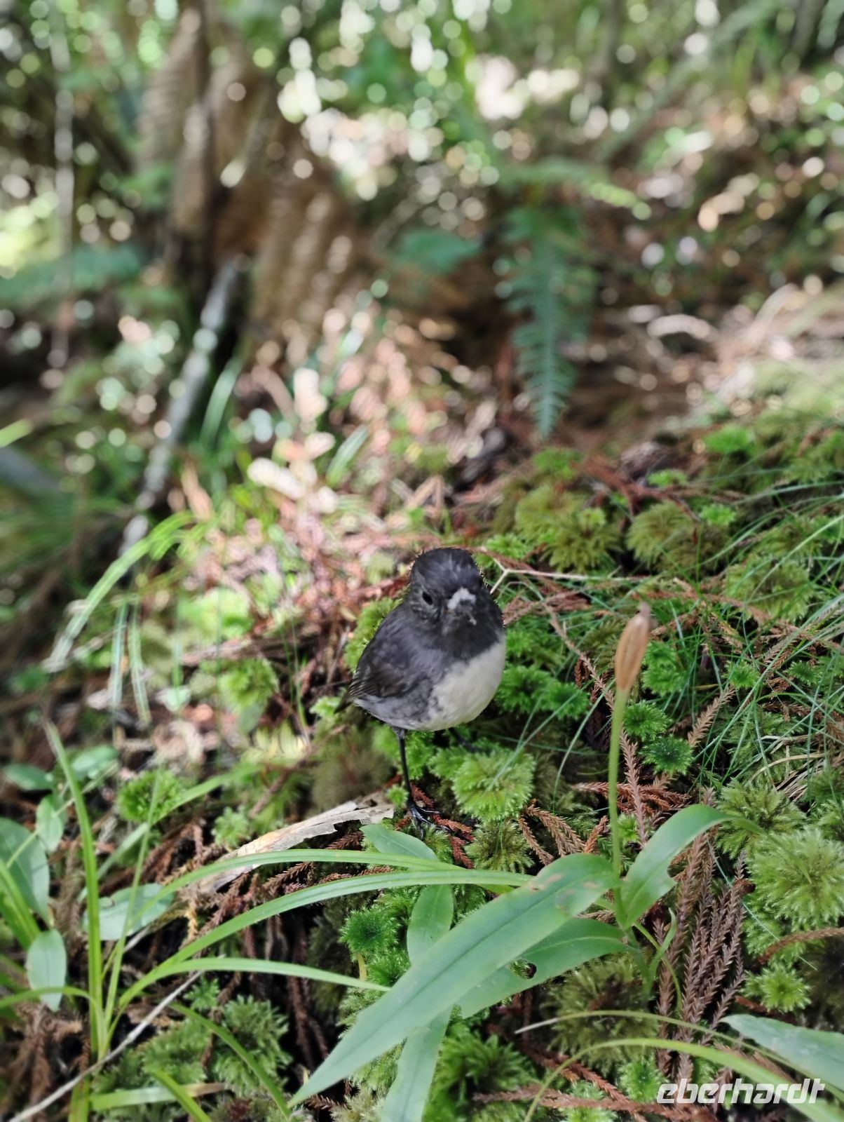 Immer wieder hören wir auch den Saddleback, bekommen ihn jedoch nicht zu Gesicht. Dagegen zeigt sich der neugierige Stewart Island Robin immer wieder, der mit seiner auffälligen hellen Brust gut zu erkennen ist. Der Wald selbst ist beeindruckend alt, viele mächtige Rimu-Bäume wachsen hier noch, weil bereits der frühere Inselbesitzer Charles Traill das Fällen von Bäumen untersagte und sich für den Schutz des Waldes einsetzte.