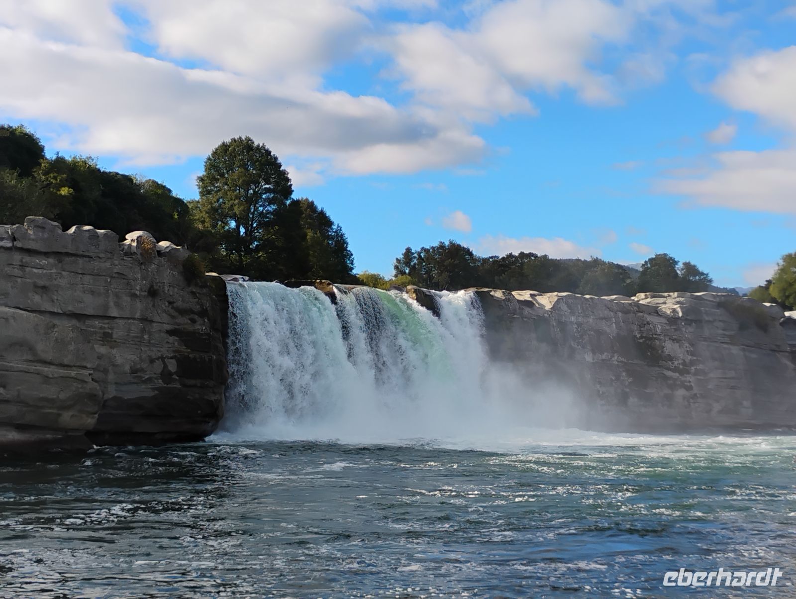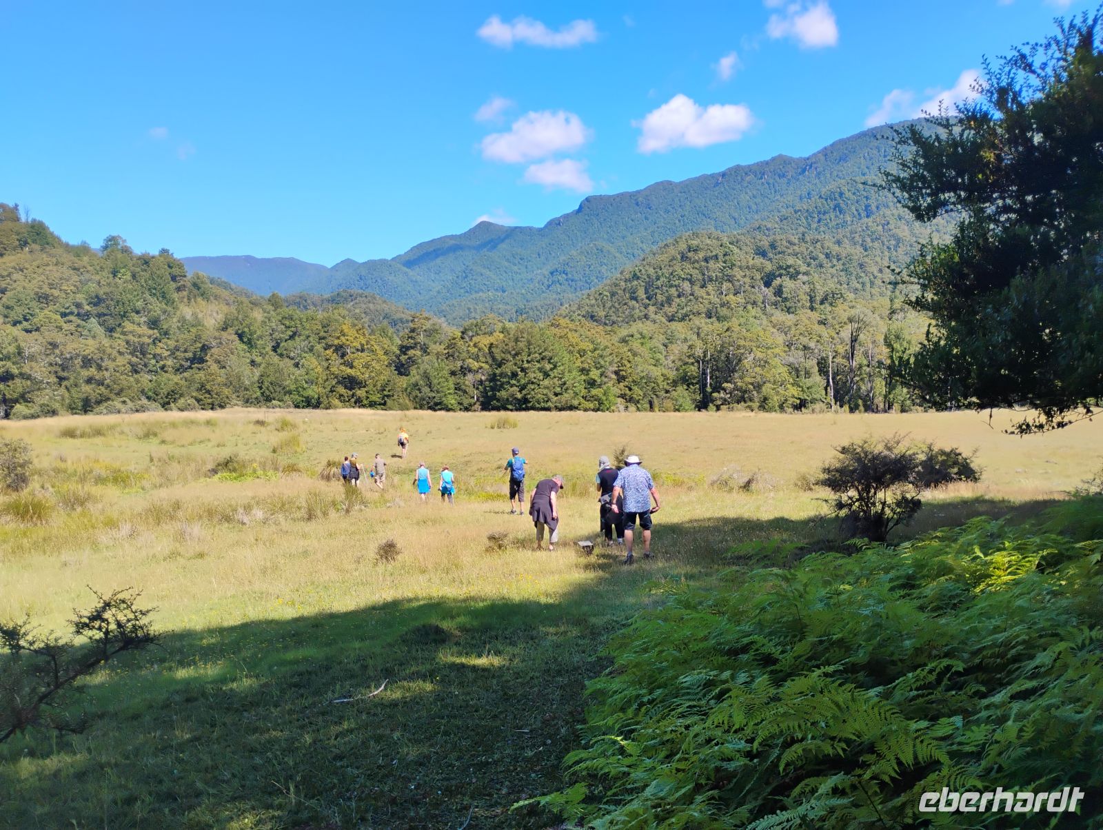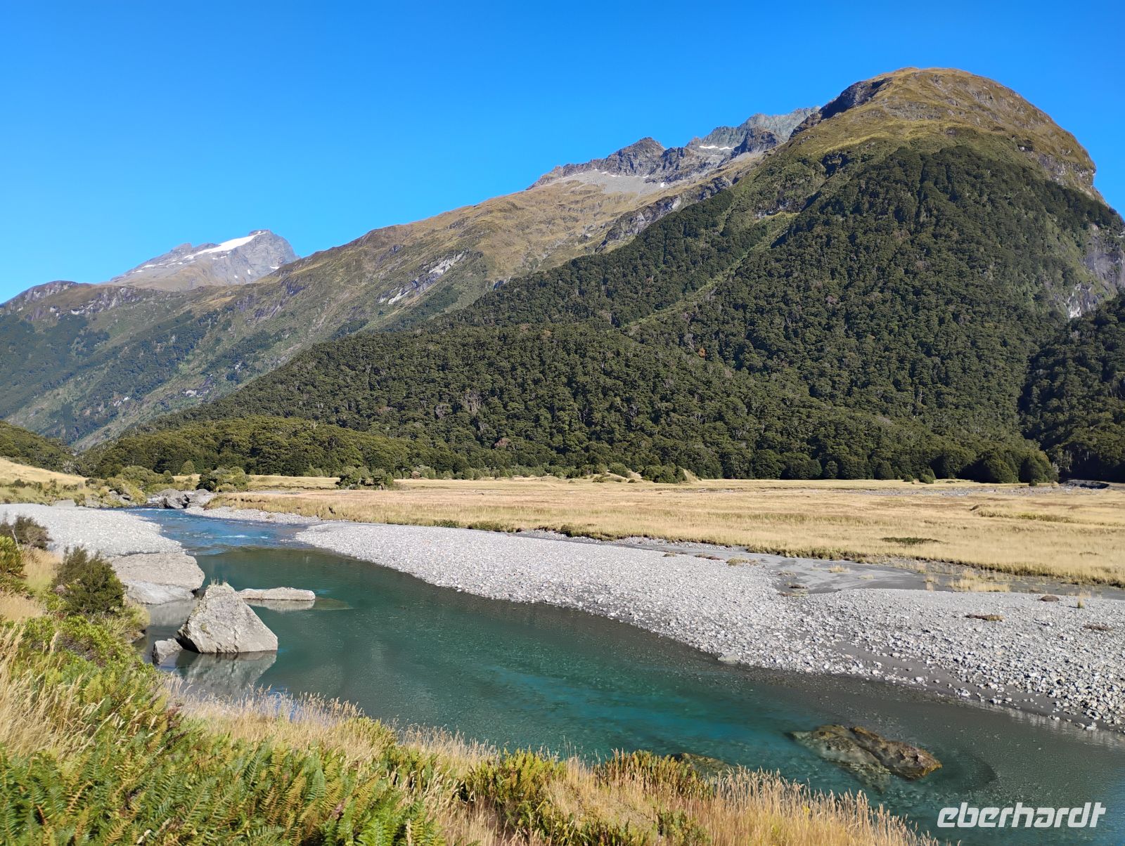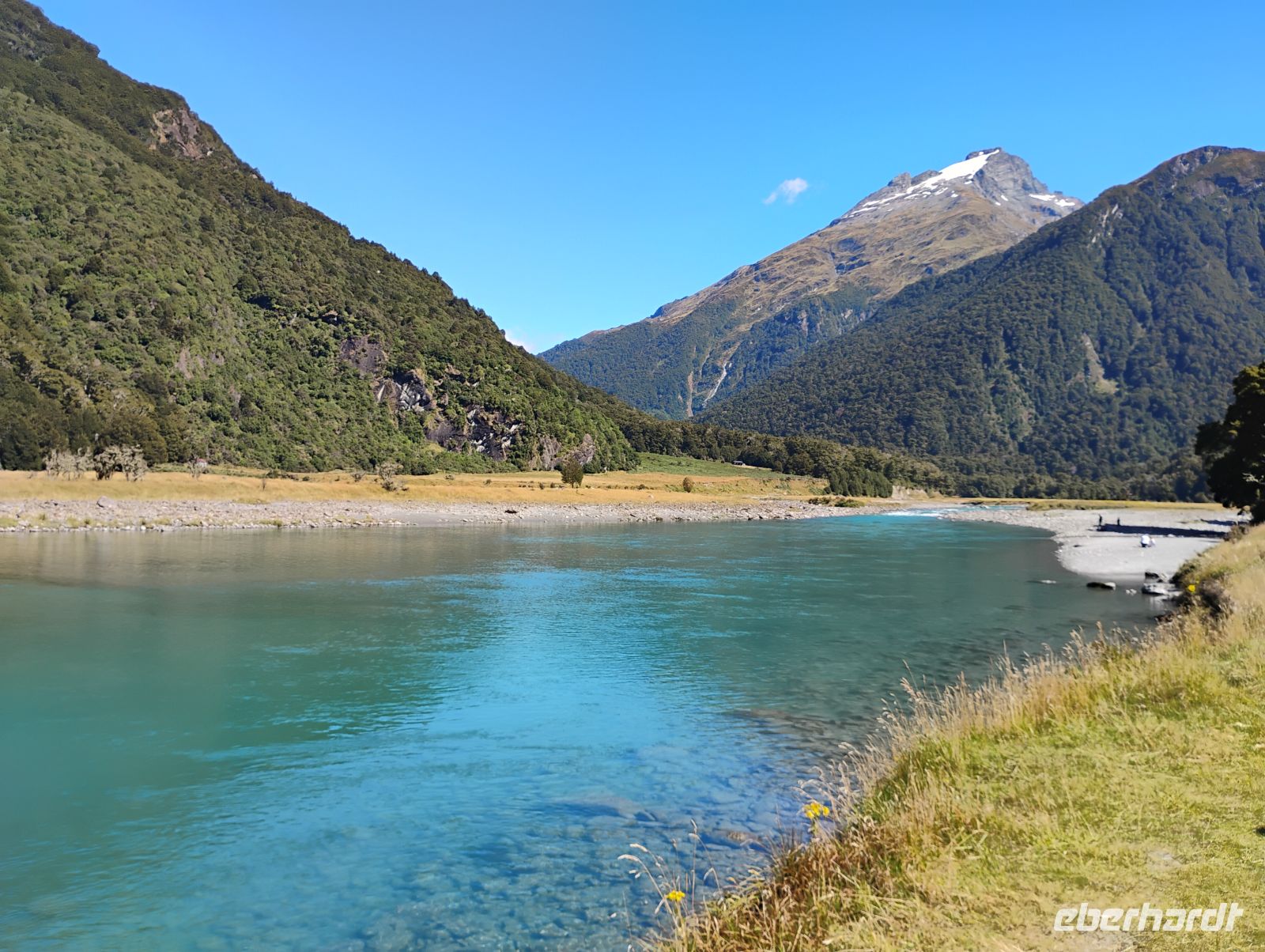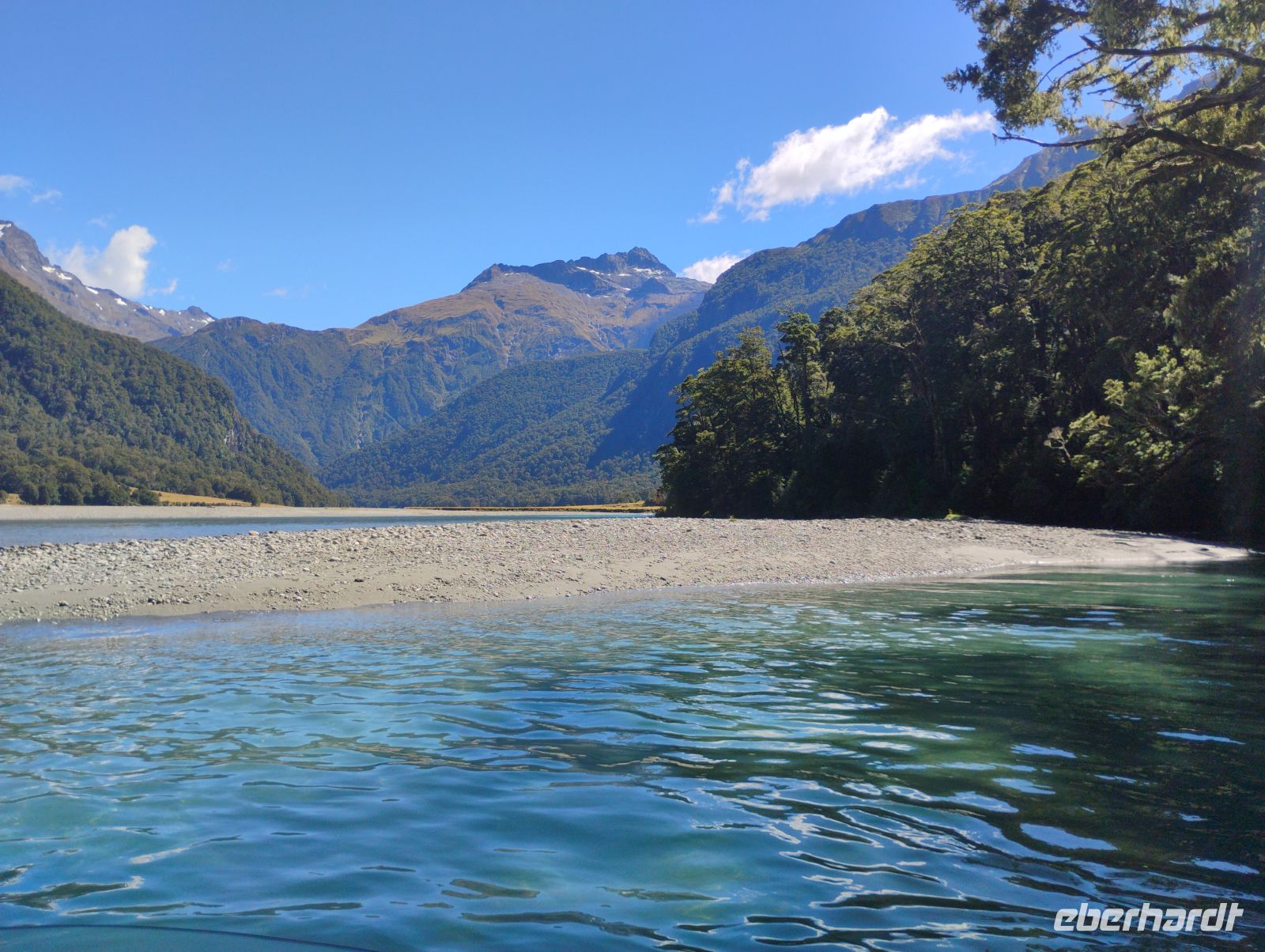 Nach einigen Stunden erreichen wir schließlich den Treffpunkt am Wilkin River. Dort warten wir auf das Schnellboot, sehr zur Freude der zahlreichen Sandflies, die uns sofort entdecken. Nach einer kurzen Einweisung und mit Schwimmwesten ausgestattet geht es anschließend auf eine rasante Fahrt flussabwärts. Das schnelle Boot gleitet in hohem Tempo über das türkisfarbene Wasser - ein echtes neuseeländisches Abenteuer.
