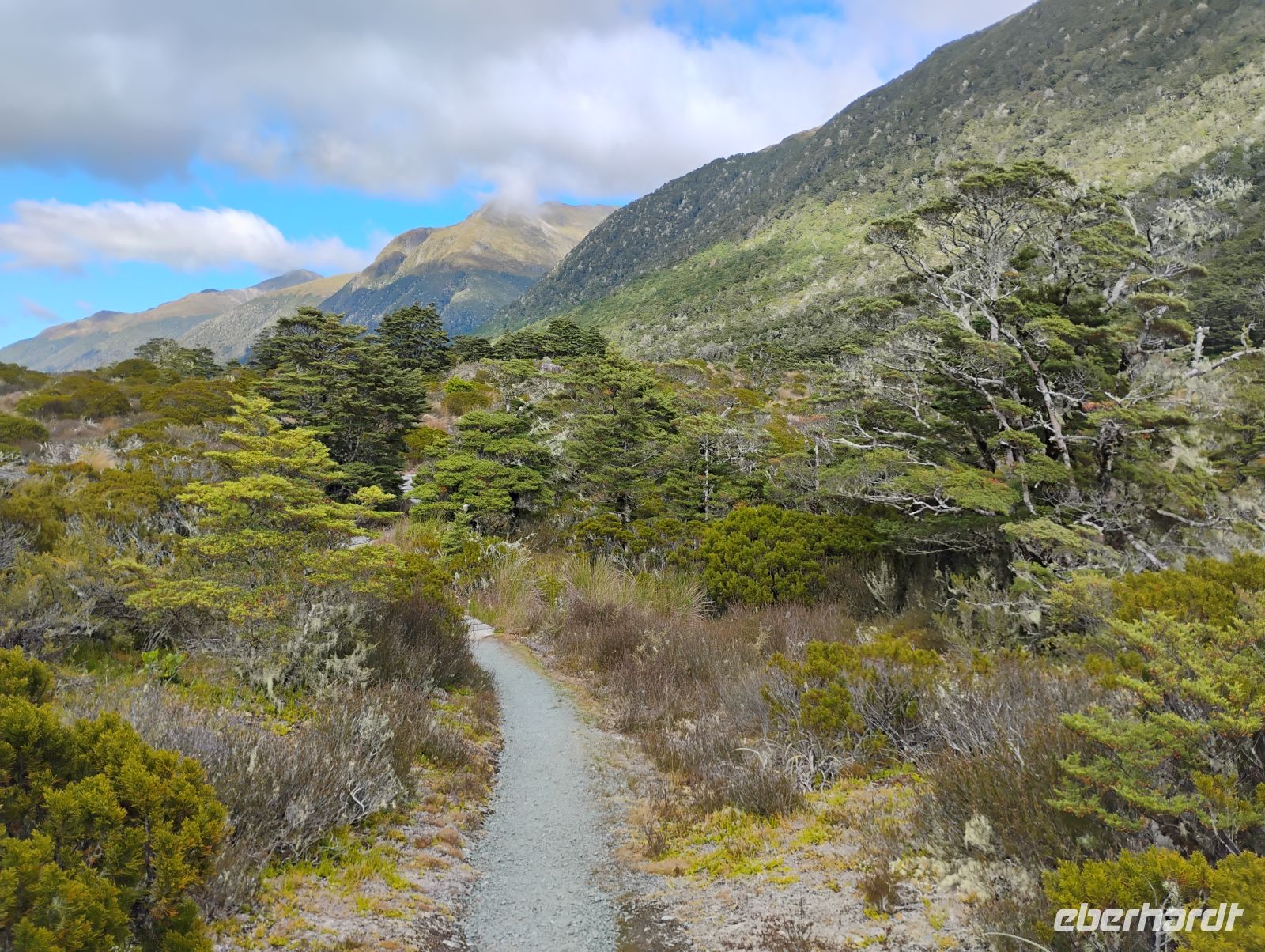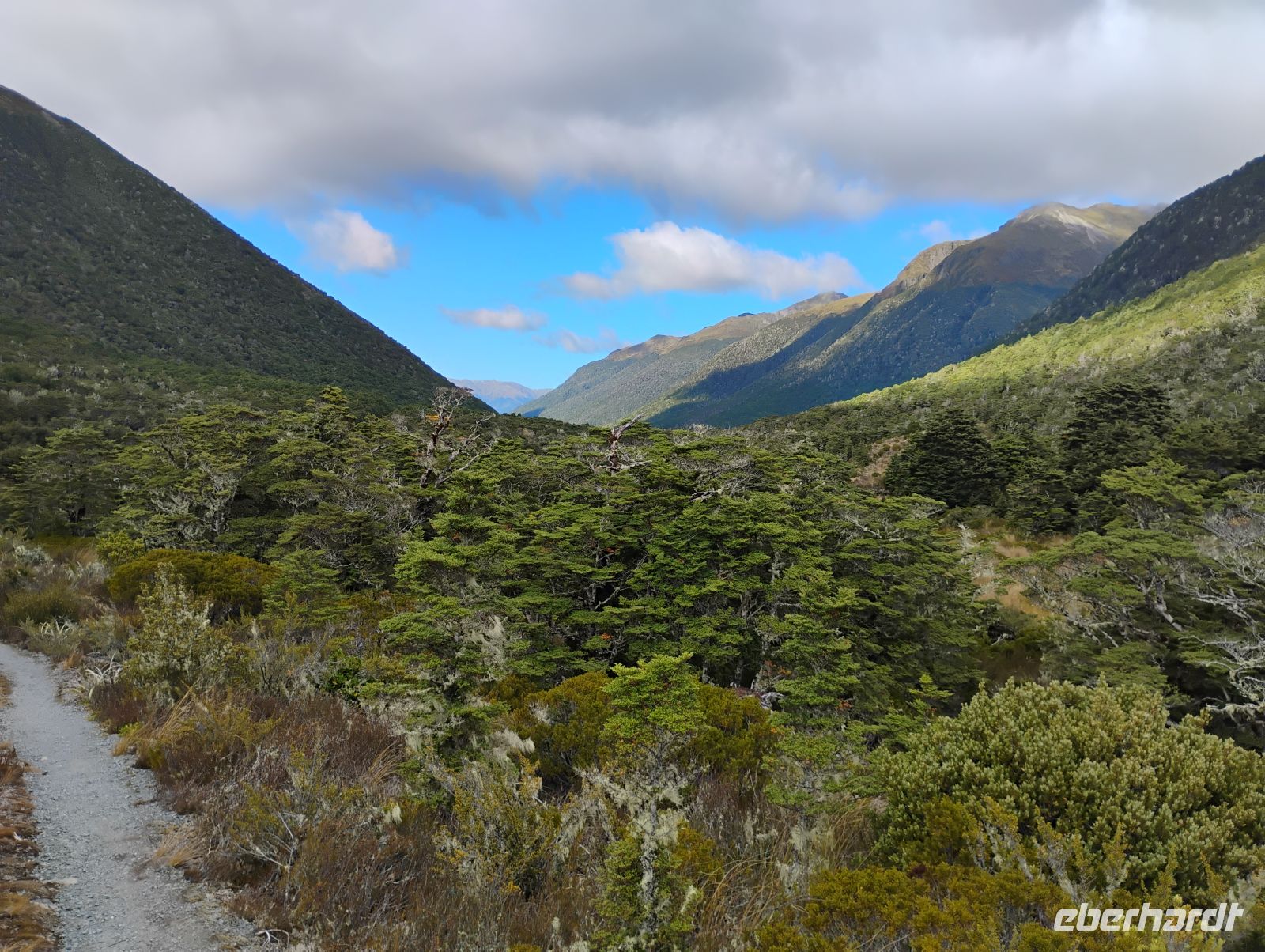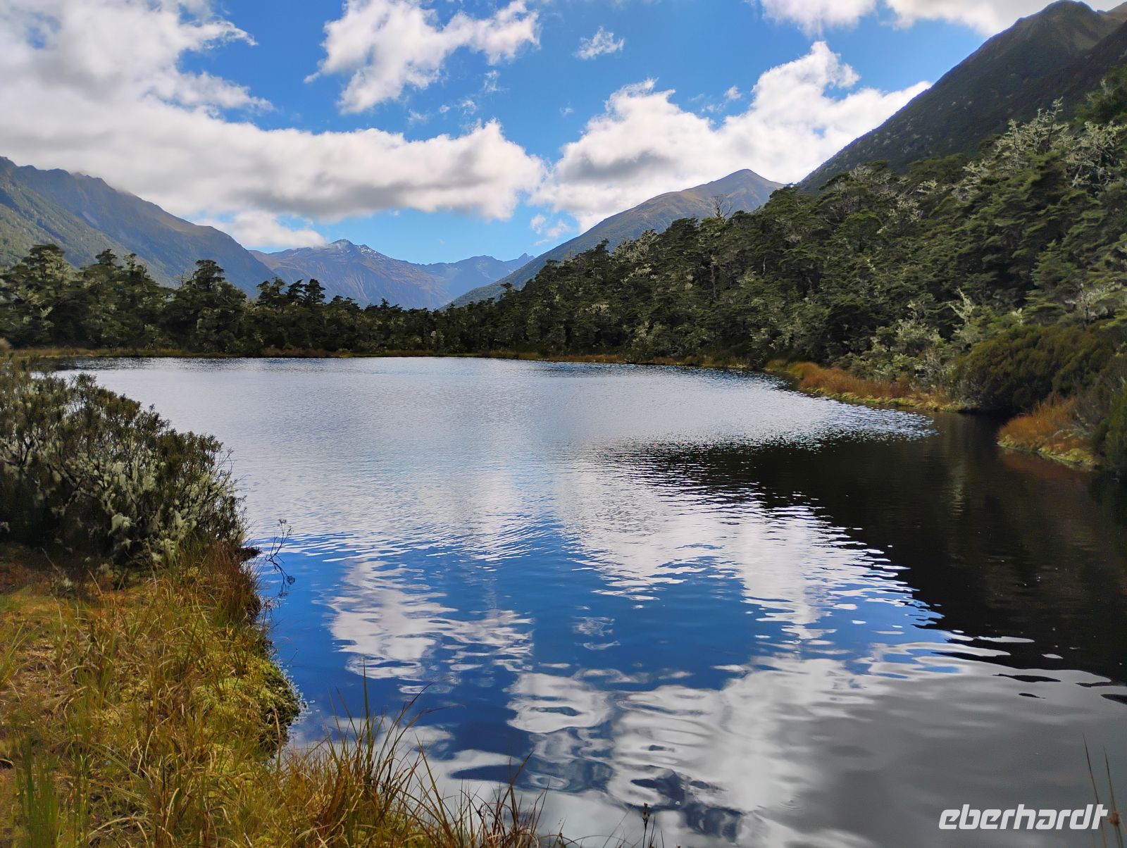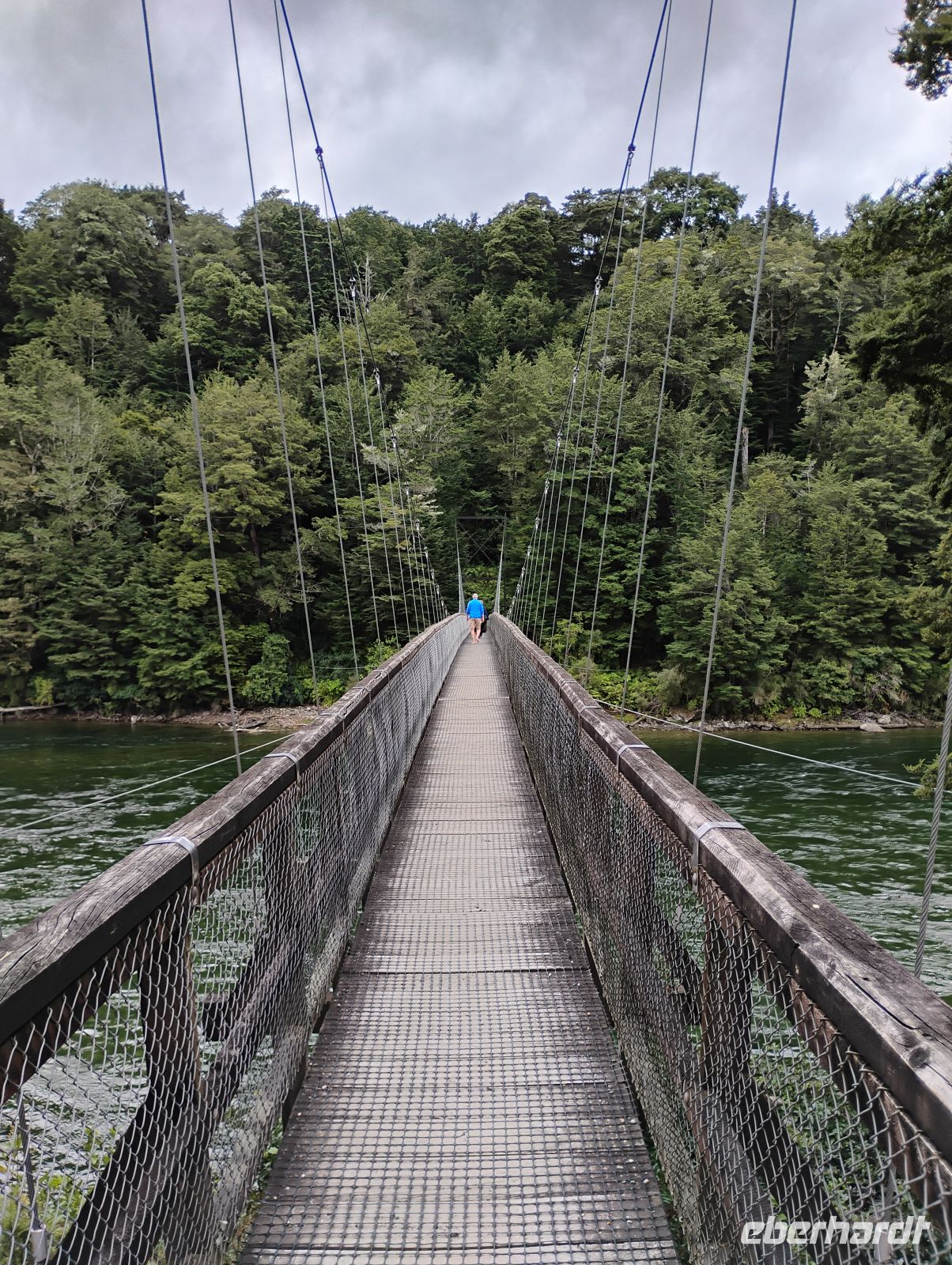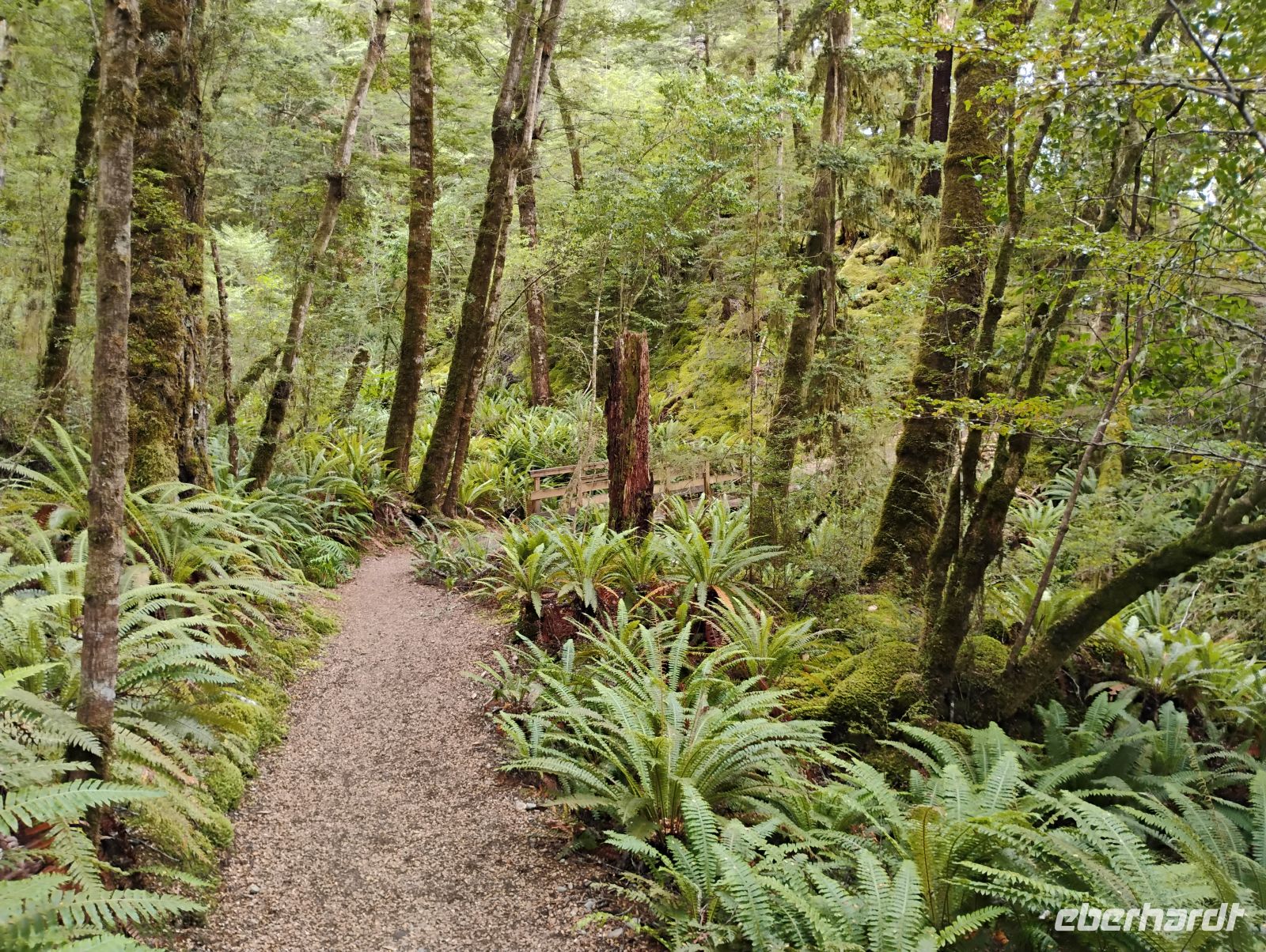Die Fahrt führt weiter ins Landesinnere bis zum Rainbow Reach im Gebiet des Kepler Track, einem der berühmten „Great Walks“ Neuseelands. Eine Hängebrücke überspannt hier den Waiau River und markiert einen Zugang zum Wanderweg. Der Kepler Track wurde in den 1980er-Jahren als Rundwanderung angelegt und führt durch dichten Buchenwald, über alpine Höhen und entlang von Seen – normalerweise ein mehrtägiges Trekking. Wir unternehmen hier einen gemütlichen Spaziergang durch den moosreichen Wald, jeder in seinem eigenen Tempo.