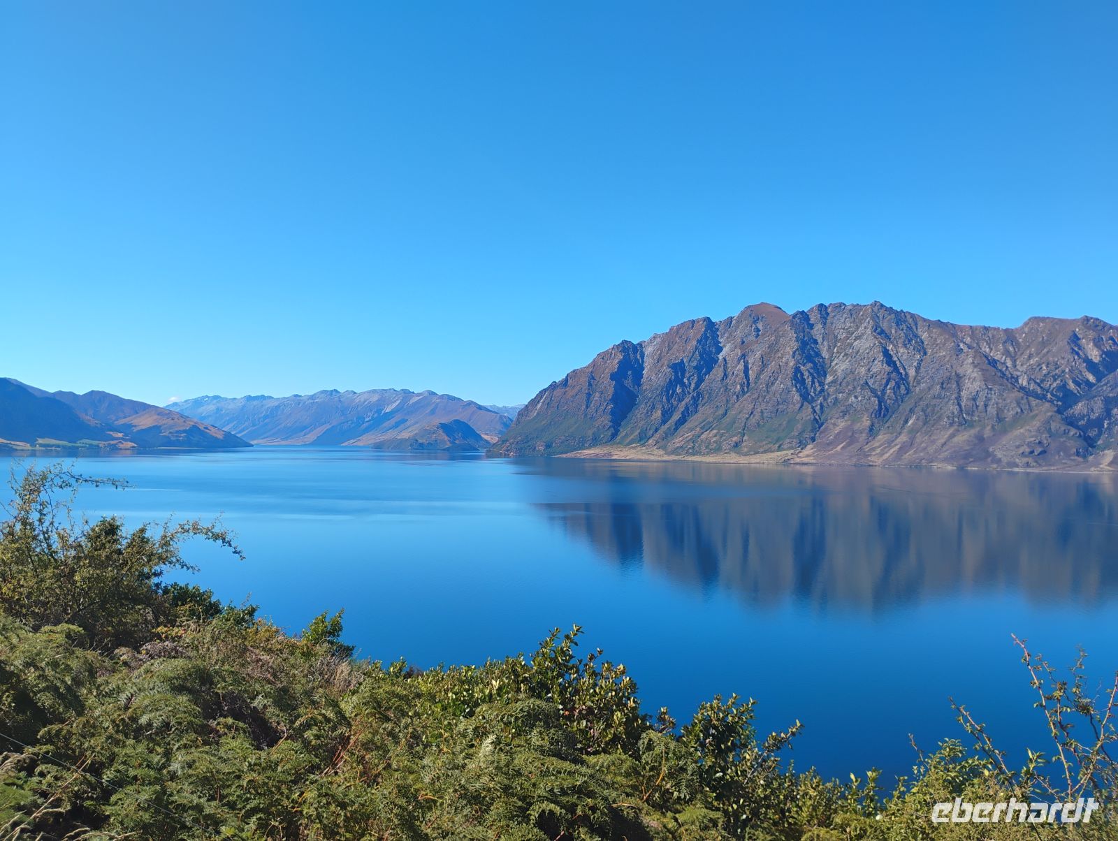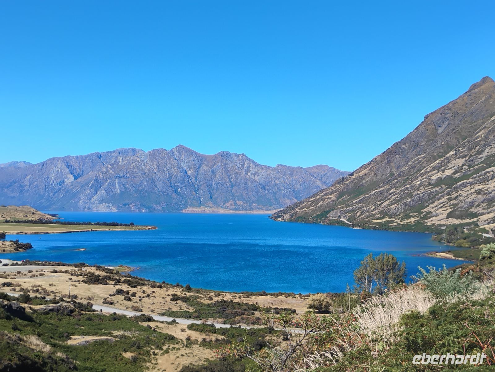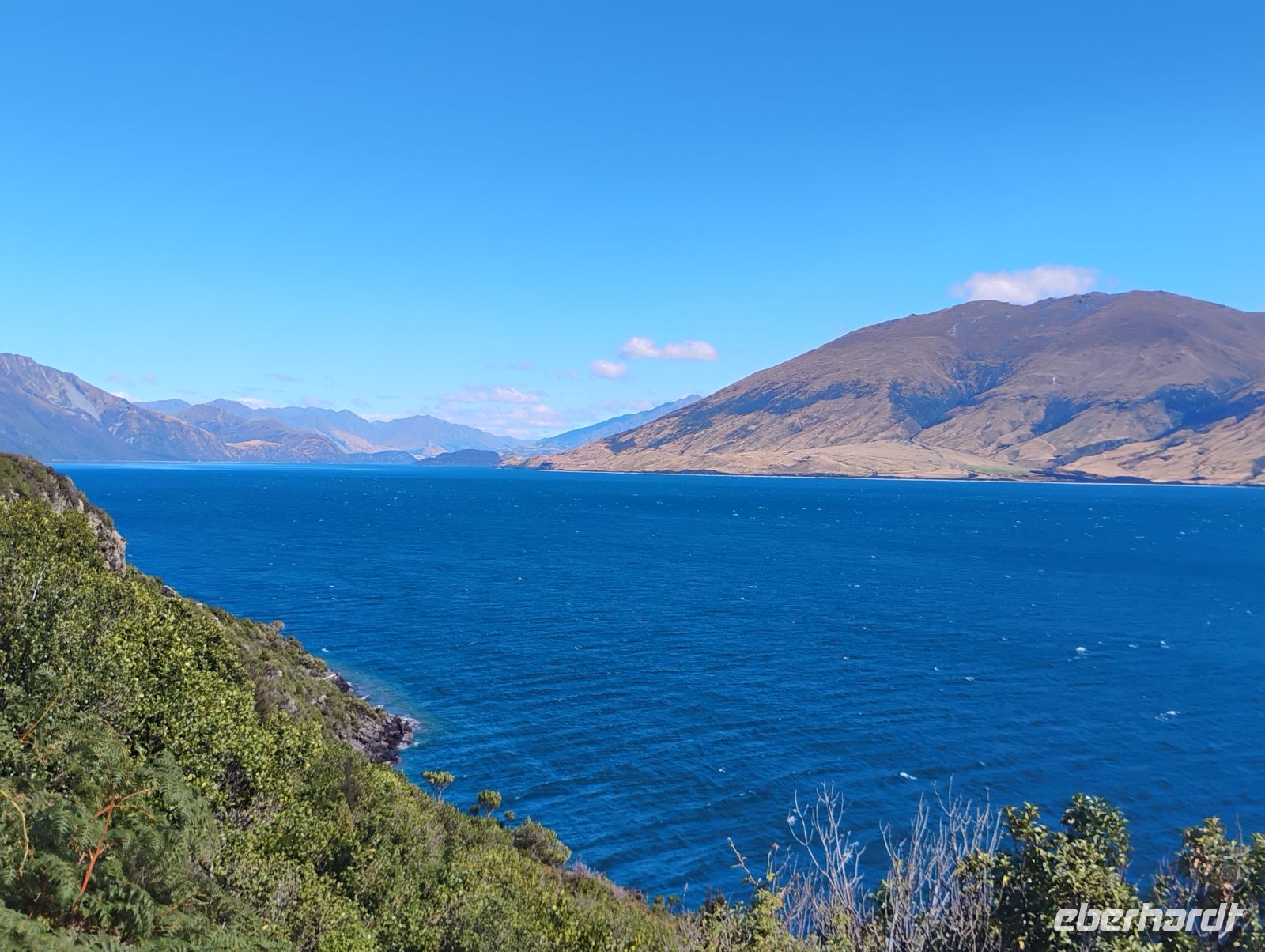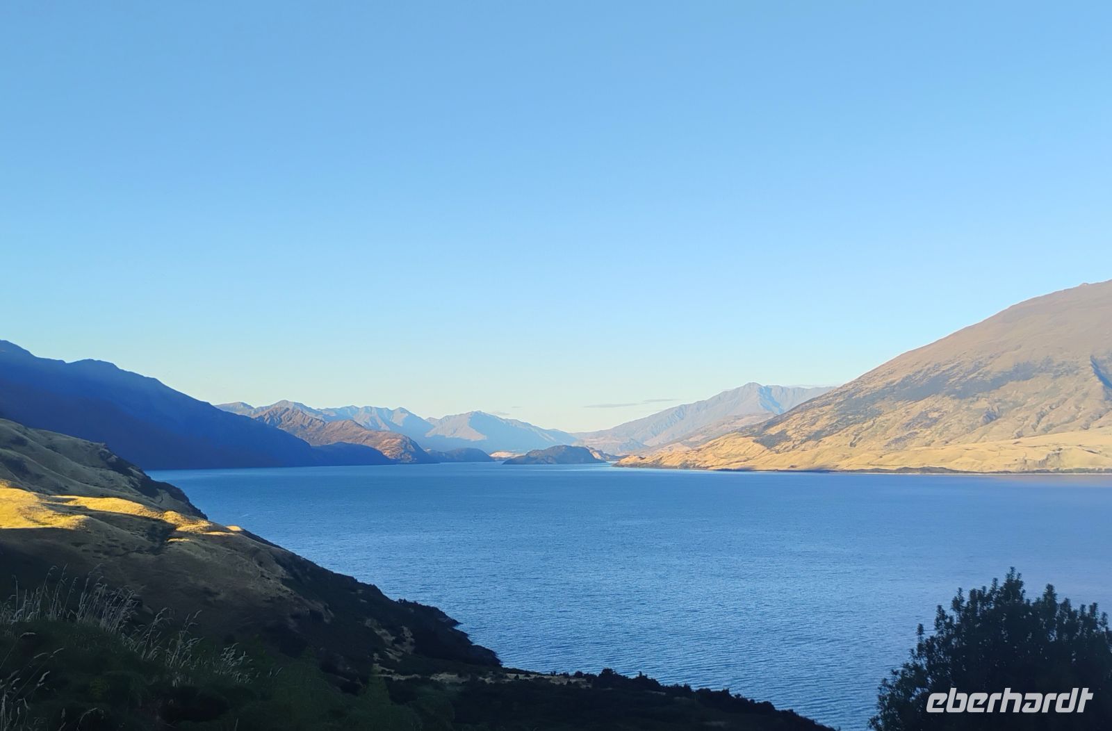 Am Morgen starten wir bei strahlendem Sonnenschein in den Tag. Kein Wölkchen steht am Himmel, als wir Wānaka verlassen und entlang der Seenlandschaft Richtung Norden fahren. Zunächst begleitet uns der Lake Hāwea, später der Lake Wānaka. Die Straße führt durch eine beeindruckende Berglandschaft bis nach Makarora, einem kleinen Ort am Rand des Mount Aspiring Nationalparks.