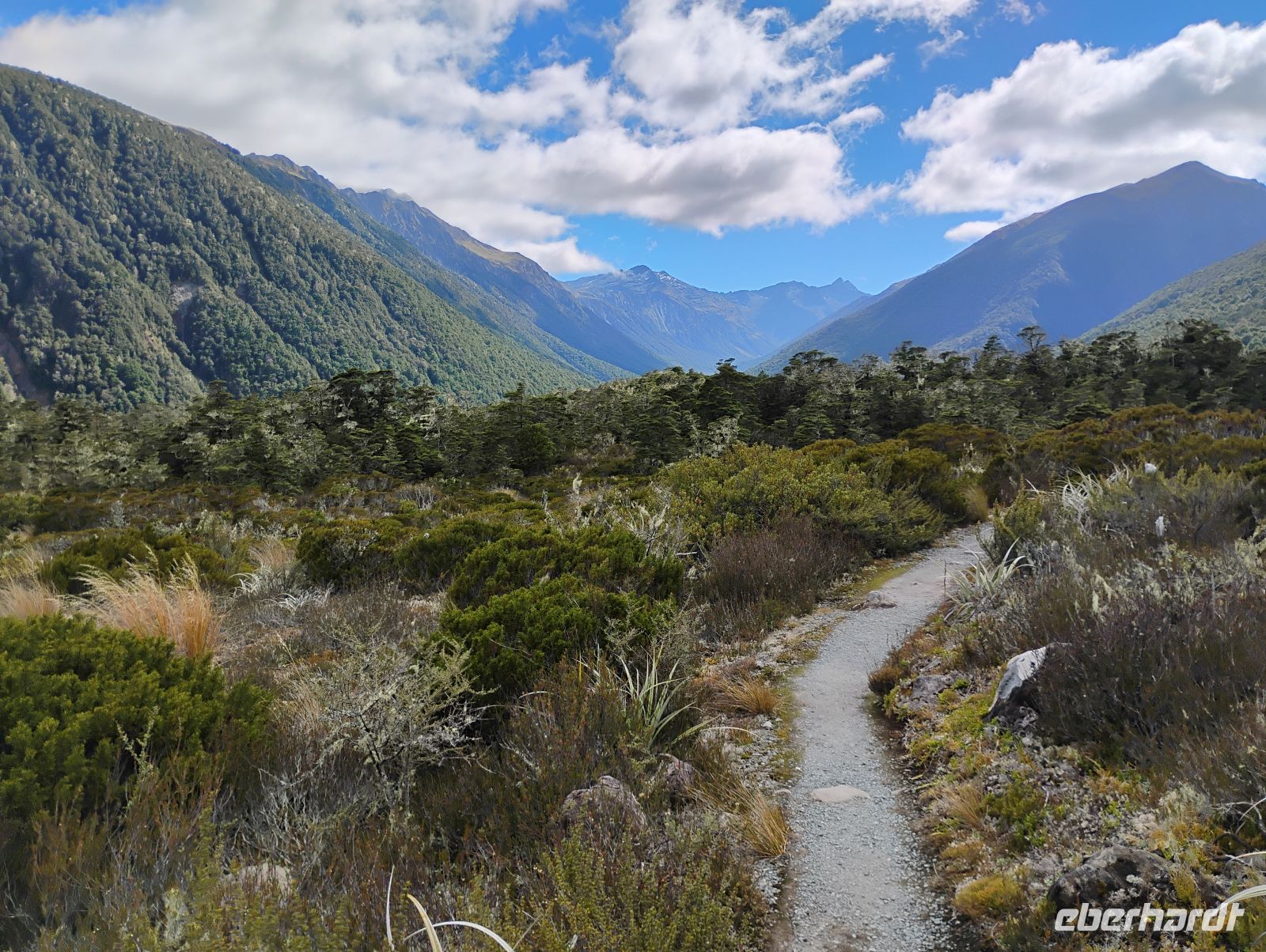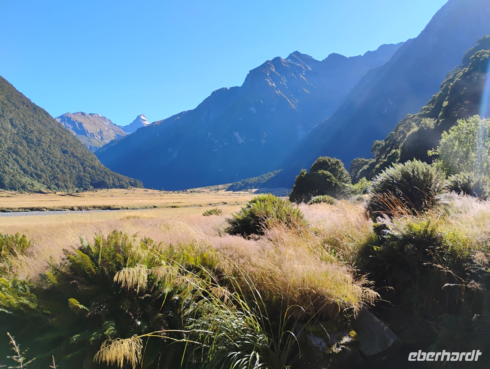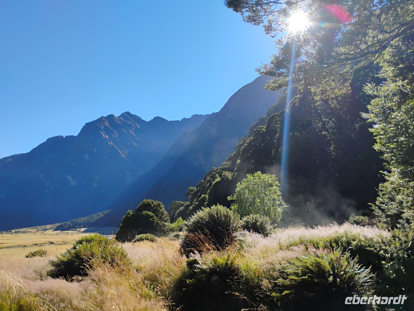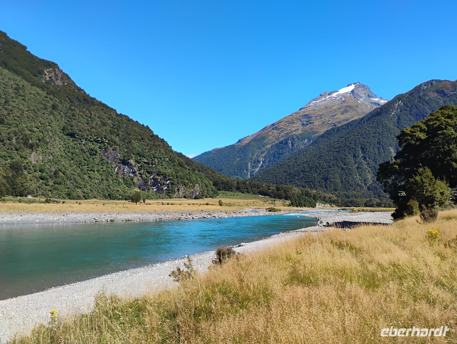 Am Morgen starten wir bei strahlendem Sonnenschein in den Tag. Kein Wölkchen steht am Himmel, als wir Wānaka verlassen und entlang der Seenlandschaft Richtung Norden fahren. Zunächst begleitet uns der Lake Hāwea, später der Lake Wānaka. Die Straße führt durch eine beeindruckende Berglandschaft bis nach Makarora, einem kleinen Ort am Rand des Mount Aspiring Nationalparks.