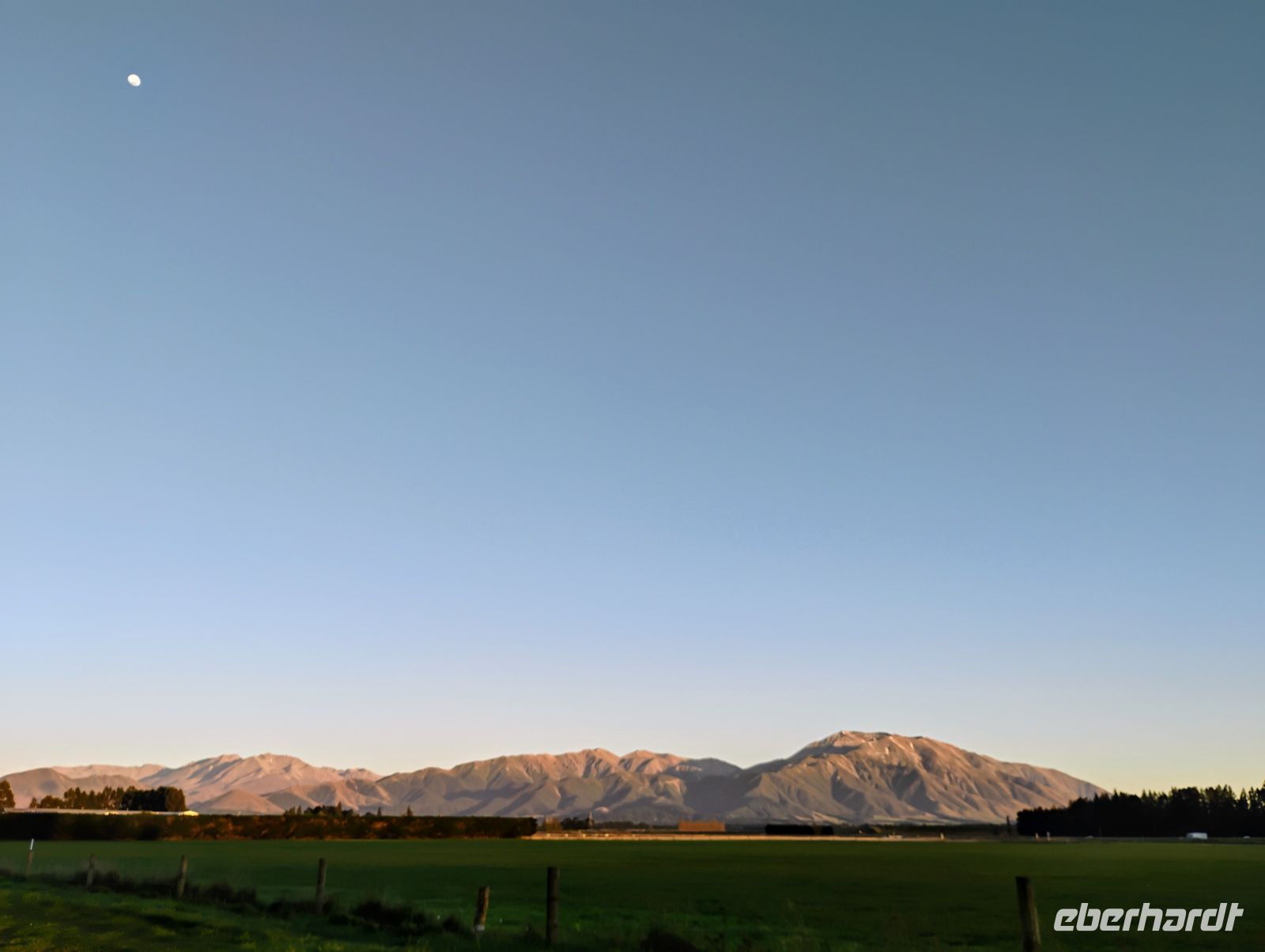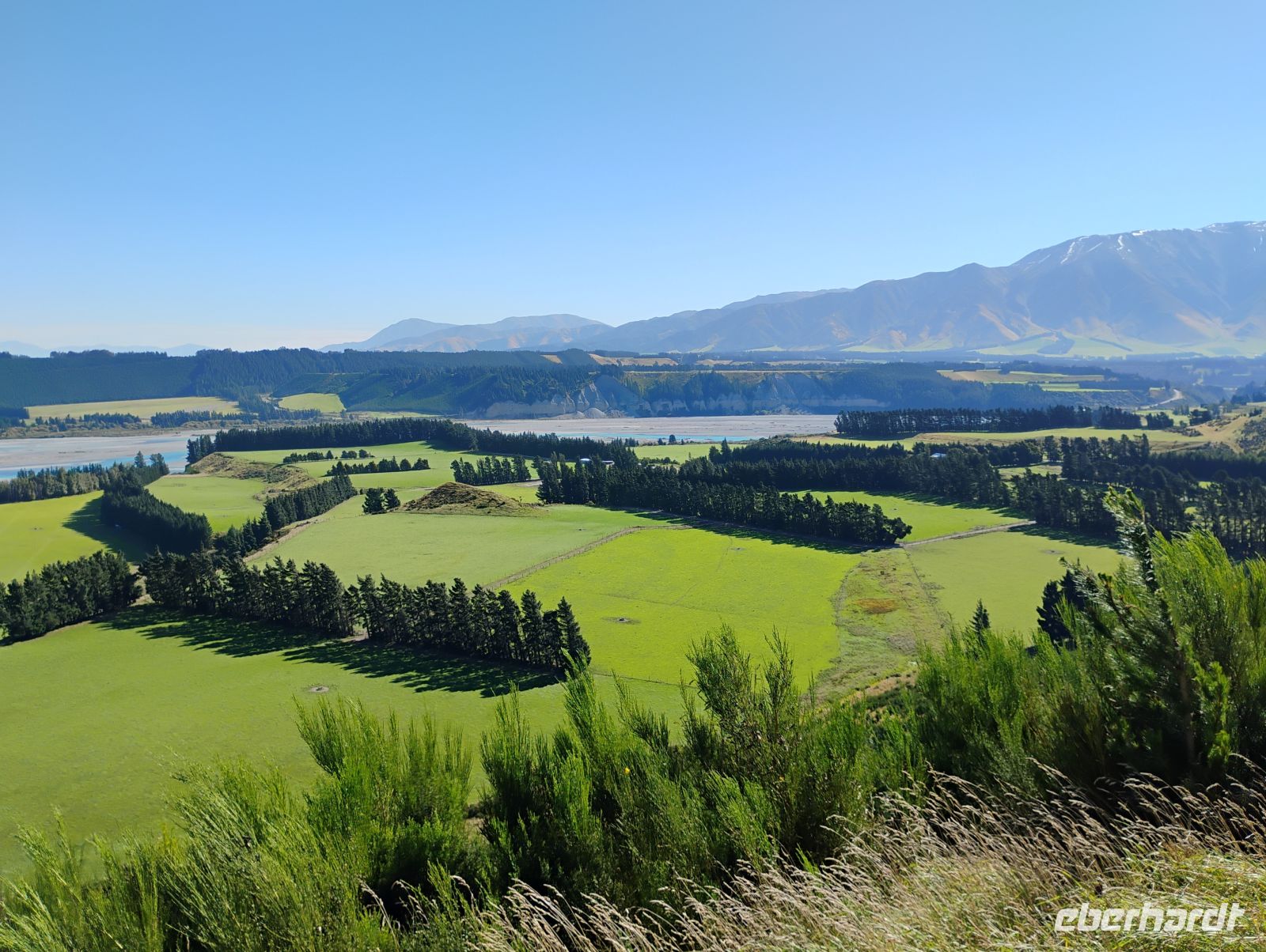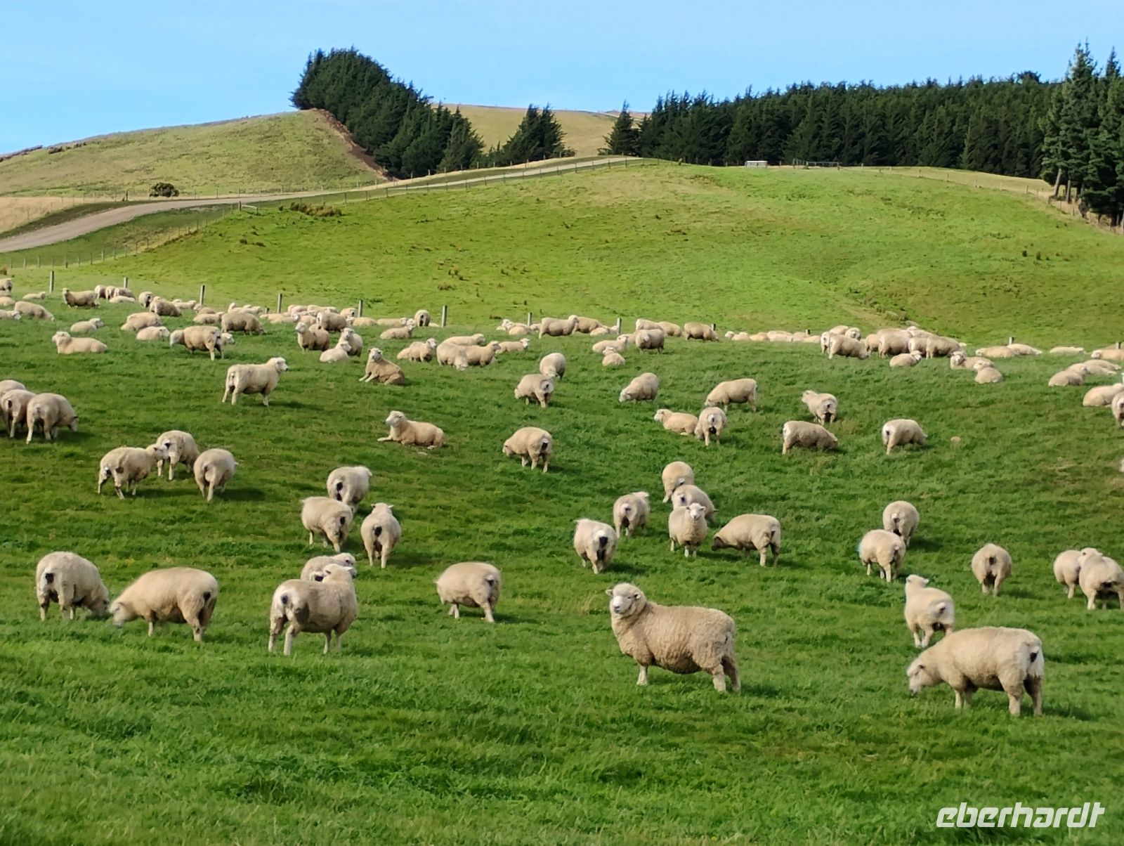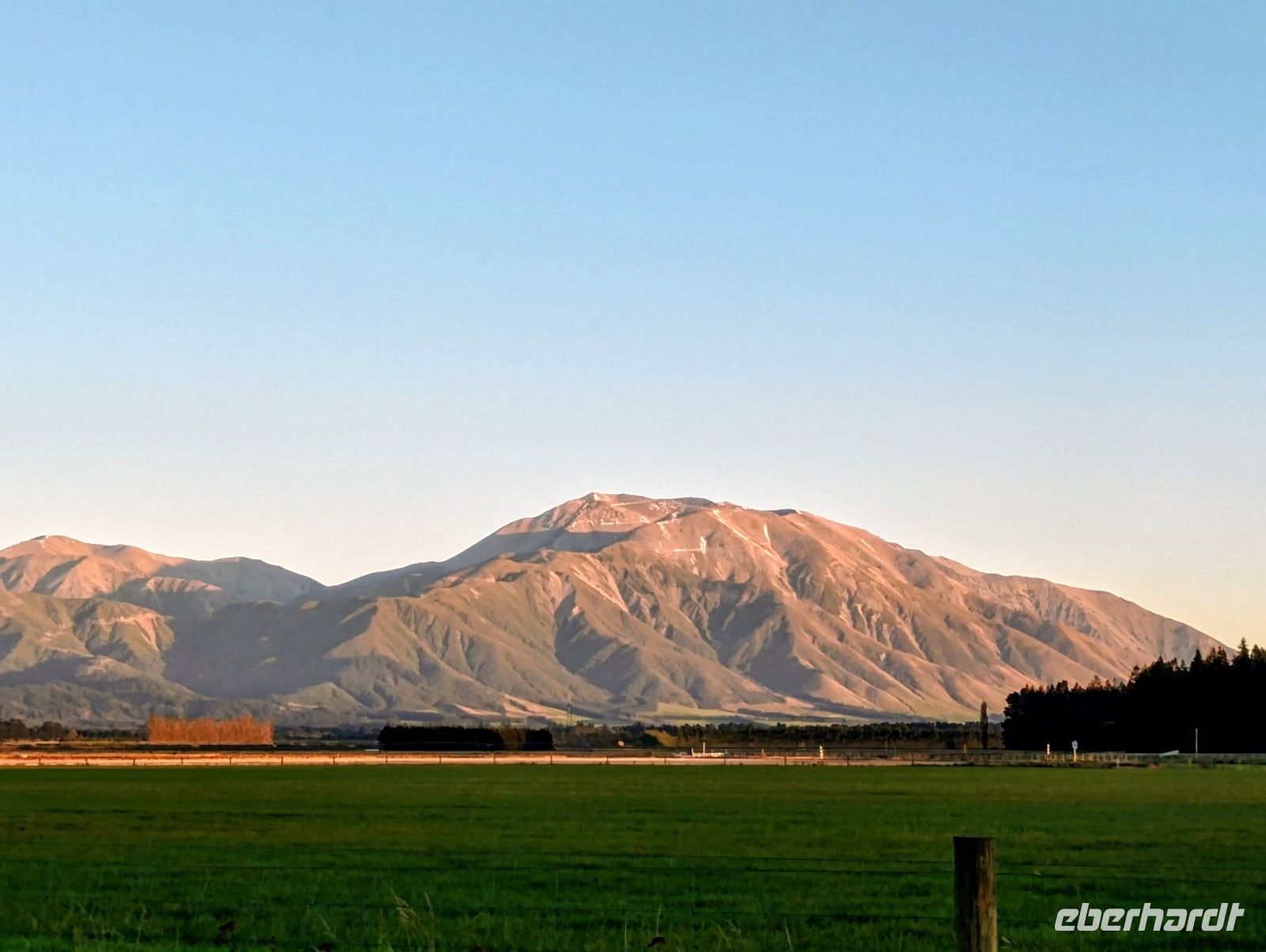 Unsere Fahrt führt anschließend durch das weite Mackenzie Basin, auch bekannt als „Merino Country“. In dieser eher kargen Region wird seit Generationen Schafzucht betrieben, insbesondere die feinen Merinoschafe fühlen sich hier wohl. Gleichzeitig sieht man immer wieder große Bewässerungsanlagen – sie ermöglichen heute auch intensive Landwirtschaft, vor allem für die Milchwirtschaft mit großen Herden.