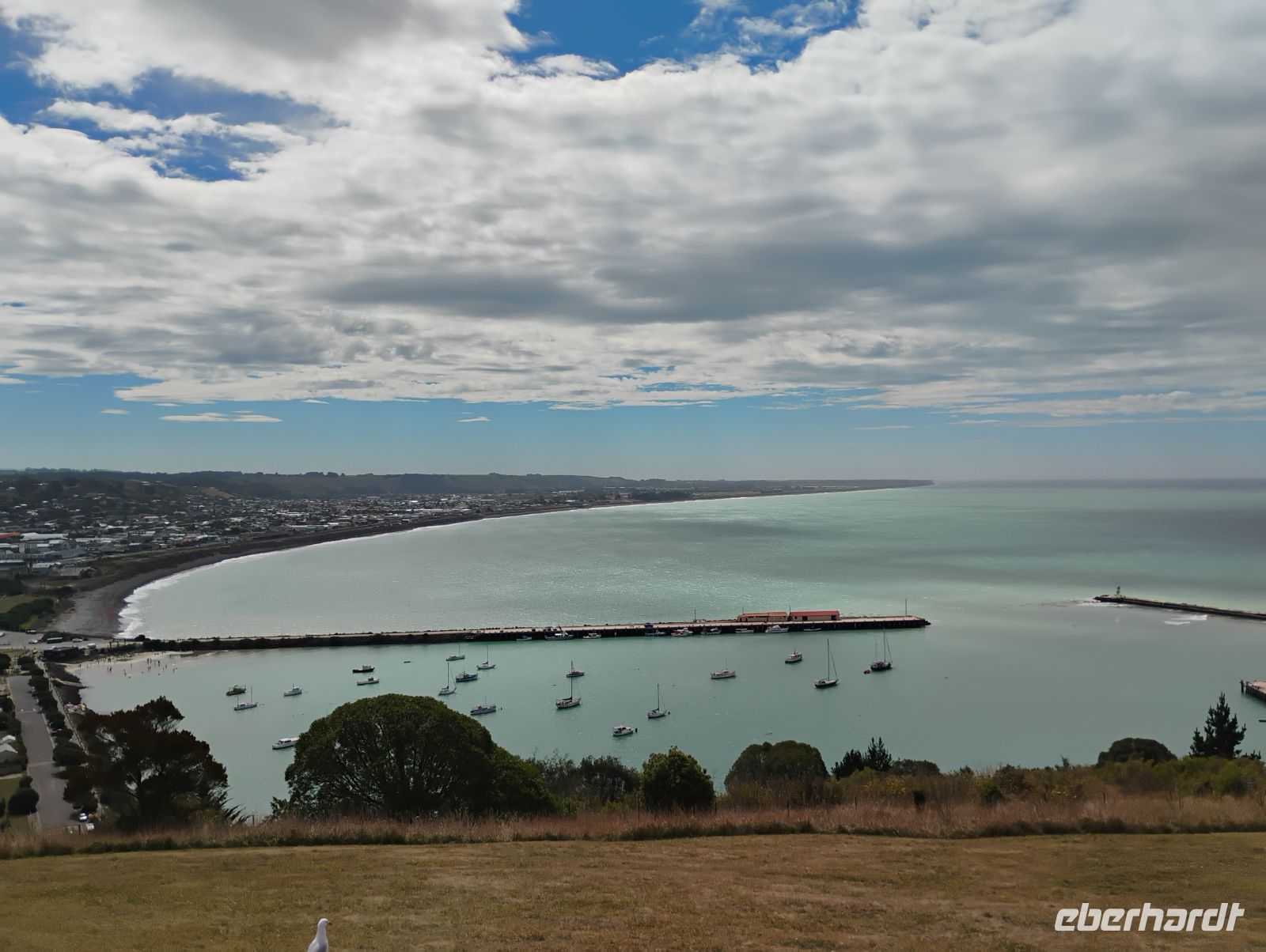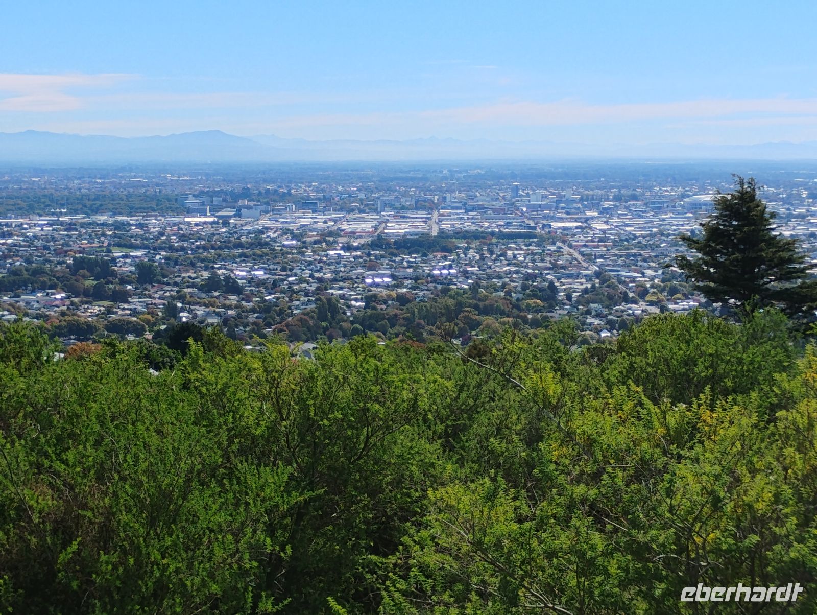 Wir fahren hoch zum Cracroft Reserve Lookout und von dort aus genießen wir einen schönen Blick über Christchurch und die weite Ebene bis zur Küste.
