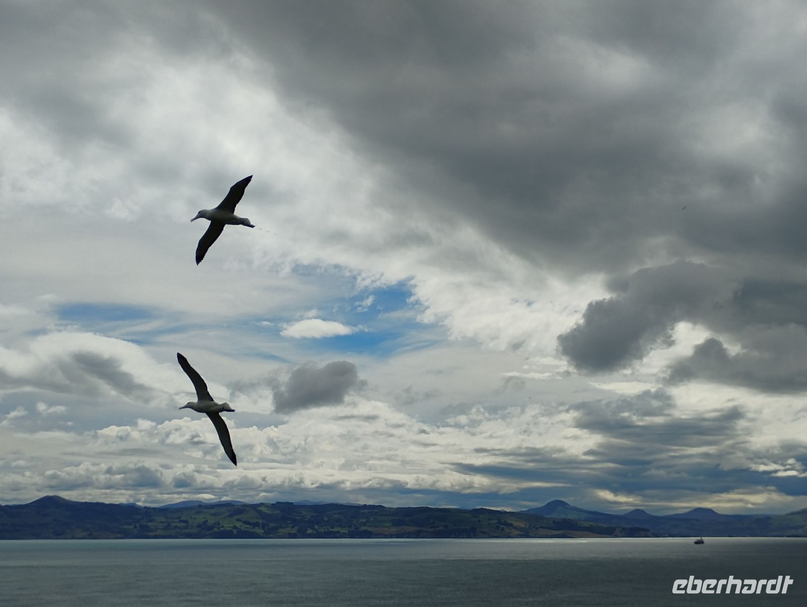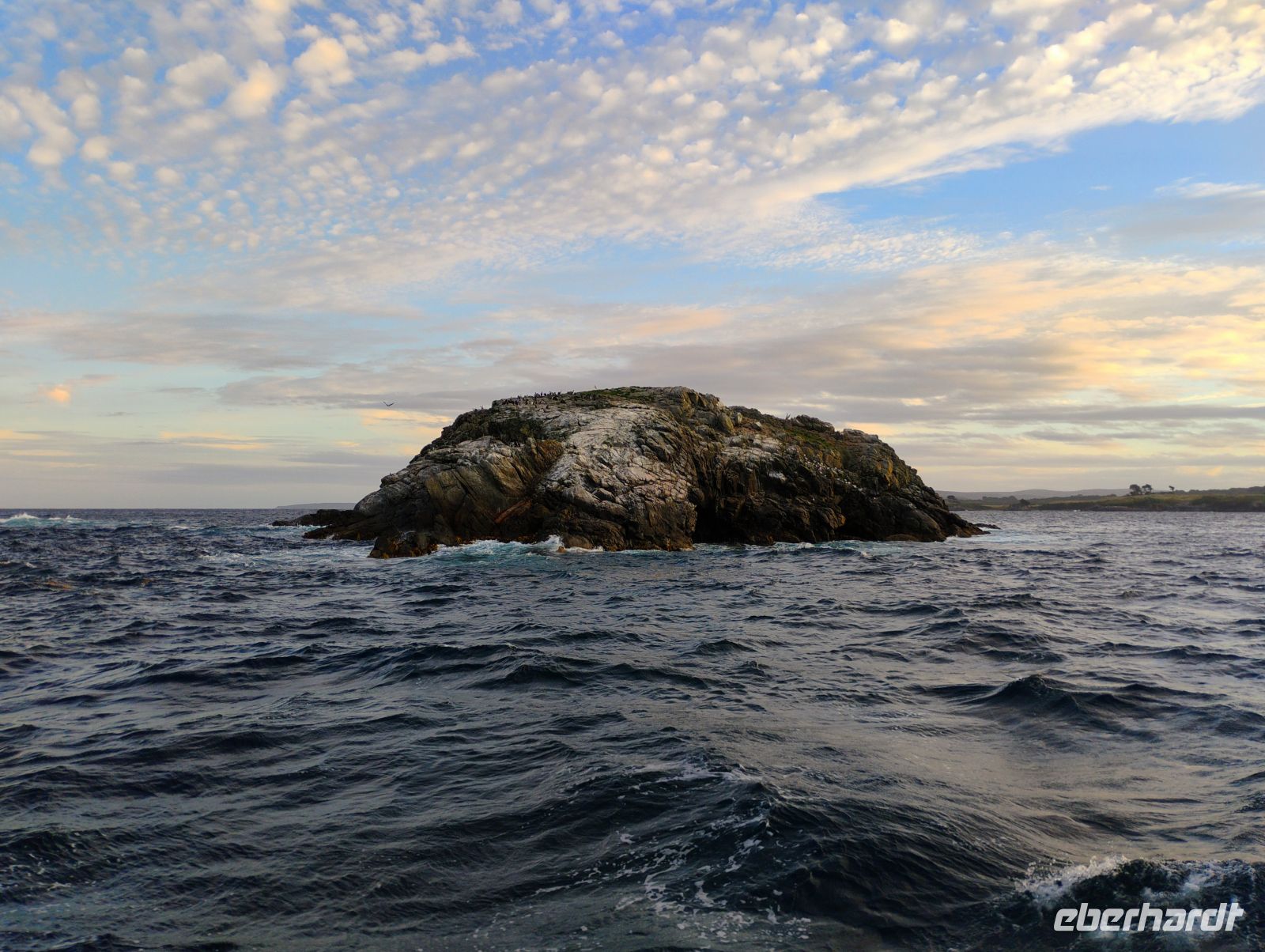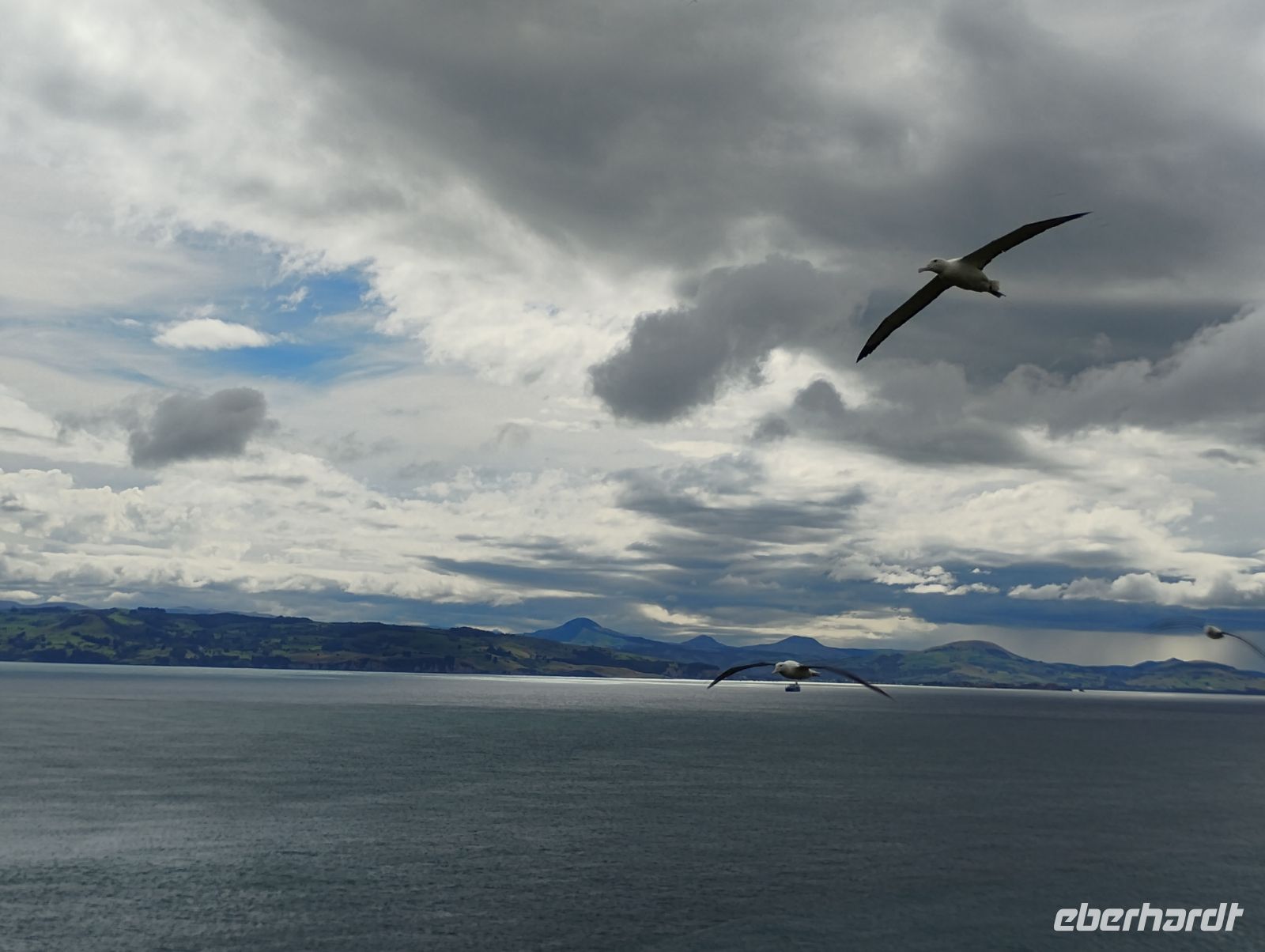 Unterwegs legen wir mehrere kurze Stopps ein, um nach Tieren Ausschau zu halten. Mit Ferngläsern ausgerüstet halten wir zunächst vor Bench Island um nach dem seltenen Gelbaugenpinguin Ausschau. Tatsächlich können wir einen entdecken. Wenig später beobachten wir neuseeländische Pelzrobben am Flat Rock, während über uns mehrere Albatrosse im warmen Licht des Sonnenuntergangs ihre Kreise ziehen. Auch Kormorane sitzen auf den Felsen entlang der Küste.