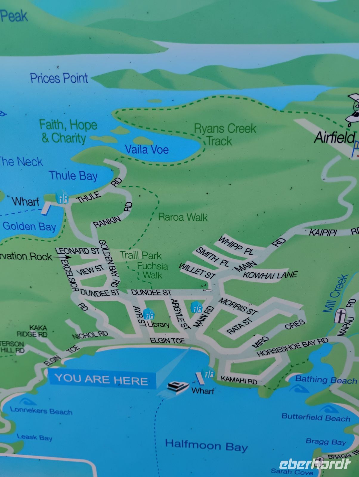 Für den Vormittag habe ich zu einem gemeinsamen Spaziergang eingeladen. Wir treffen uns beim Pub in Oban und starten von dort unsere kleine Erkundungstour. Der Weg führt zunächst über den Fuchsia Walk hinauf zum Aussichtspunkt Observation Rock. Von hier bietet sich ein schöner Blick über die Bucht mit den kleinen Inseln im Paterson Inlet, darunter Ulva Island und Iona Island. Anschließend laufen wir weiter hinunter zur Golden Bay Wharf.