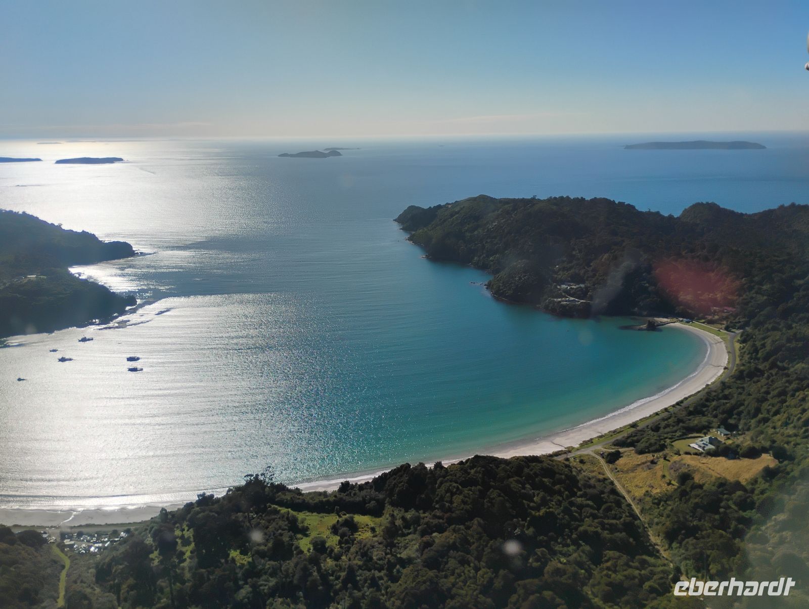 Heute lassen wir Auckland hinter uns und fahren Richtung Coromandel-Halbinsel. Schon nach kurzer Zeit verändert sich die Landschaft: Sanfte grüne Hügel begleiten uns, immer wieder eröffnen sich Ausblicke aufs Meer. Ein erster Halt schenkt uns einen schönen Blick auf die Halbinsel – ein Vorgeschmack auf die kommenden Tage.