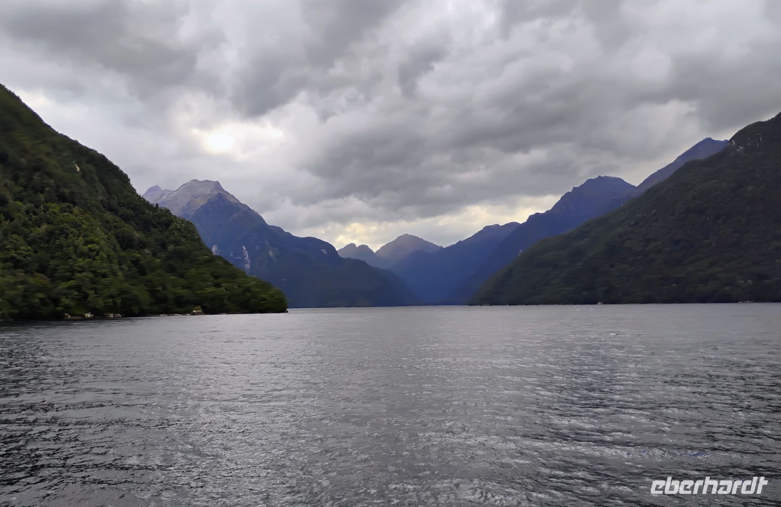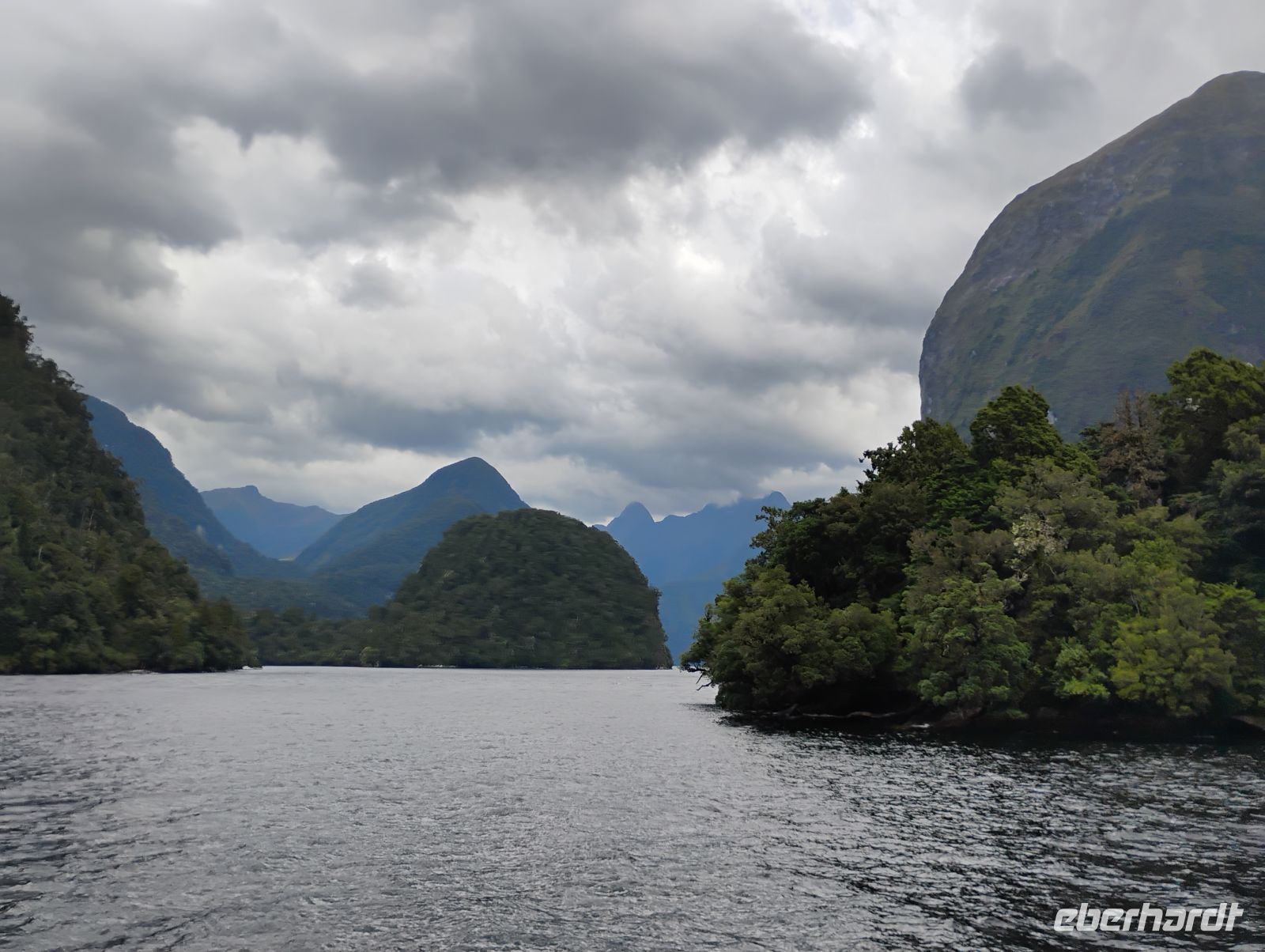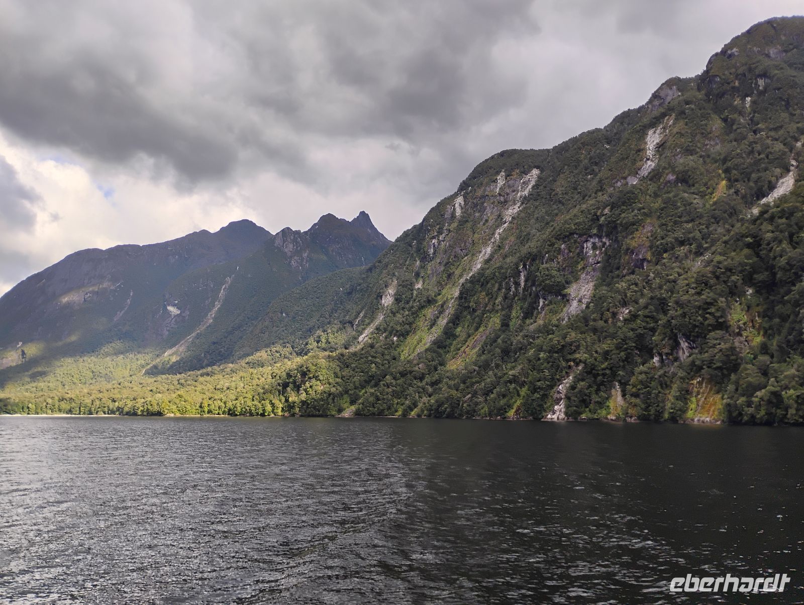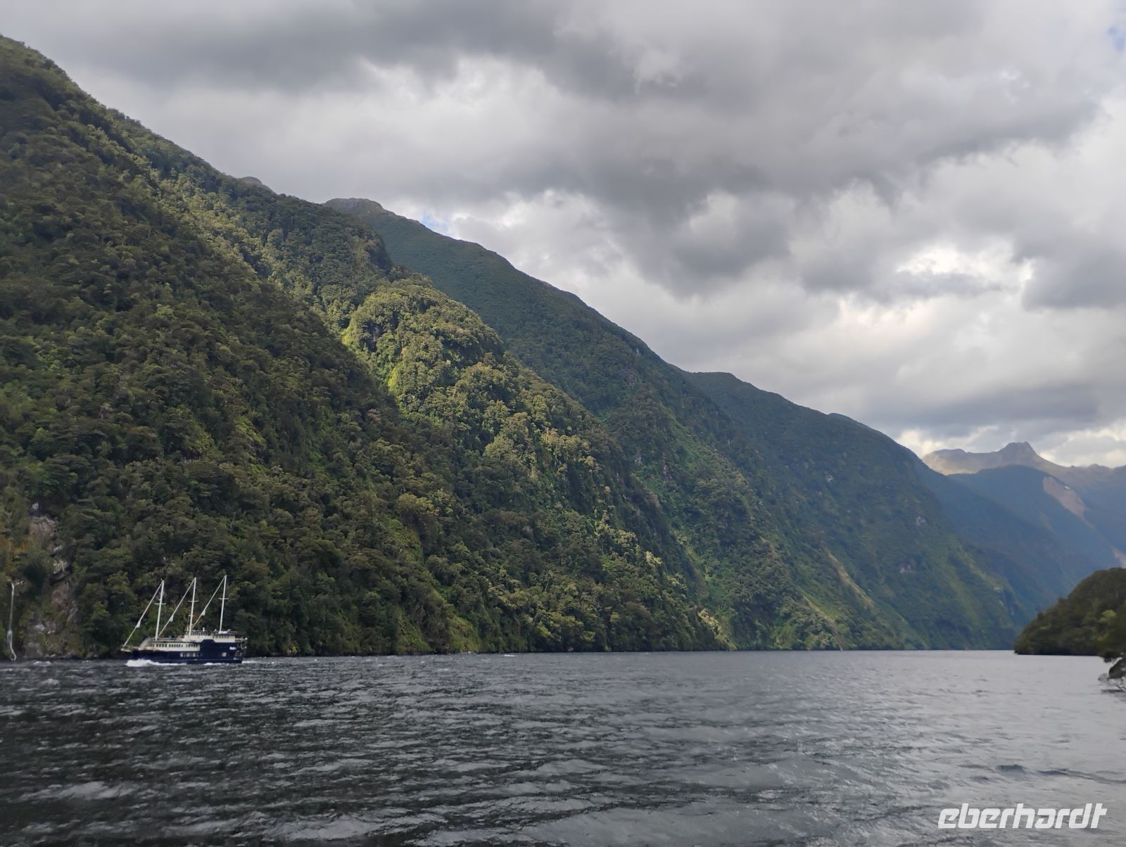 Unten am Deep Cove steigen wir auf einen Katamaran um und beginnen unsere Fahrt durch den Fjord. Der (im Gegensatz zum Milford Sound) eher weniger besuchte Doubtful Sound ist rund 40 Kilometer lang und führt hinaus zur Tasman Sea. Während der Fahrt erklärt ein Nature Guide immer wieder Besonderheiten dieser Landschaft.
