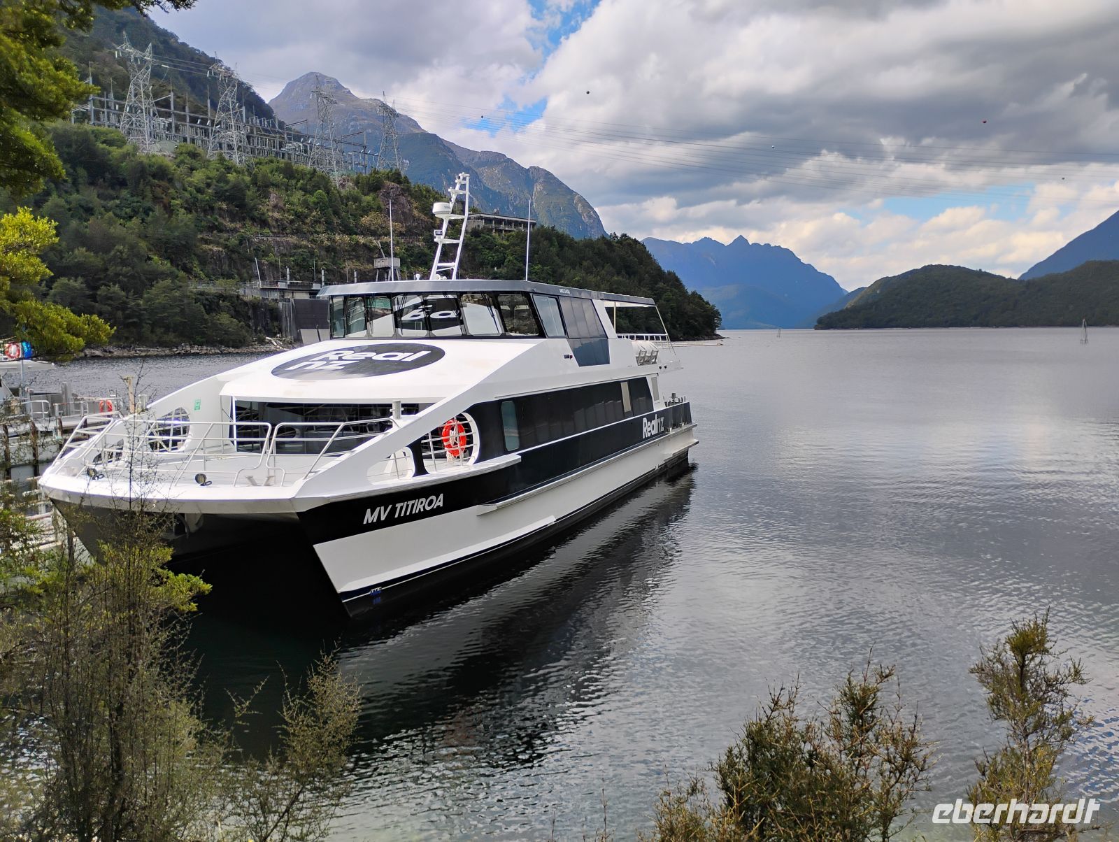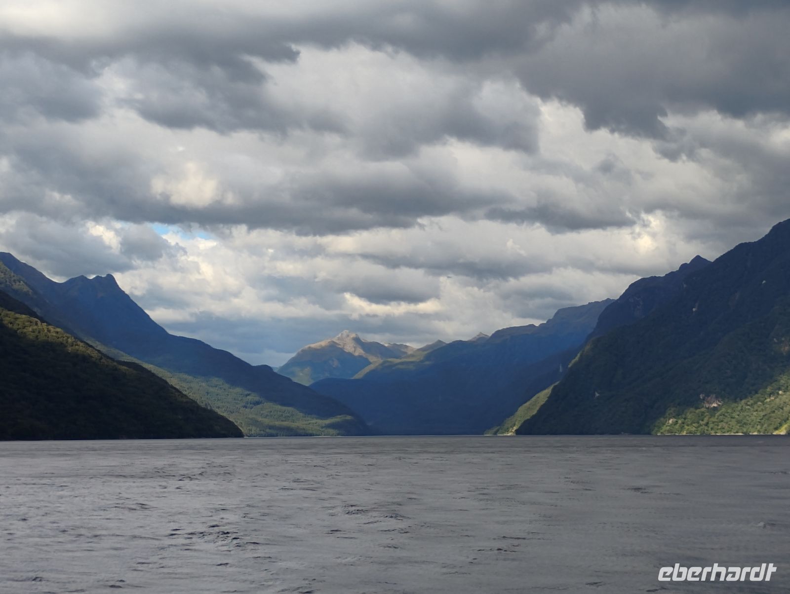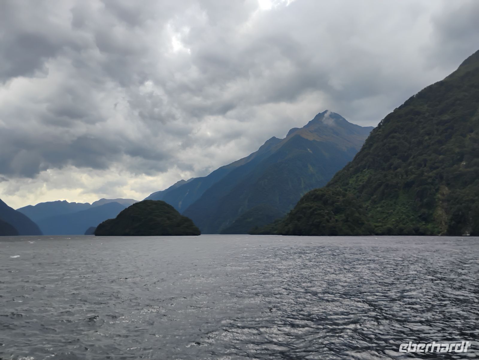 Unten am Deep Cove steigen wir auf einen Katamaran um und beginnen unsere Fahrt durch den Fjord. Der (im Gegensatz zum Milford Sound) eher weniger besuchte Doubtful Sound ist rund 40 Kilometer lang und führt hinaus zur Tasman Sea. Während der Fahrt erklärt ein Nature Guide immer wieder Besonderheiten dieser Landschaft.