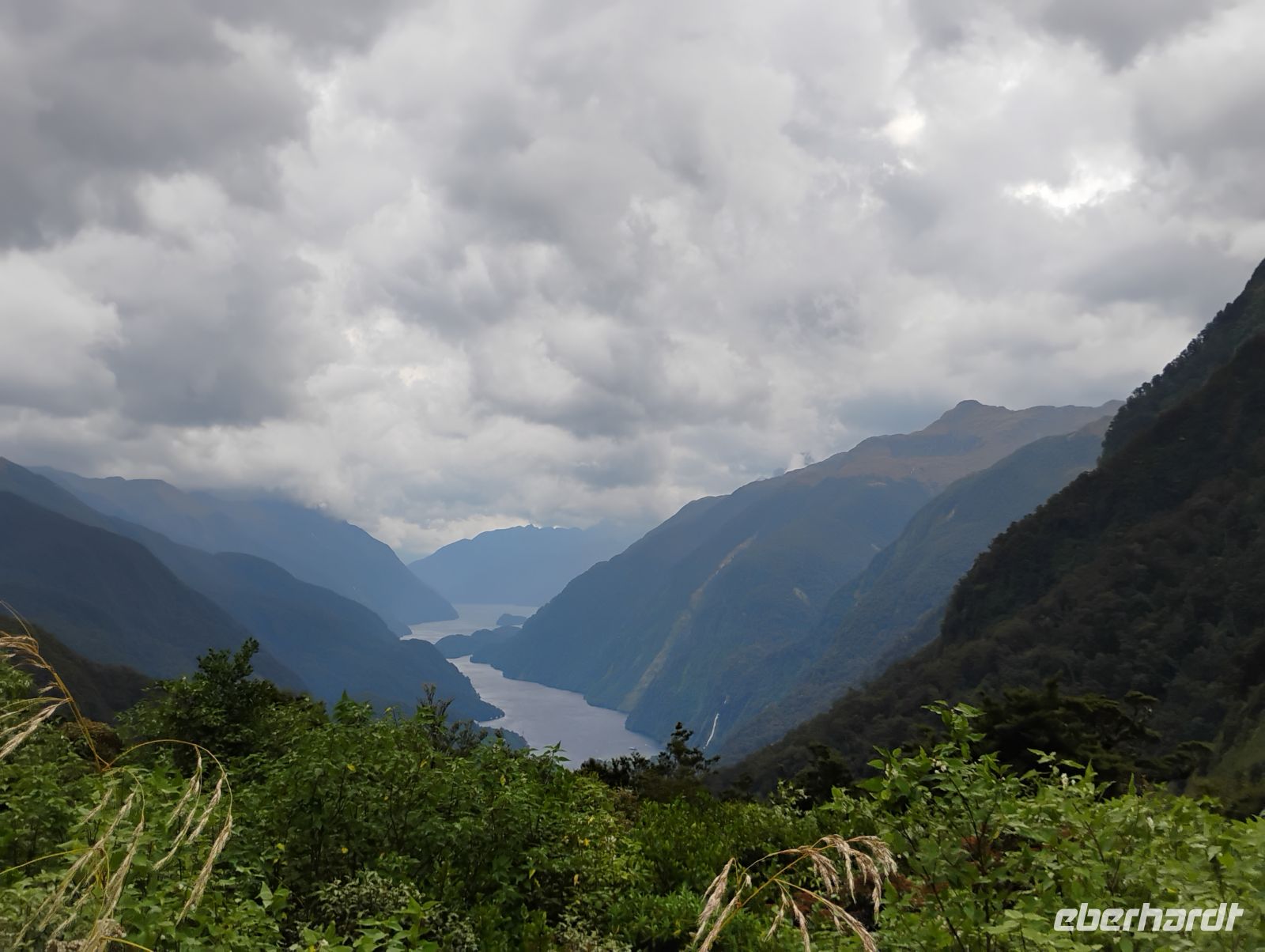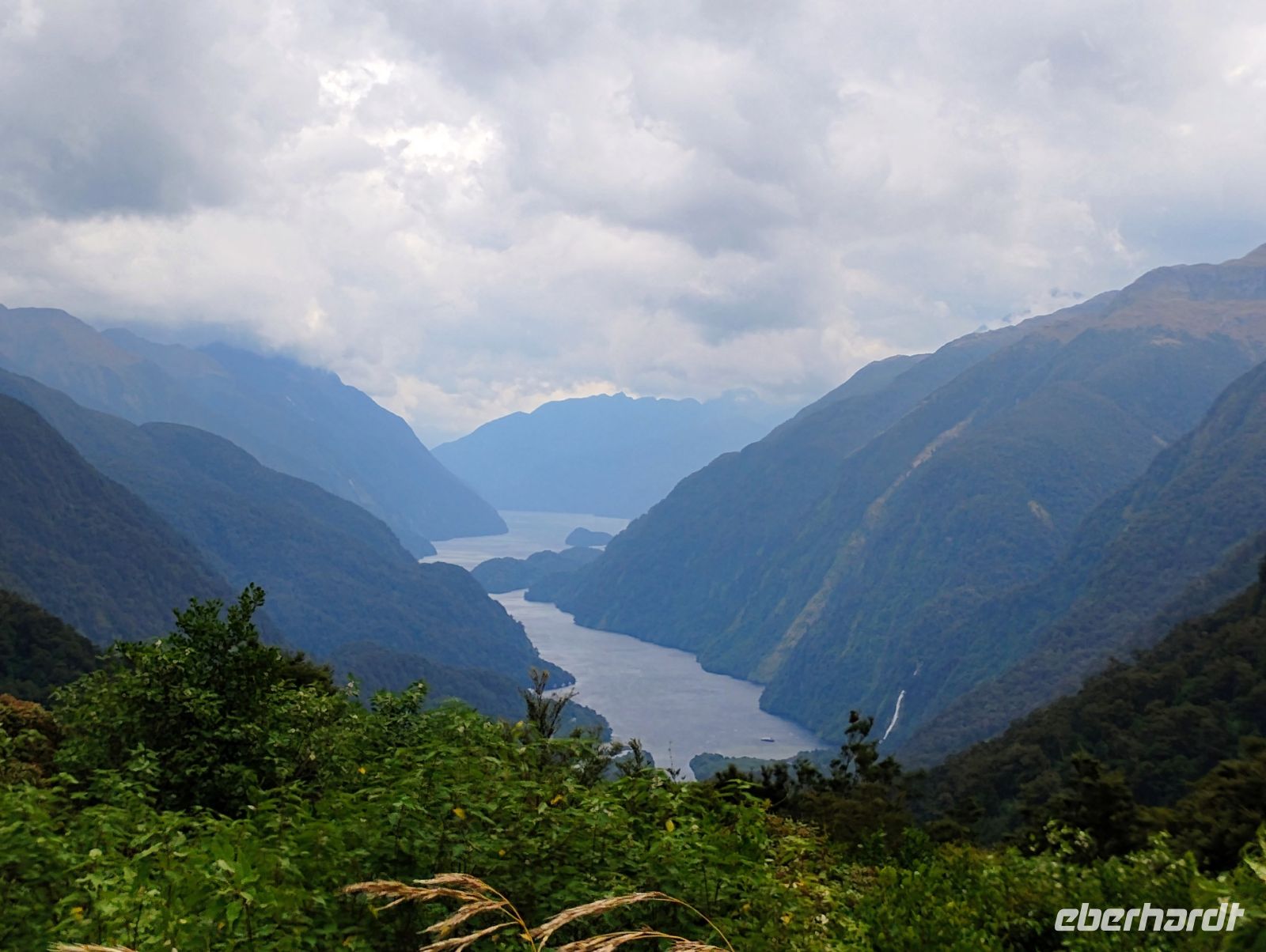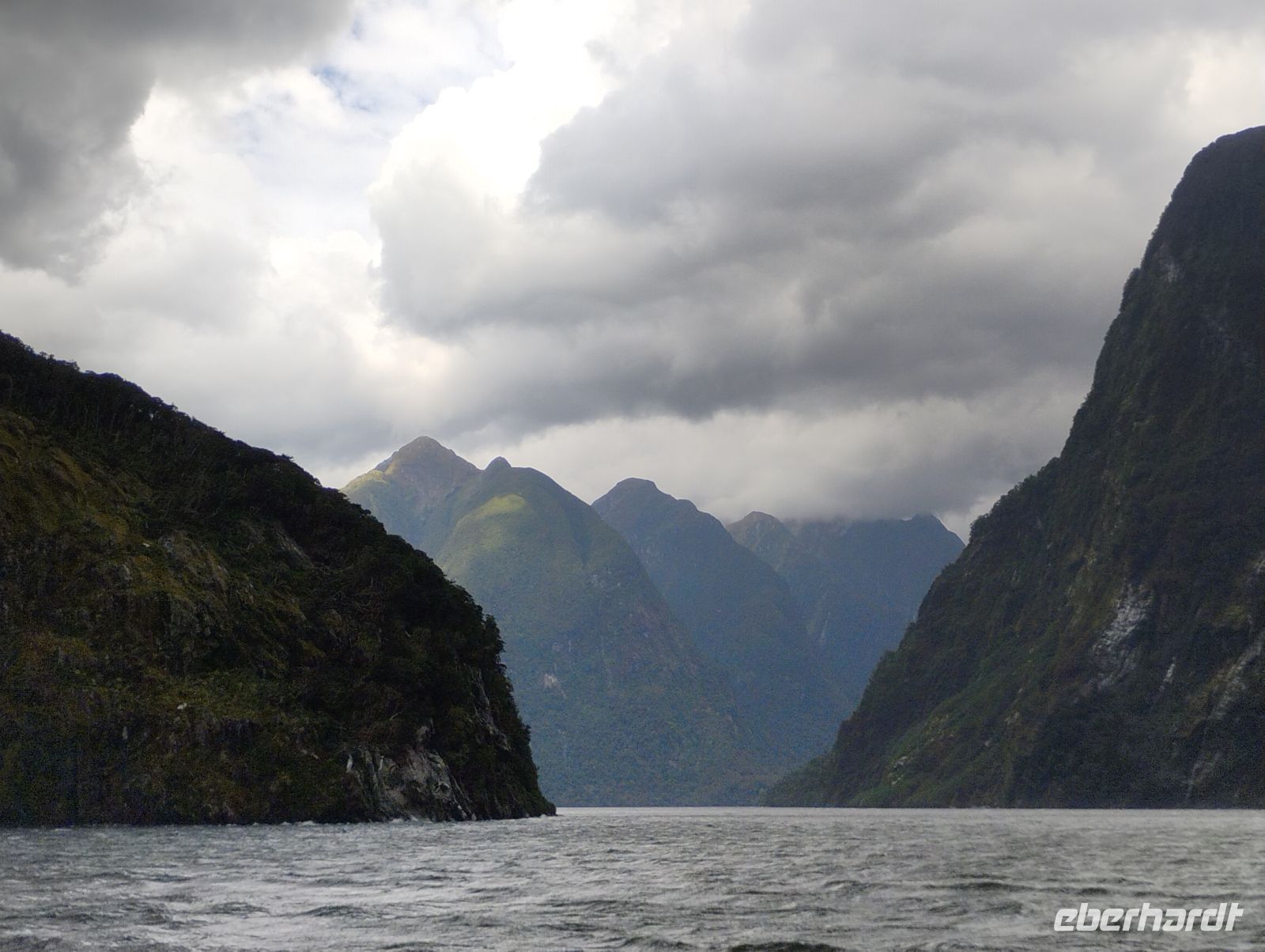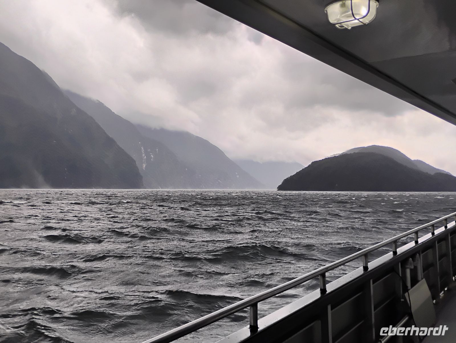 Unten am Deep Cove steigen wir auf einen Katamaran um und beginnen unsere Fahrt durch den Fjord. Der (im Gegensatz zum Milford Sound) eher weniger besuchte Doubtful Sound ist rund 40 Kilometer lang und führt hinaus zur Tasman Sea. Während der Fahrt erklärt ein Nature Guide immer wieder Besonderheiten dieser Landschaft.