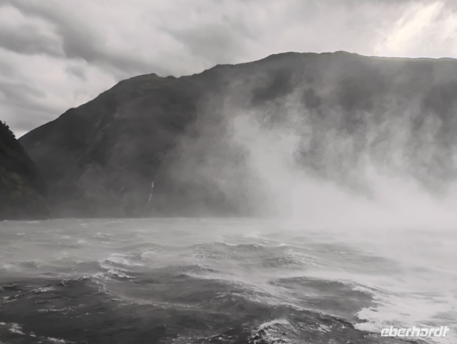 Das Wetter ist sehr stürmisch, mit starken Böen, sodass man zeitweise lieber im Inneren des Schiffes bleibt, um nicht nass oder fast vom Wind weggeweht zu werden.