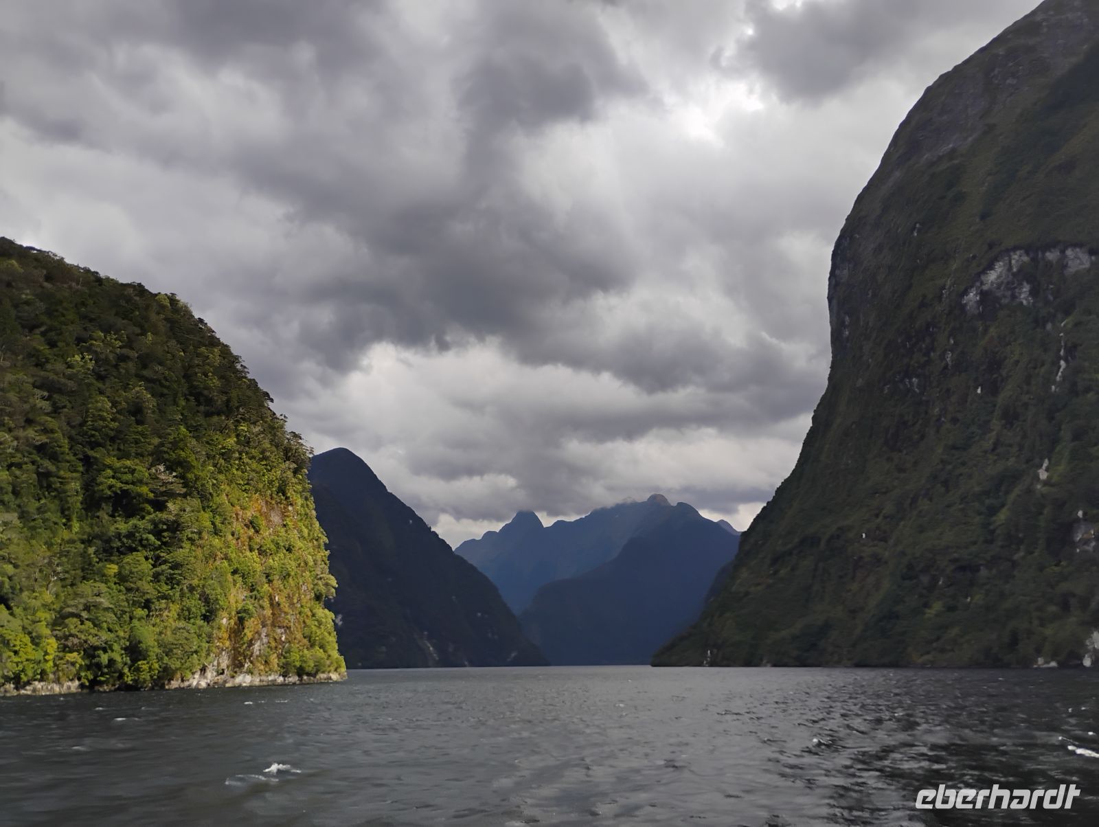 Auffällig ist die dunkle Farbe des Wassers. Durch die extrem hohen Niederschläge im Fiordland fließt ständig Süßwasser aus den umliegenden Bergen in den Fjord. Dieses bildet eine dünne Schicht über dem Salzwasser und enthält viele Gerbstoffe aus dem Regenwald, ähnlich wie bei starkem Tee. Dadurch erscheint das Wasser von oben fast schwarz und lässt nur wenig Licht in die Tiefe.