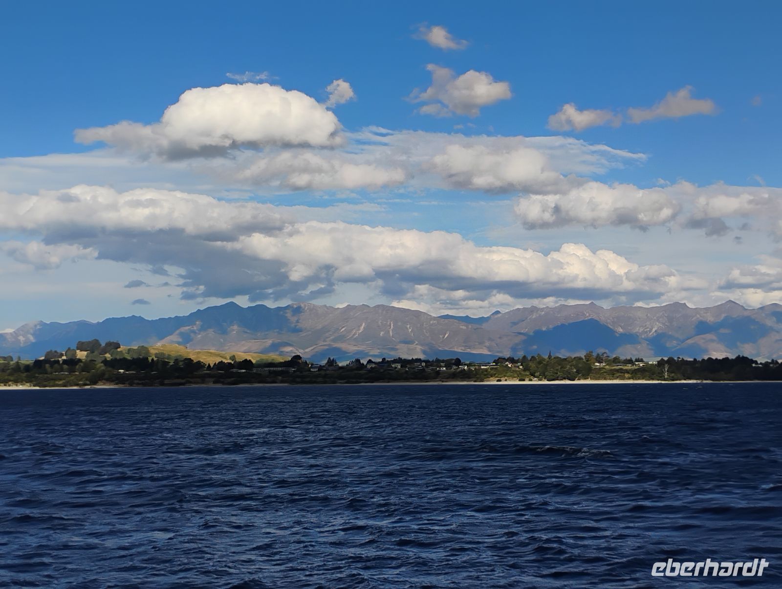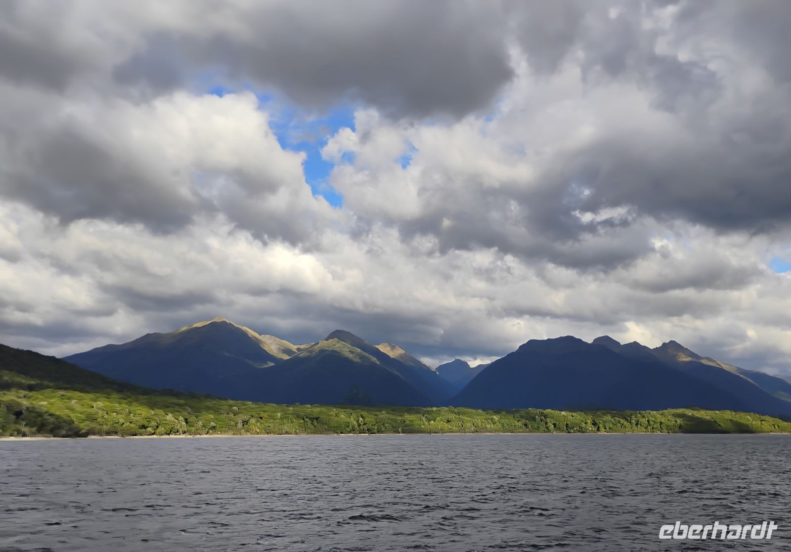 Nach dem Frühstück fahren wir von Te Anau nach Manapouri, dem Ausgangspunkt für den Ausflug zum Doubtful Sound. Zuerst geht es mit dem Schiff über den Lake Manapouri, der von bewaldeten Bergen umgeben ist.
