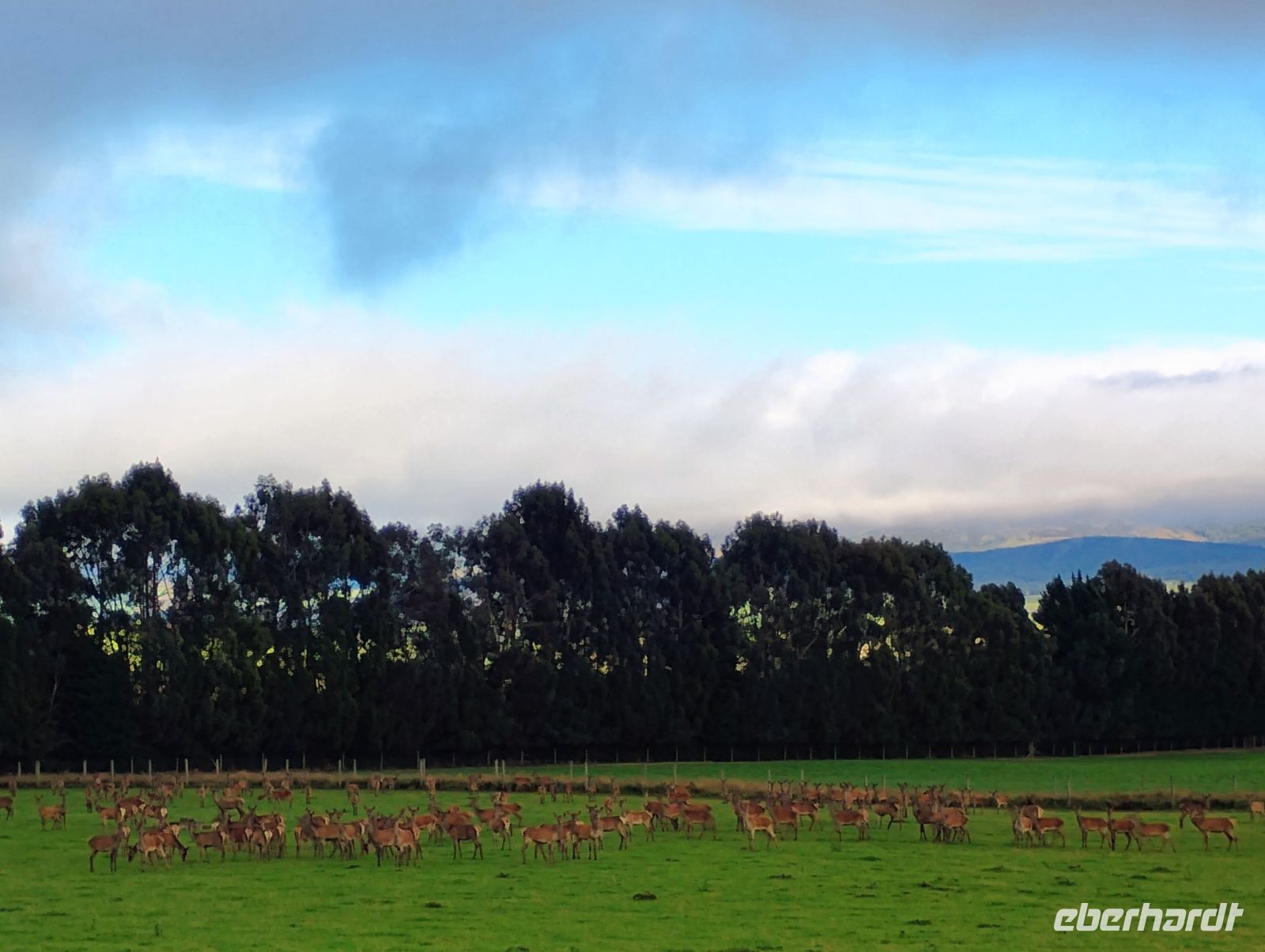 Am Morgen verlassen wir Te Anau und fahren in Richtung Norden. Unsere Route führt zunächst über Mossburn, einen Ort, der heute als „Hirschhauptstadt“ Neuseelands gilt. In dieser Region wurden einst Rothirsche zur Jagd ausgesetzt. Wie viele andere eingeführte Tierarten, etwa Kaninchen oder Wiesel, entwickelten sie sich schnell zu einem Problem für die einheimische Tierwelt. Heute hat sich daraus jedoch eine bedeutende Hirschzucht entwickelt, und Mossburn ist ein Zentrum dieser Landwirtschaft.