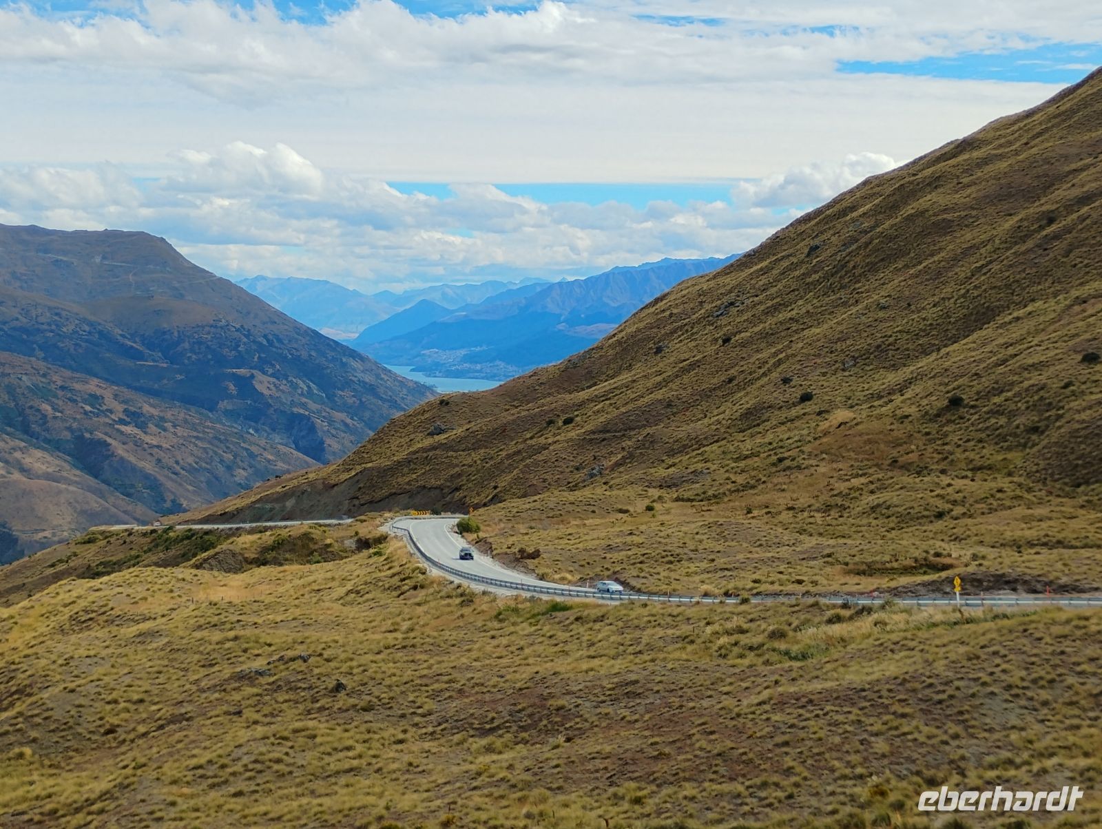 Danach führt die Straße hinauf über die spektakuläre Crown Range, die höchste asphaltierte Passstraße Neuseelands. Kurze Fotostopps bieten beeindruckende Ausblicke auf die Berglandschaft rund um Queenstown.