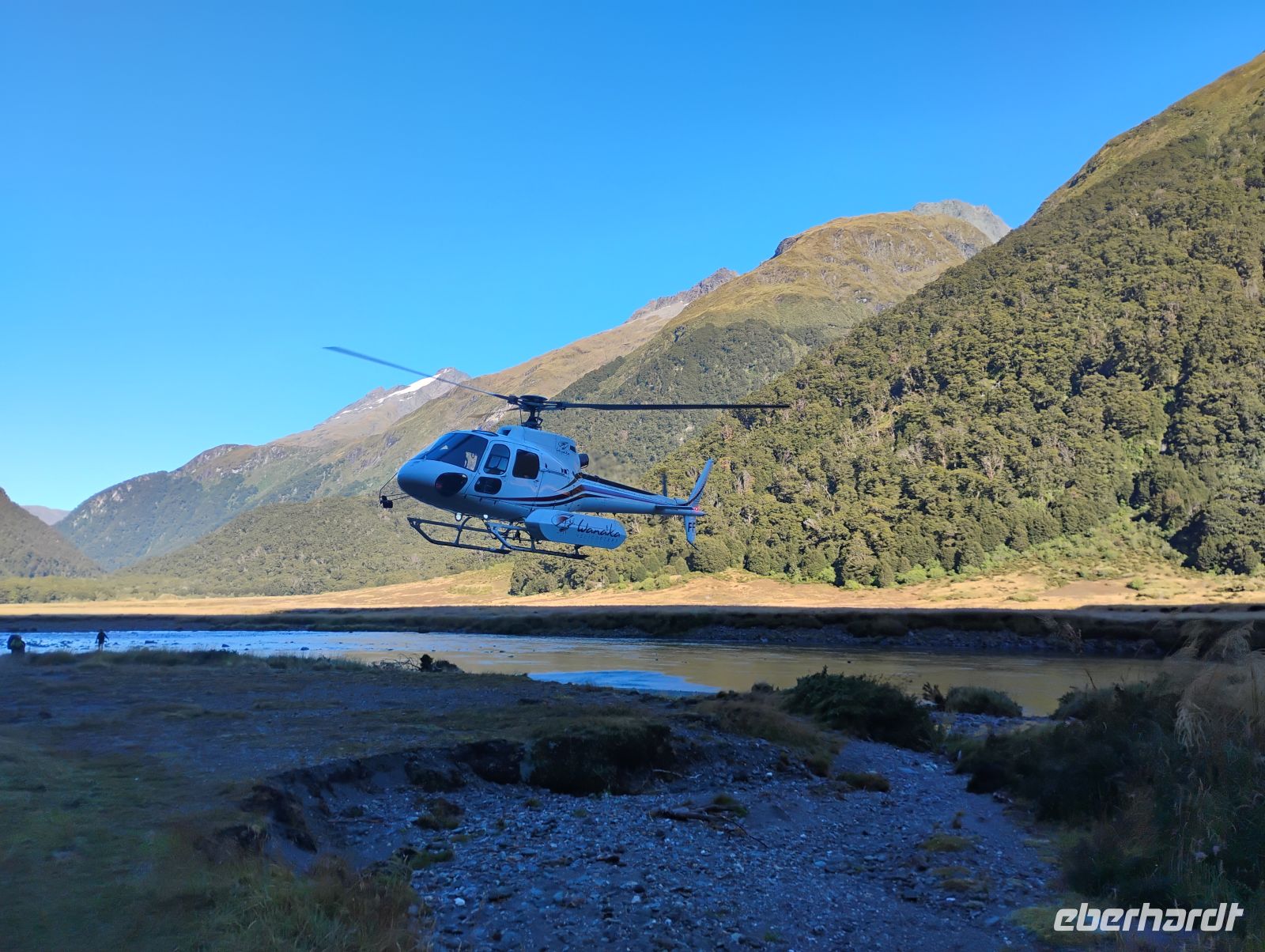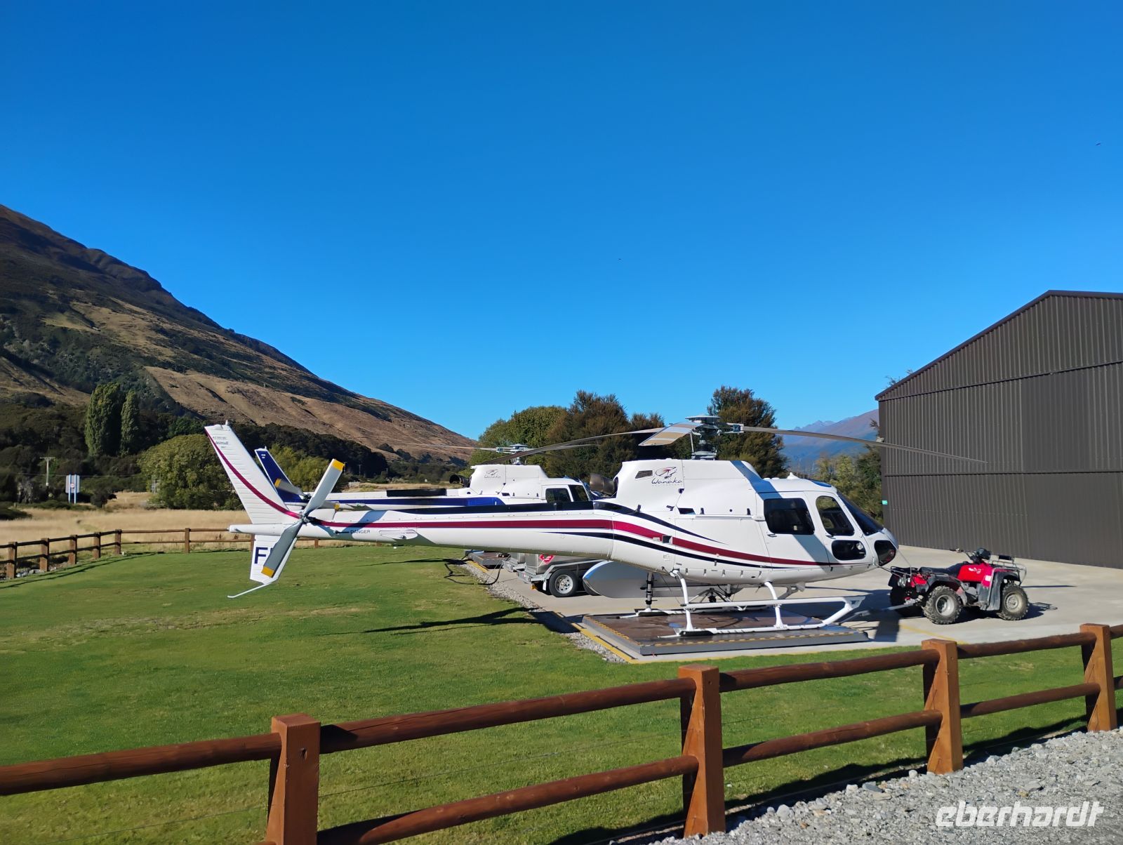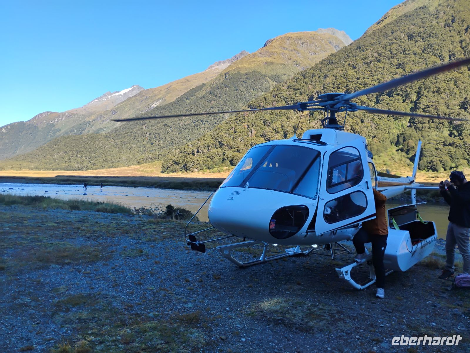Hier beginnt für viele aus unserer Gruppe ein besonderer Ausflug: ein kombinierter Helikopterflug, eine Wanderung durch abgelegene Natur und eine Jetbootfahrt zurück ins Tal. Nach dem Check-in und einer kurzen Sicherheitseinweisung werden wir gewogen und auf zwei Helikopter verteilt. Das Gepäck wird außen an den Kufen verstaut, dann starten die Maschinen nacheinander.