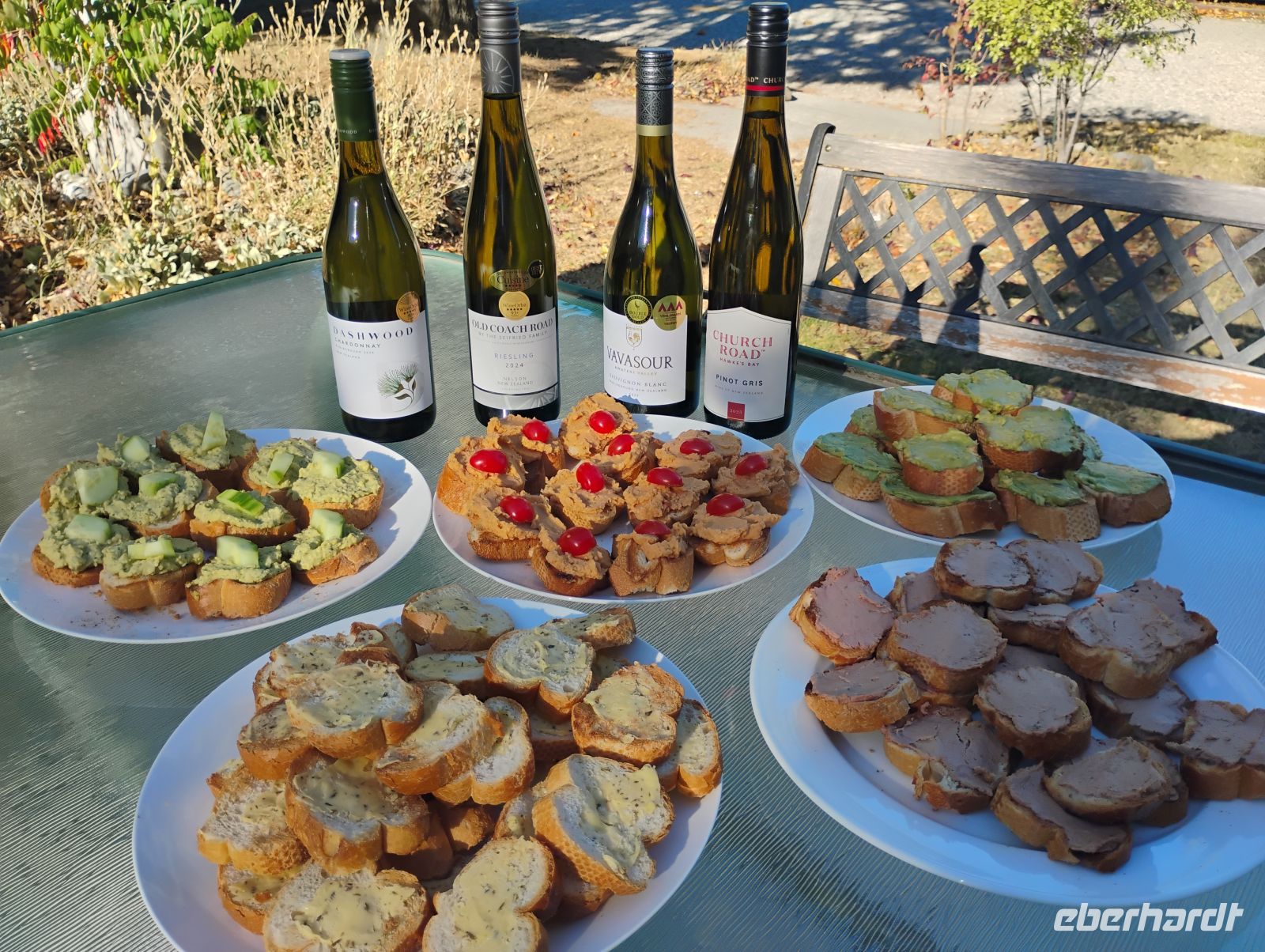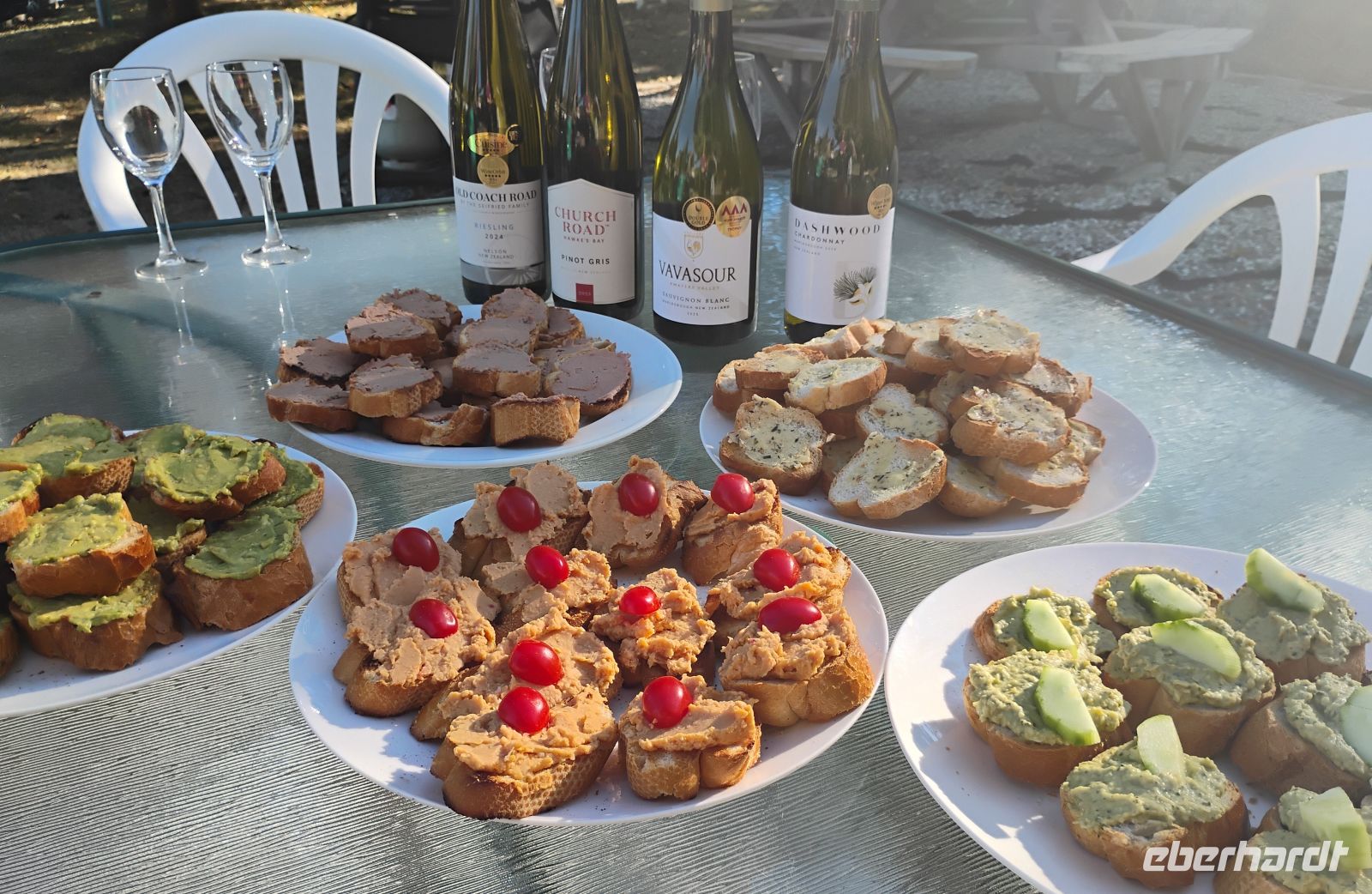 Am frühen Abend treffen wir uns zu einer kleinen Weinprobe. Michael führt uns durch eine Auswahl neuseeländischer Weine und gibt dabei interessante Einblicke in die Weinwelt des Landes. Wir probieren Riesling, Sauvignon Blanc, Pinot Gris und Chardonnay, dazu gibt es Antipasti für den gemeinsamen Auftakt des Abends.