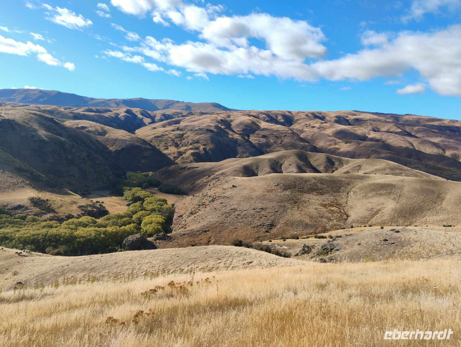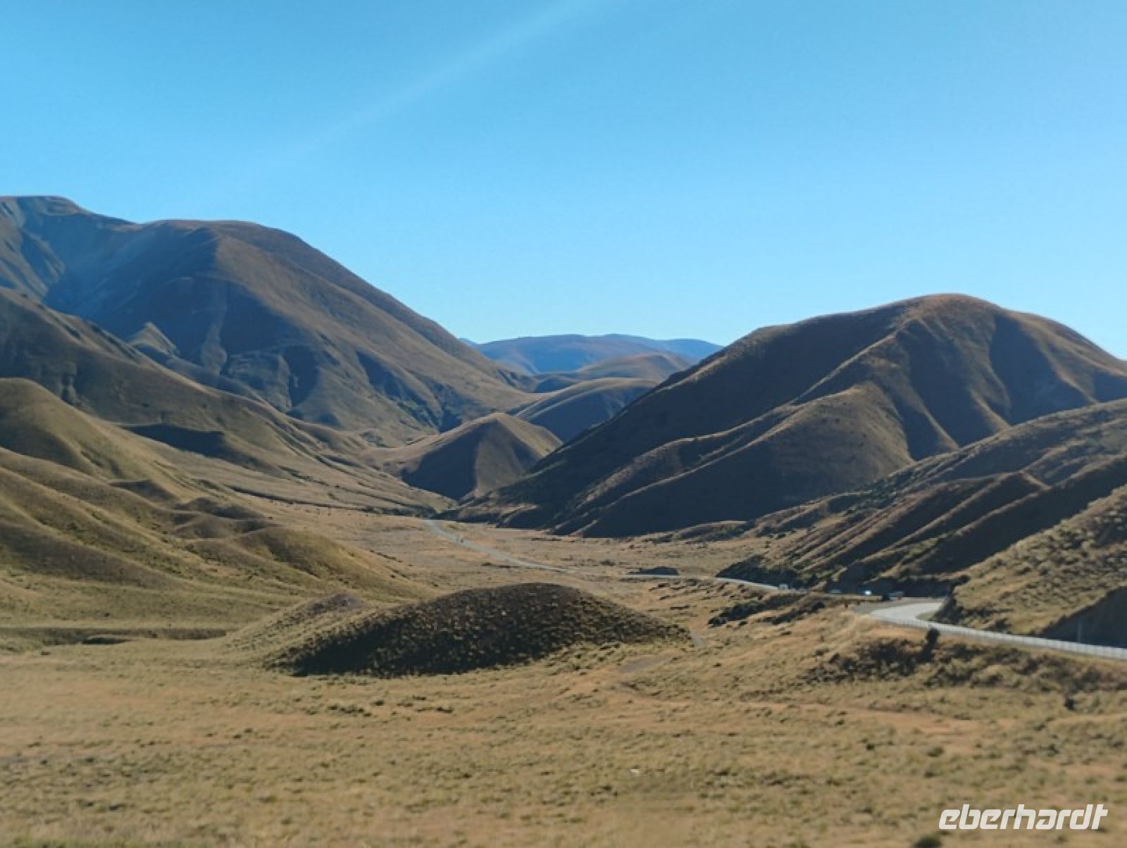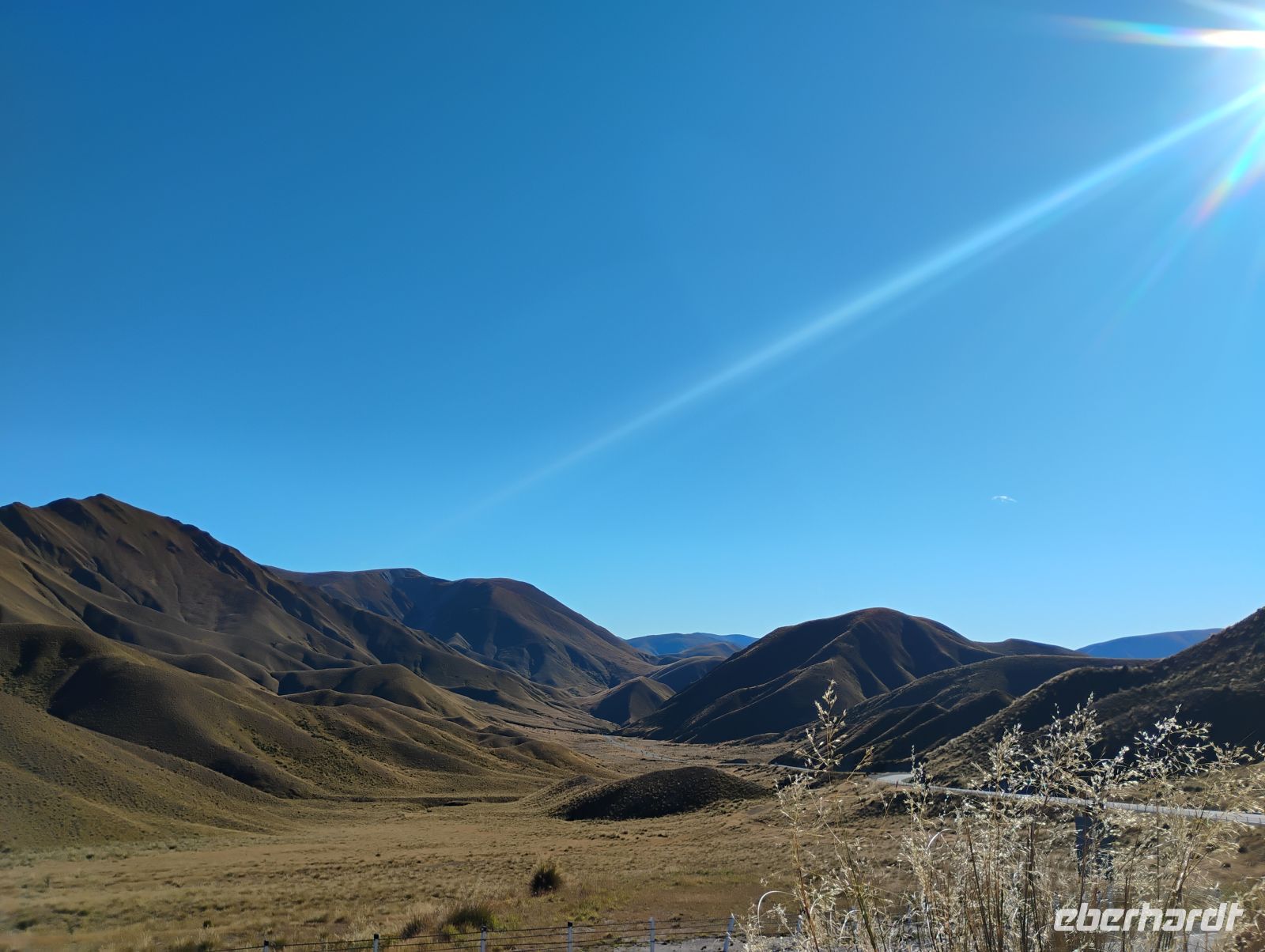 Am Morgen verlassen wir Wānaka und fahren Richtung Norden. Schon bald erreichen wir den Lindis Pass. Die Landschaft wirkt hier fast karg und erinnert mit ihren goldgelben Tussock-Gräsern und sanften Hügeln an eine weite Hochlandsteppe. Bei strahlend blauem Himmel und ohne eine einzige Wolke genießen wir die besonderen Licht- und Schattenspiele dieser weiten Landschaft. Es wirkt fast wie eine Landschaft von einem anderen Planeten.