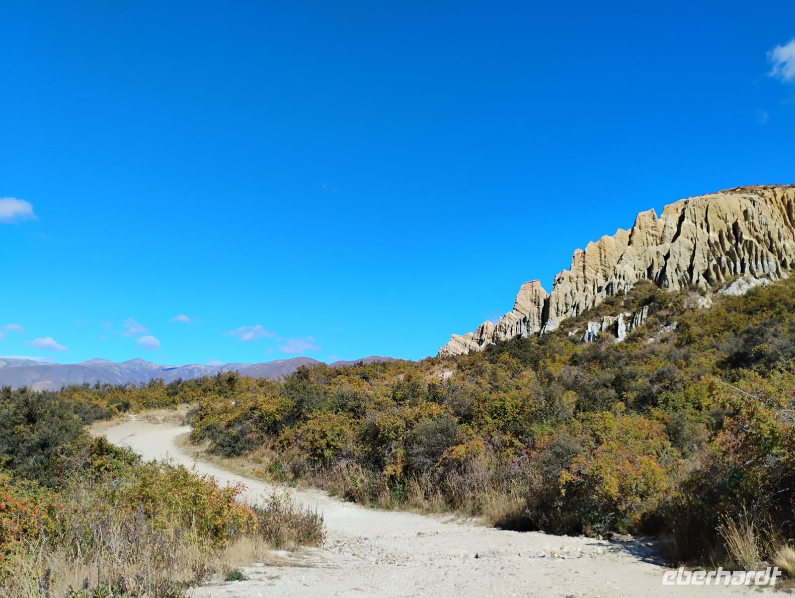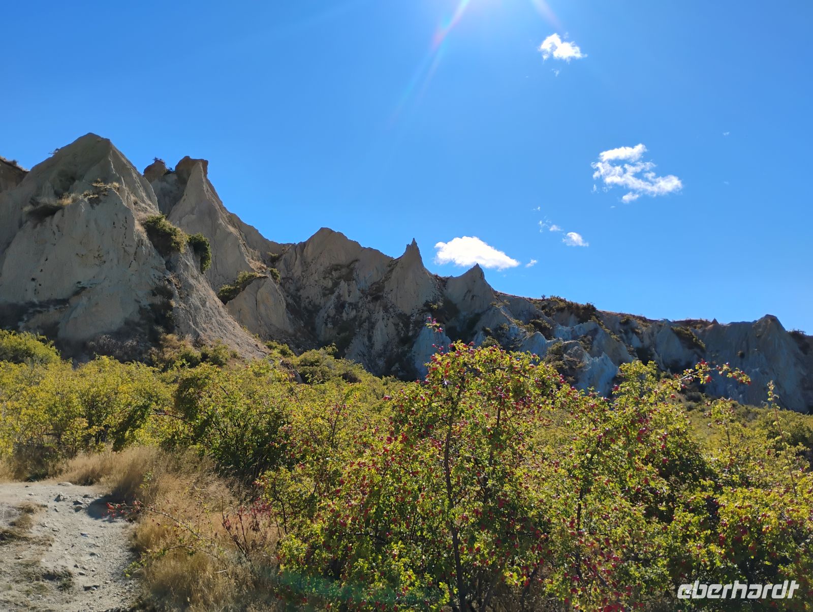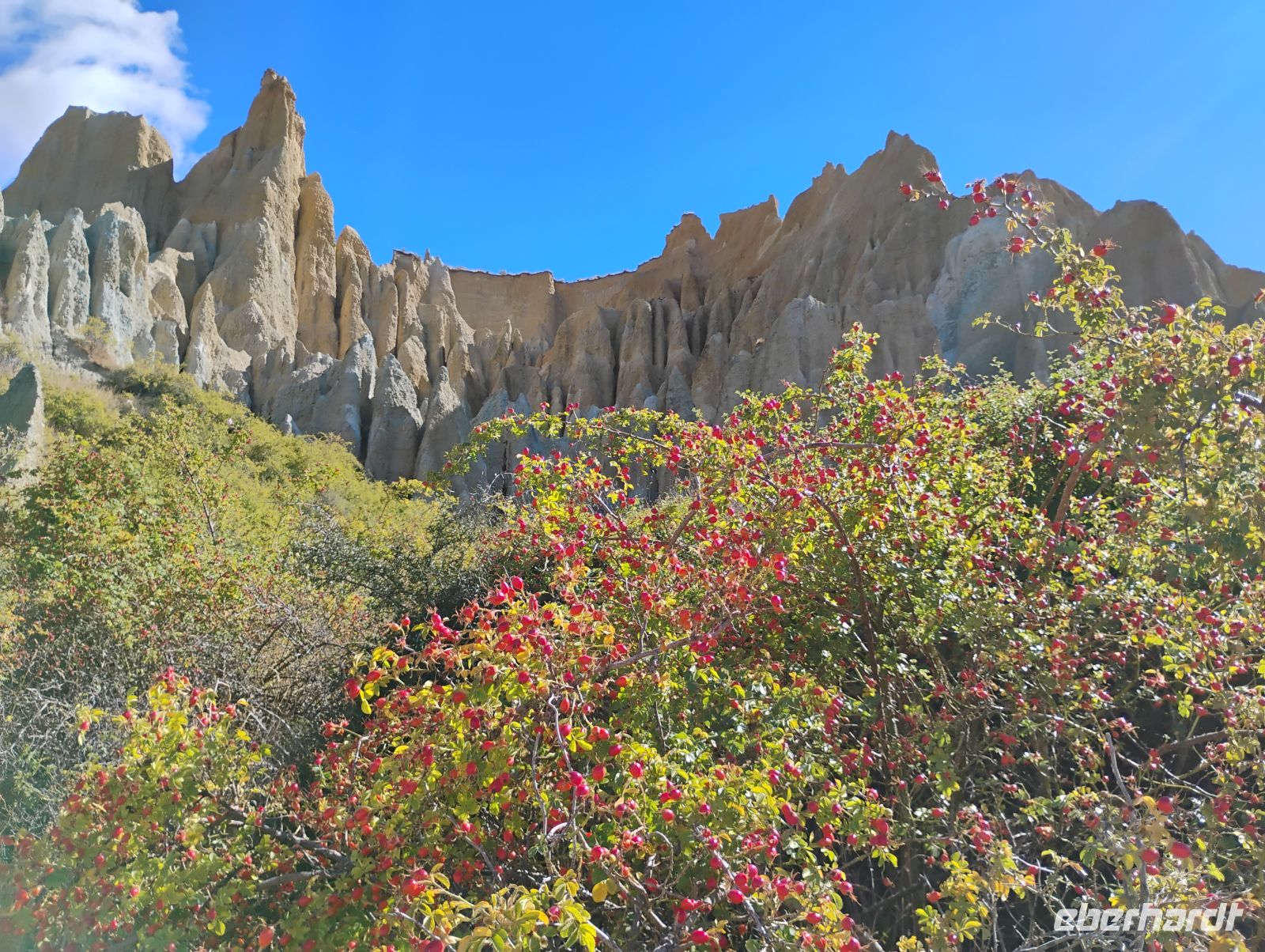 Hinter dem kleinen Ort Omarama unternehmen wir einen kurzen Spaziergang, umgeben von unzähligen Hagebuttensträuchern, zu den beeindruckenden Clay Cliffs. Die bizarren, von Wind und Wasser geformten Lehmformationen ragen wie kleine Felstürme in den Himmel.
