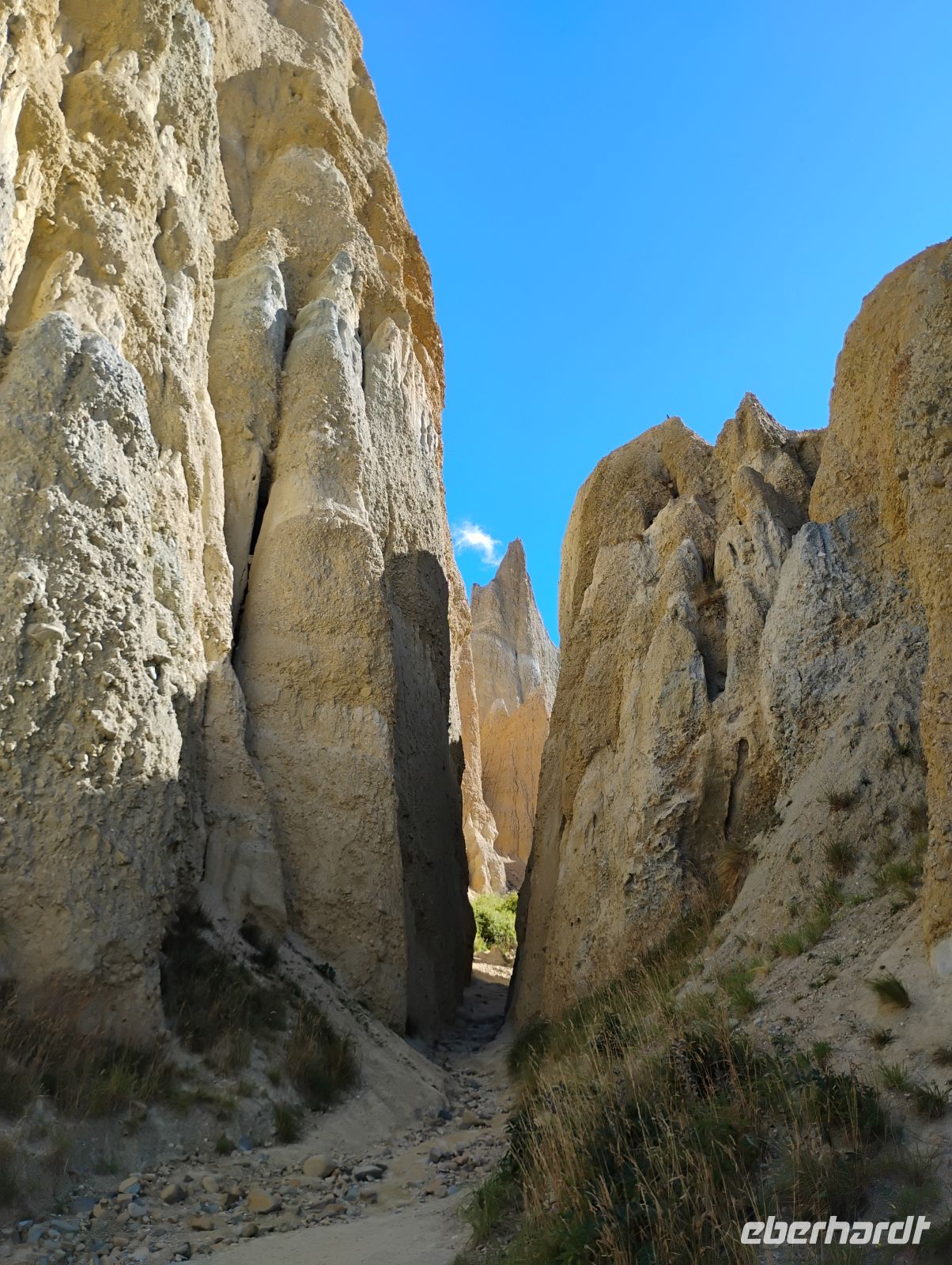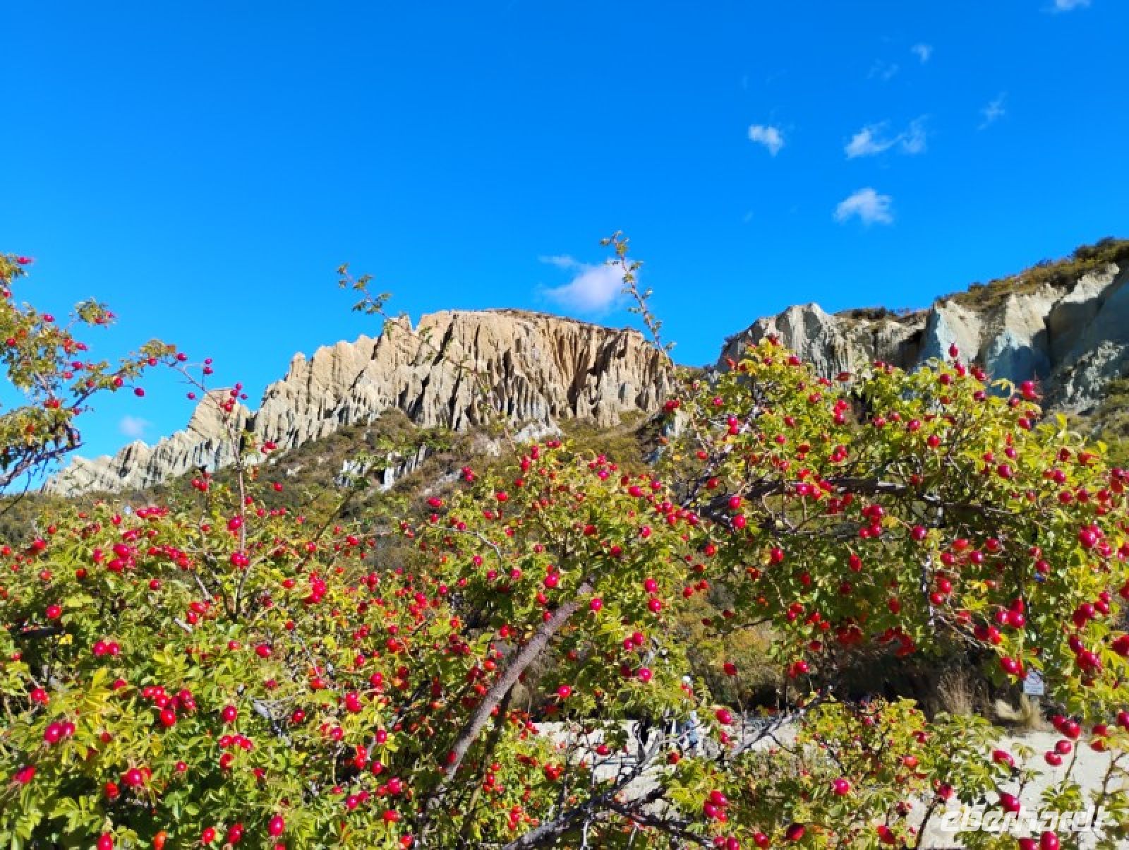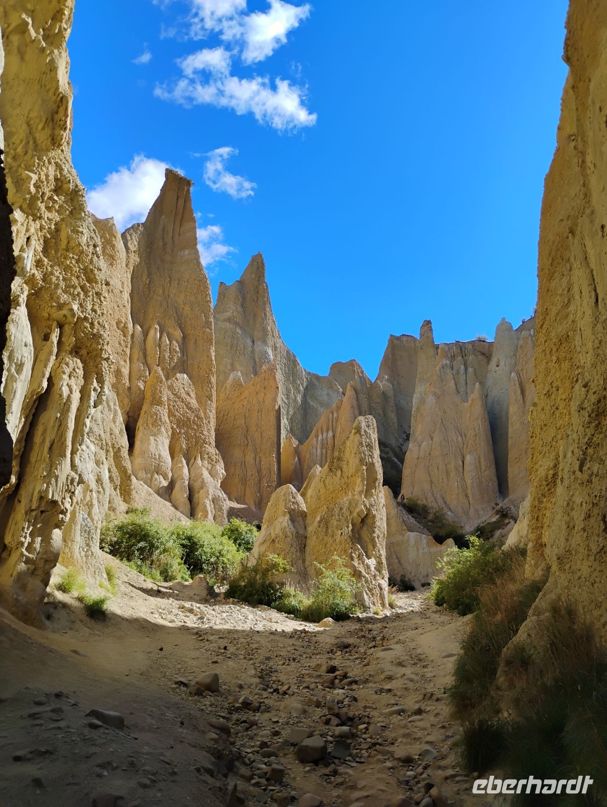 Hinter dem kleinen Ort Omarama unternehmen wir einen kurzen Spaziergang, umgeben von unzähligen Hagebuttensträuchern, zu den beeindruckenden Clay Cliffs. Die bizarren, von Wind und Wasser geformten Lehmformationen ragen wie kleine Felstürme in den Himmel.