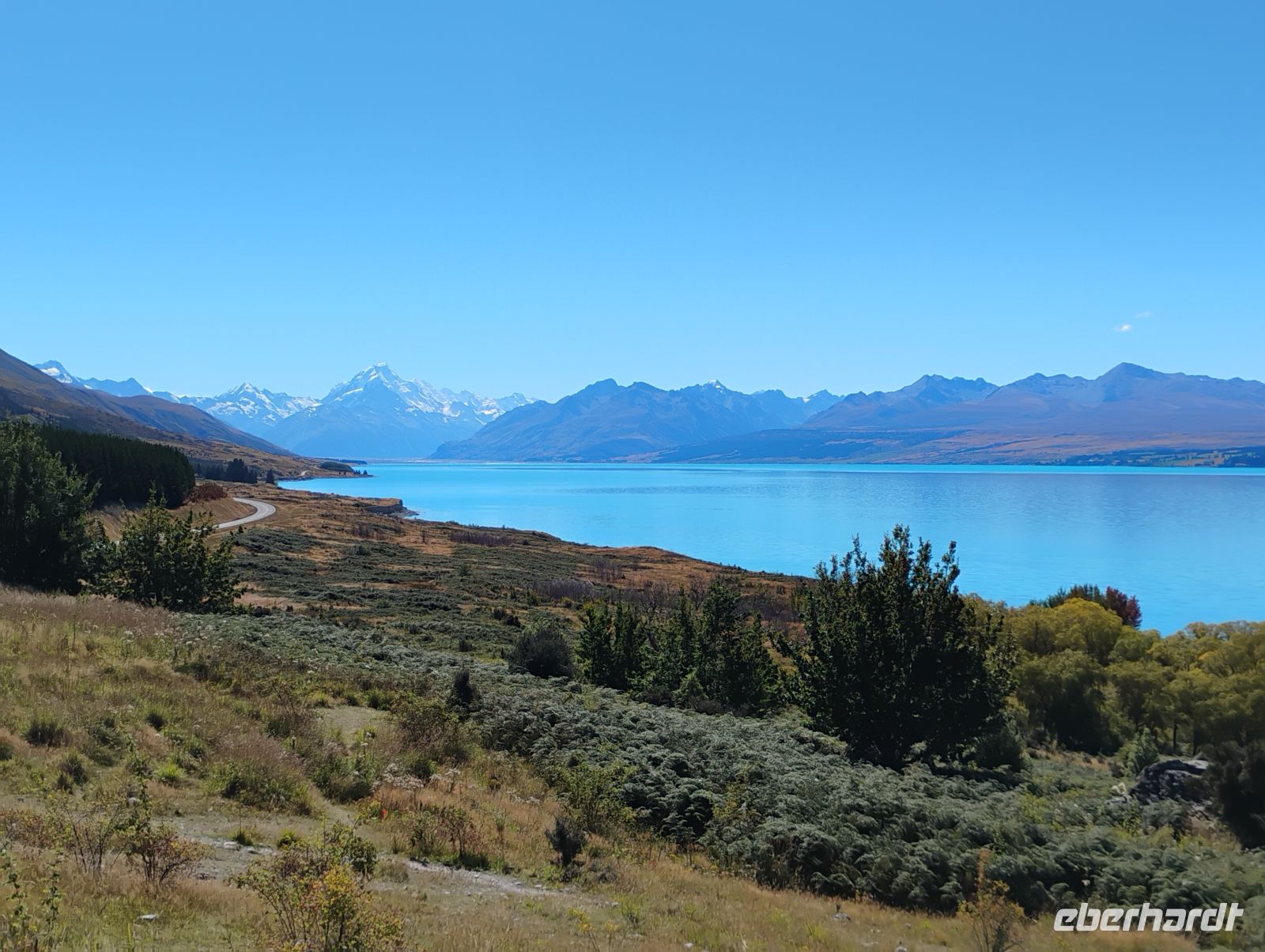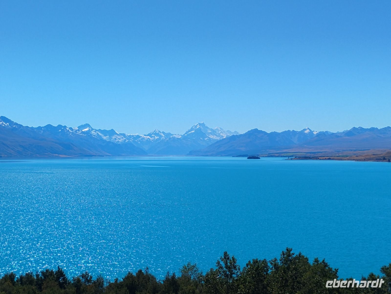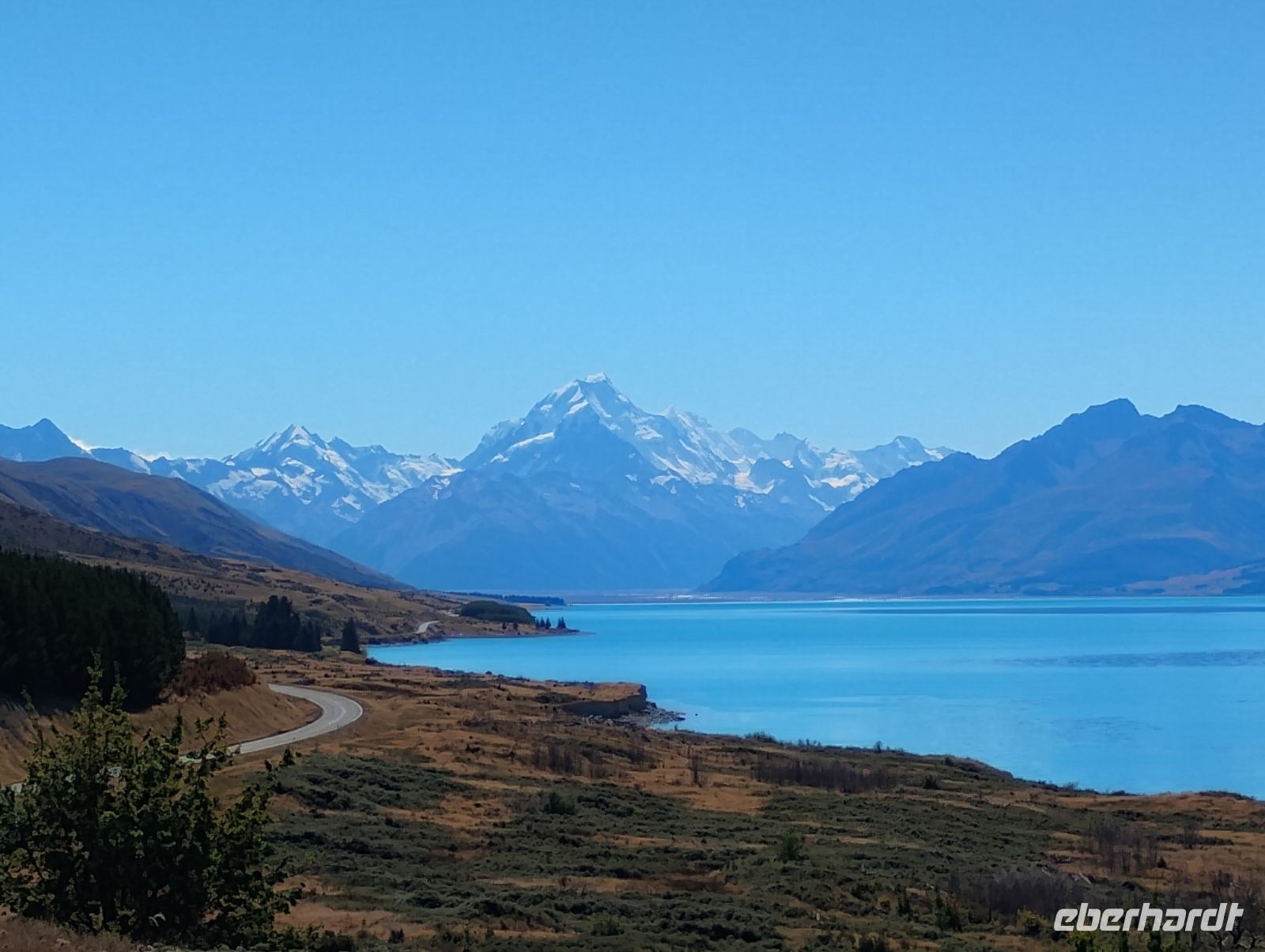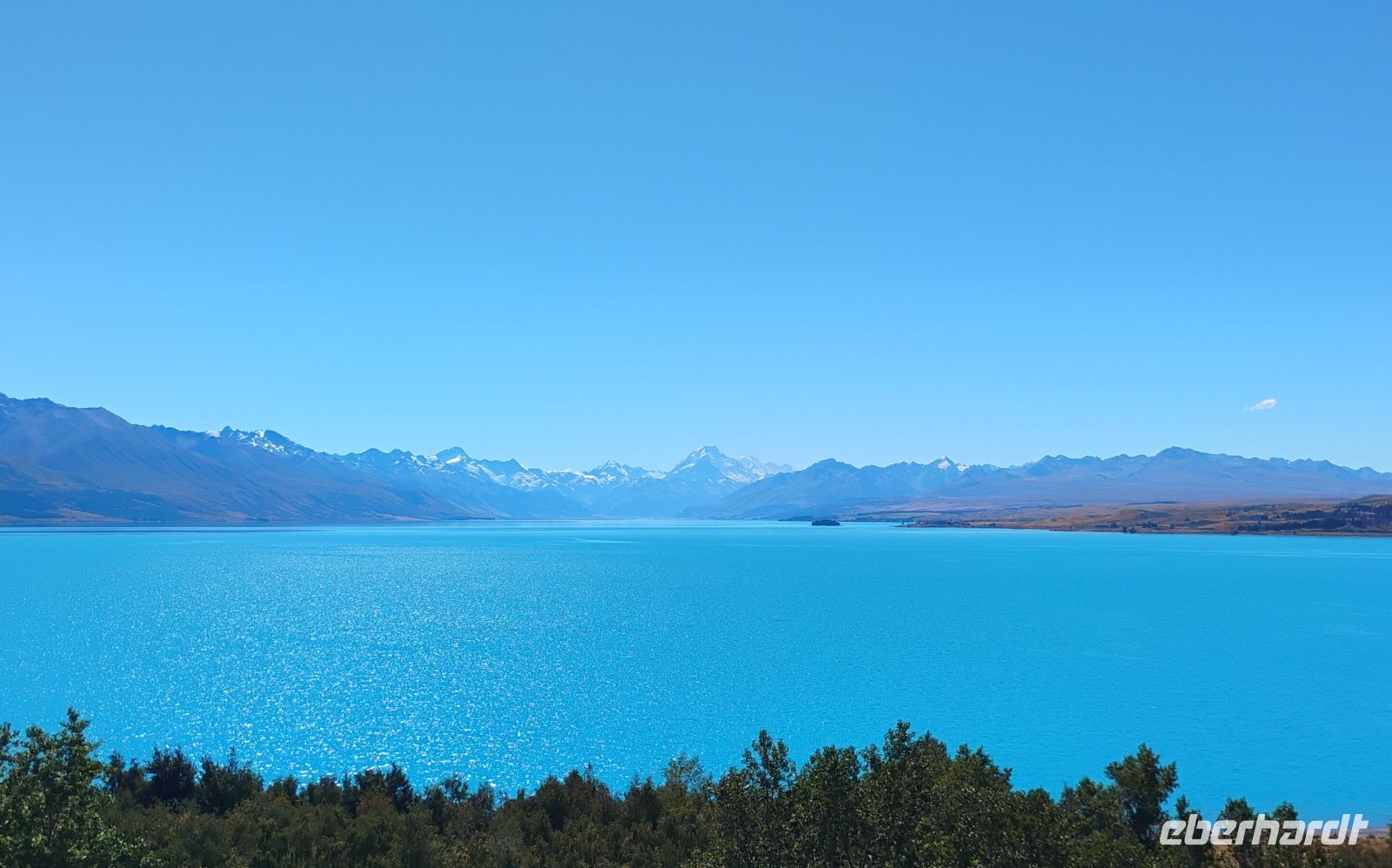 Bald erreichen wir den türkisblauen Lake Pukaki. Die intensive Farbe entsteht durch feinstes Gletschermehl im Wasser. Bei klarer Sicht zeigt sich am Ende des Sees sogar der höchste Berg Neuseelands, der Mount Cook mit seinen 3.724 Metern.