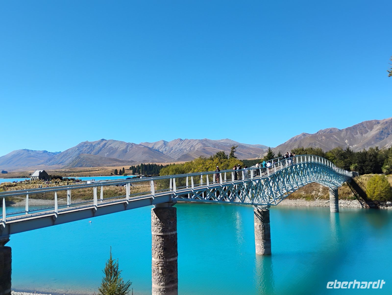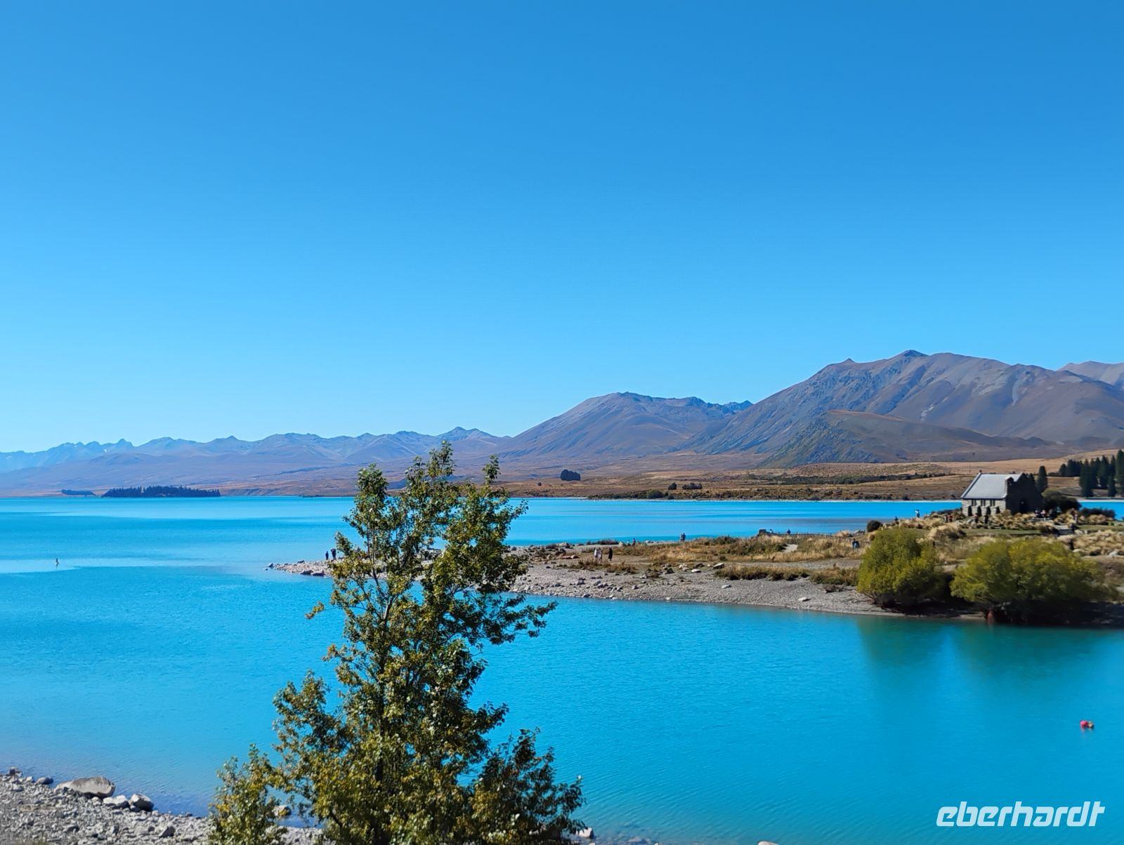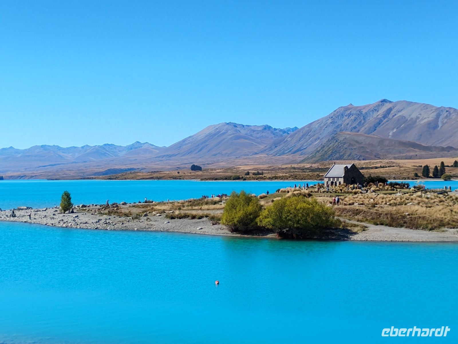 Nach einer Mittagspause im kleinen Ort Twizel fahren wir weiter zum Aussichtspunkt am Lake Pukaki, von wo sich ein besonders schöner Blick über den See und auf die Südalpen bietet. Wenig später erreichen wir den nächsten berühmten Gletschersee, den Lake Tekapo. Am Ufer steht die kleine steinerne Church of the Good Shepherd, eines der meistfotografierten Motive des Landes.