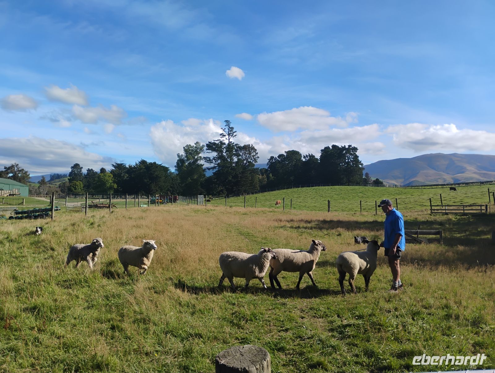 Am Nachmittag erreichen wir schließlich eine Farm in der Region um Fairlie. Hier erhalten wir spannende Einblicke in das Leben auf einer neuseeländischen Schaffarm. Zunächst lernen wir die Farmhunde kennen und sehen anschließend, wie unterschiedlich zwei Hütehundrassen arbeiten: der ruhig und konzentriert arbeitende Border Collie sowie der neuseeländische Huntaway, der die Schafe mit lautem Bellen antreibt.
