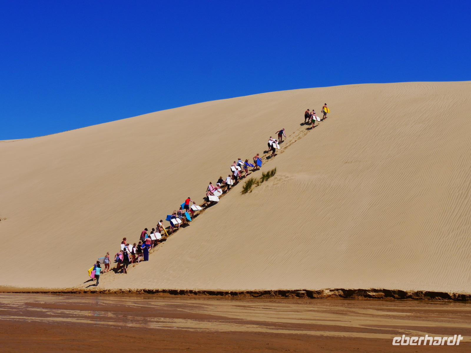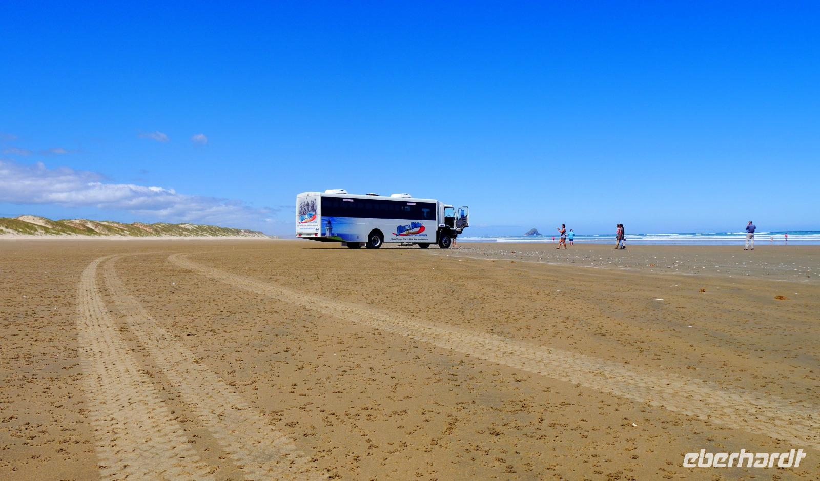 Die Bay of Islands bietet eine Vielfalt an Ausflugsmöglichkeiten. Bei einer Fahrt mit dem Katamaran zum Hole in the Rock bestehen gute Chancen, Delfine zu beobachten. Eine Ganztagestour zum Cape Reinga zeigt die Highlights des Northland. Die Route führt vorbei an grünen Weiden und Kiefernwäldern bis ganz in den Norden der Insel. Dieser Ort ist in der Mythologie der Maori von besonders spiritueller Bedeutung, denn hier beginnt die Reise der Seelen der Verstorbenen ins Jenseits. Hier, wo die Tasmanische See auf den Südpazifik trifft, befindet sich das Cape Reinga mit dem Leuchtturm. Die Kulisse aus leuchtend blauem Meer, grünem New Zealand Flax und weißen Sanddünen unter einem azurblauen Himmel bietet unendlich viele Fotomotive. Nach dem Mittagessen geht es bergab - im wahrsten Sinne des Wortes. Wer möchte, kann mit dem Boogie-Board die Sanddünen hinunter düsen... zwei Mal können wir in der Gruppe sogar das „Sandboarding-Diplom" verleihen ;-)! Die Gezeiten bestimmen, ob man auf dem Hin- oder Rückweg über den 90-Mile-Beach fährt. Für uns steht diese spektakuläre Etappe nun auf dem Programm. In den Dünen entdecken wir sogar Wildpferde und am Strand versuchen Angler ihr Glück beim Fischen. Einst war die Region durch endlose Moore (swamps) geprägt, in denen die bis zu zweitausend Jahre alten Kauribäume bestens konserviert wurden. Nach 45.000 Jahren im Untergrund wurden diese Baumriesen gefunden und geborgen. Auch das wertvolle Harz des Kauri (gum) hat zu Beginn des 19. Jahrhunderts viele Glücksritter an diesen Ort gezogen, der heute als Gumdigger Place bezeichnet wird. Im kleinen Örtchen Mangonui soll es eine der besten Fish & Chips Läden des ganzen Landes geben - davon wollen wir uns natürlich selbst überzeugen. Ein langer, aber aufregender Tag geht mit einem Bad im Meer oder einem leckeren Seafood-Abendessen zu Ende.