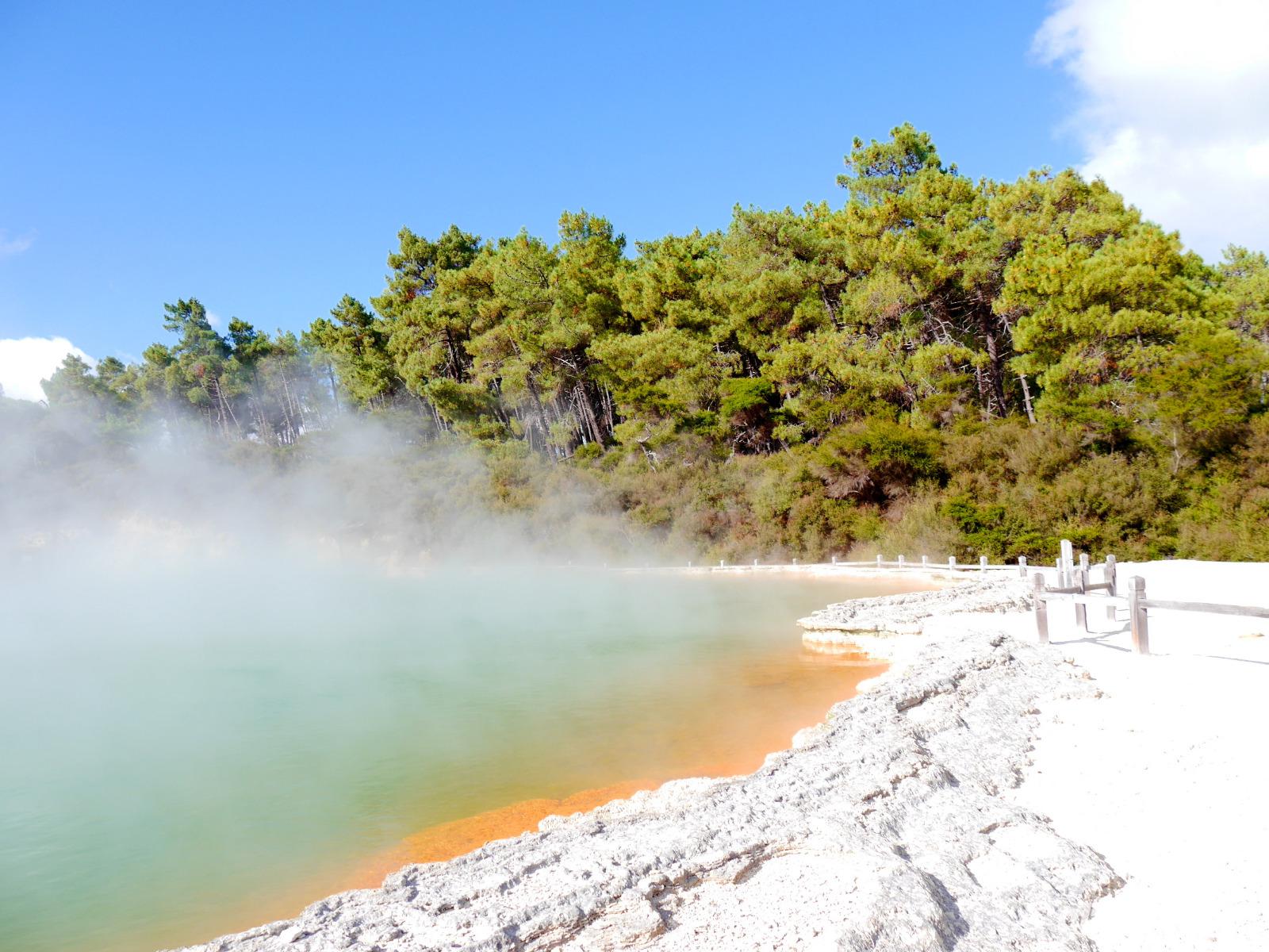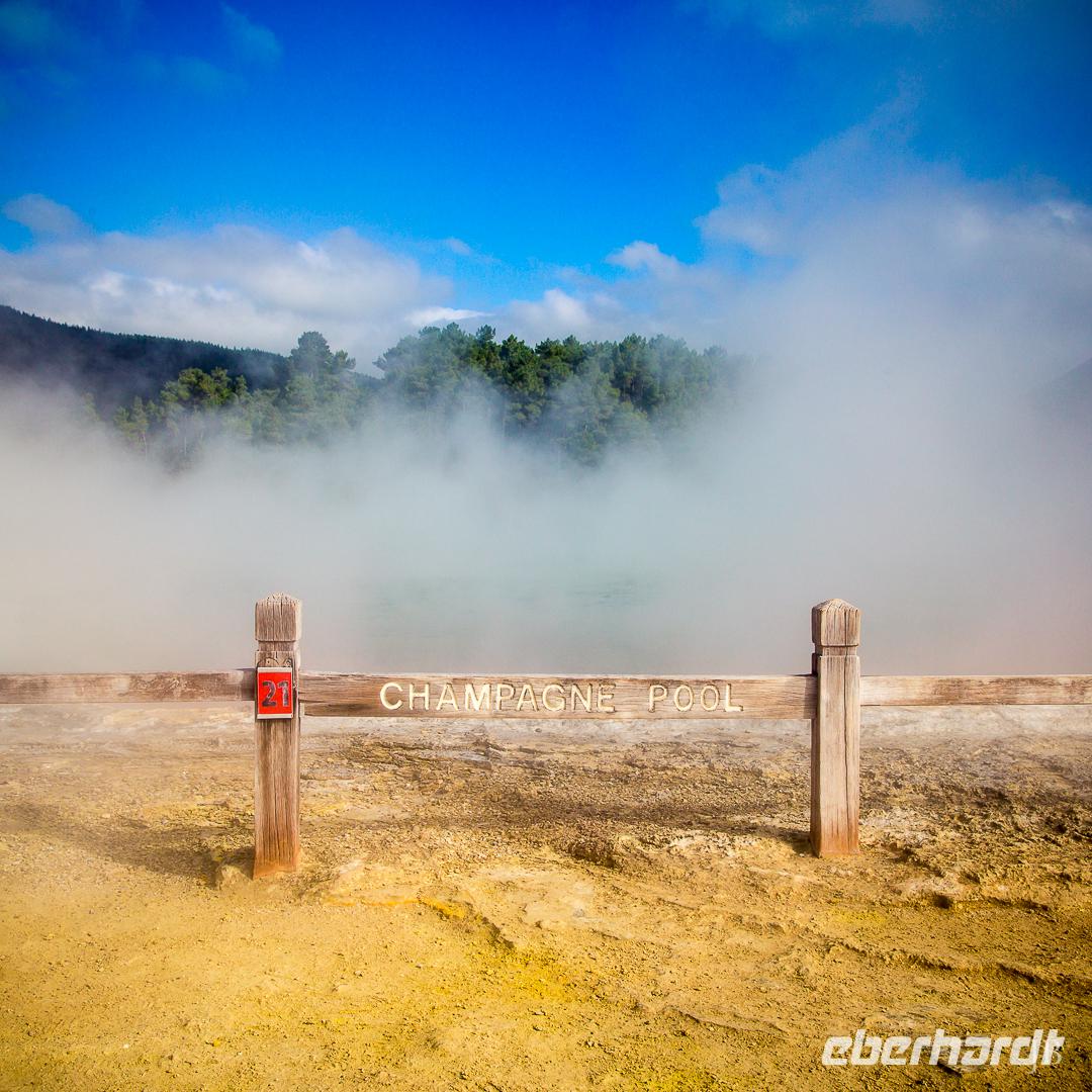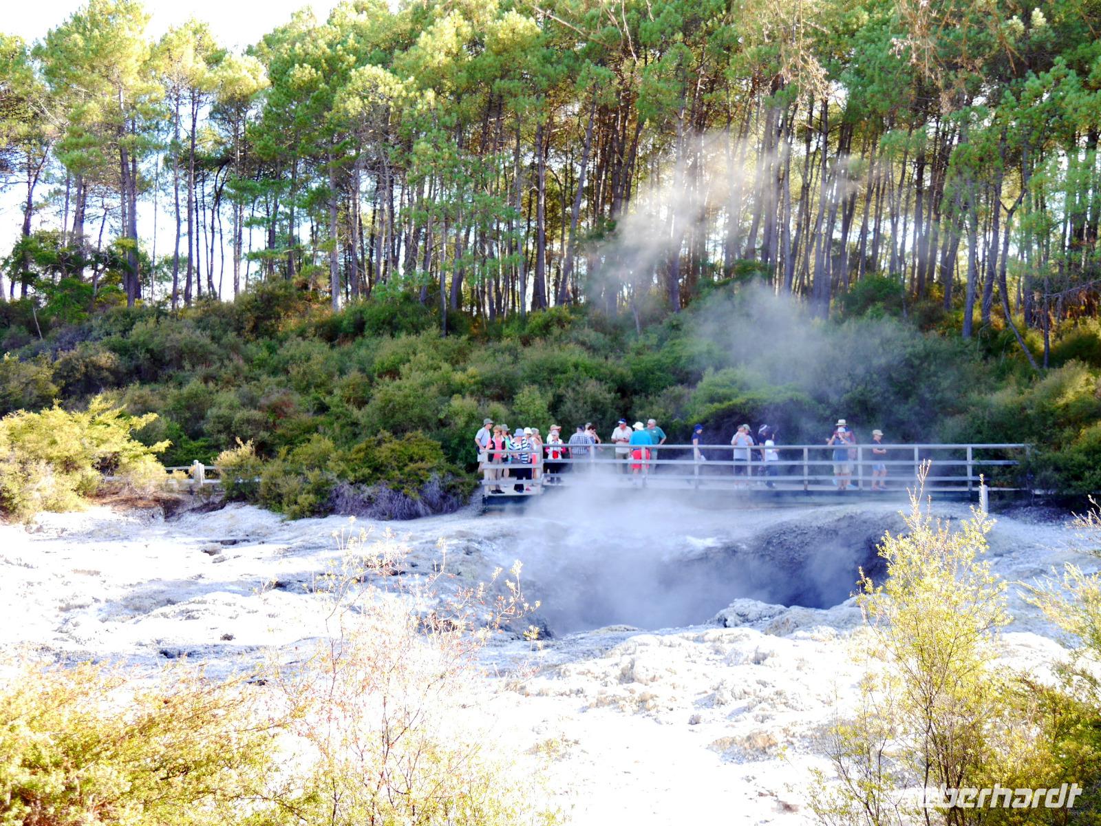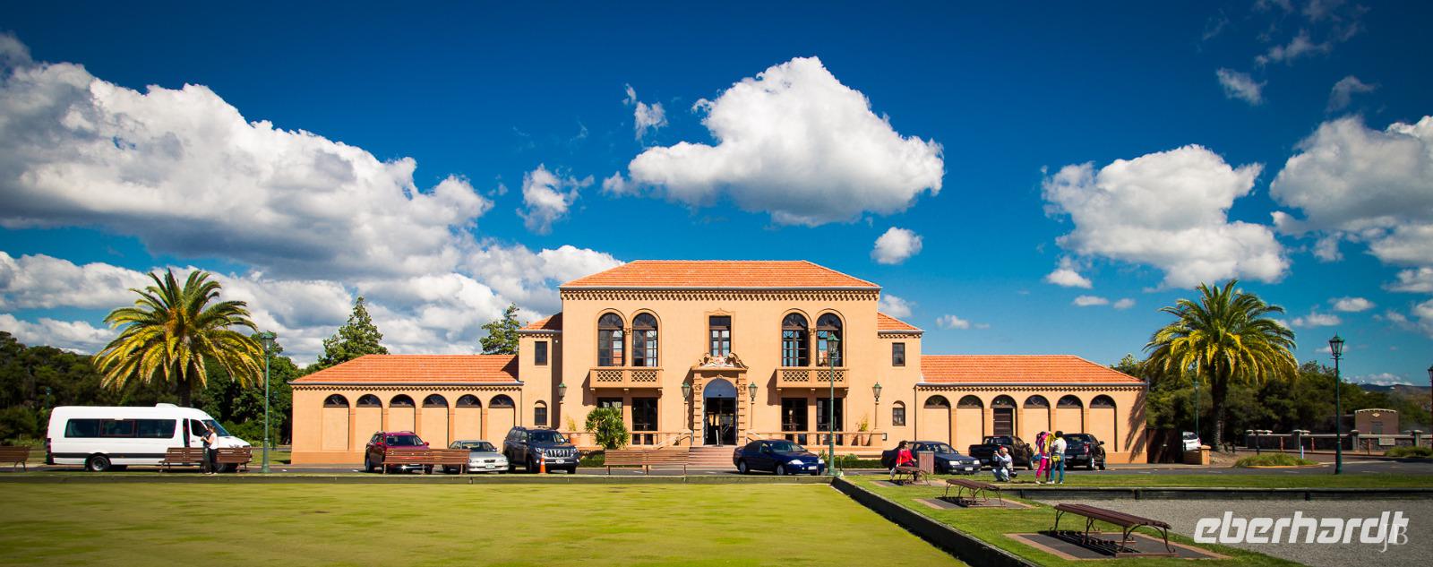 Im Großen und Ganzen gibt es zwei wichtige Gründe, Rotorua zu besuchen: geothermale Aktivitäten und Maori-Kultur. Ersteres bemerken wir spätestens ab dem Besuch der Government Gardens mit dem schmucken Badehaus von 1908. Hier bewahrheitet sich die landläufige Meinung, dass es in Rotorua immer etwas, sagen wir... unangenehm riecht. Der Abend steht ganz im Zeichen der Maori. Bei einem Hangi im Te Puia bekommen wir einen Eindruck von den Traditionen der Ureinwohner Neuseelands und auch das anschließende Essen, das zum Teil im Erdofen gegart wird, ist äußerst schmackhaft. Ein Krönchen wird diesem Tag später mit einem Bad im privaten Pool auf der Terrasse aufgesetzt. PS: Besonderer Dank gilt hier natürlich „unserem Praktikanten" alias Poolboy, Kofferträger, Film-Crew, Paparazzo, Pianist, gute-Laune-Macher etc. ;-)