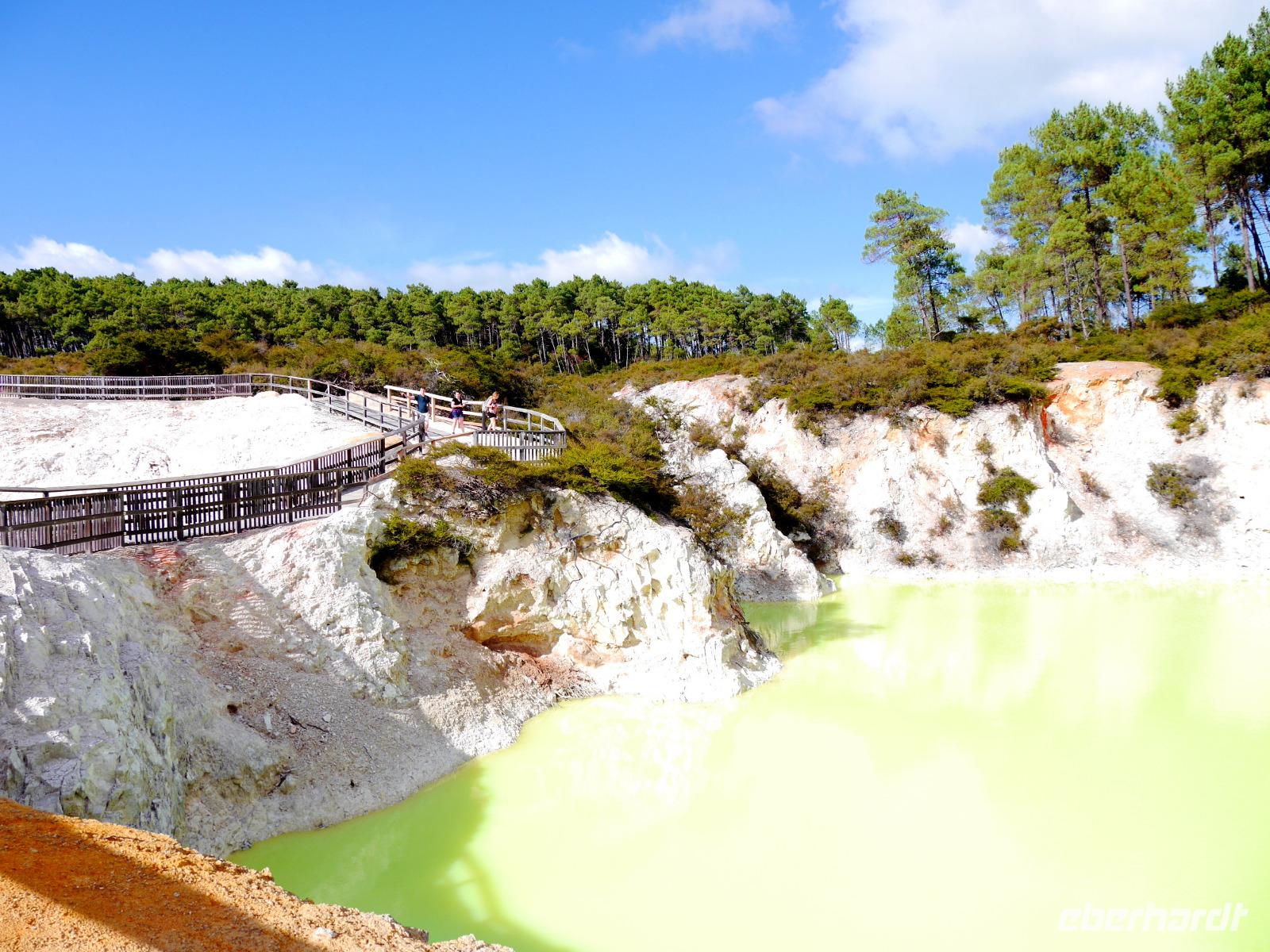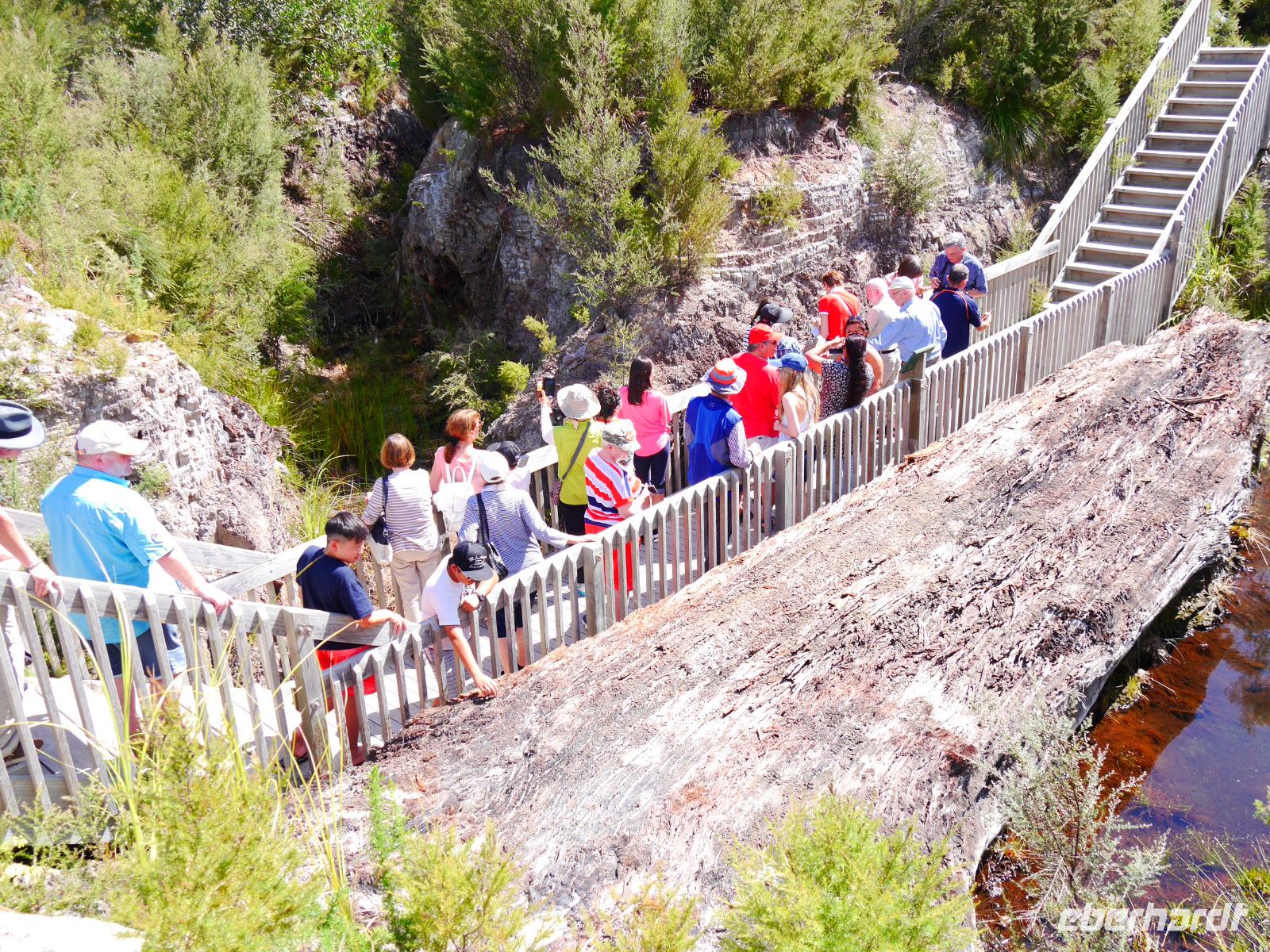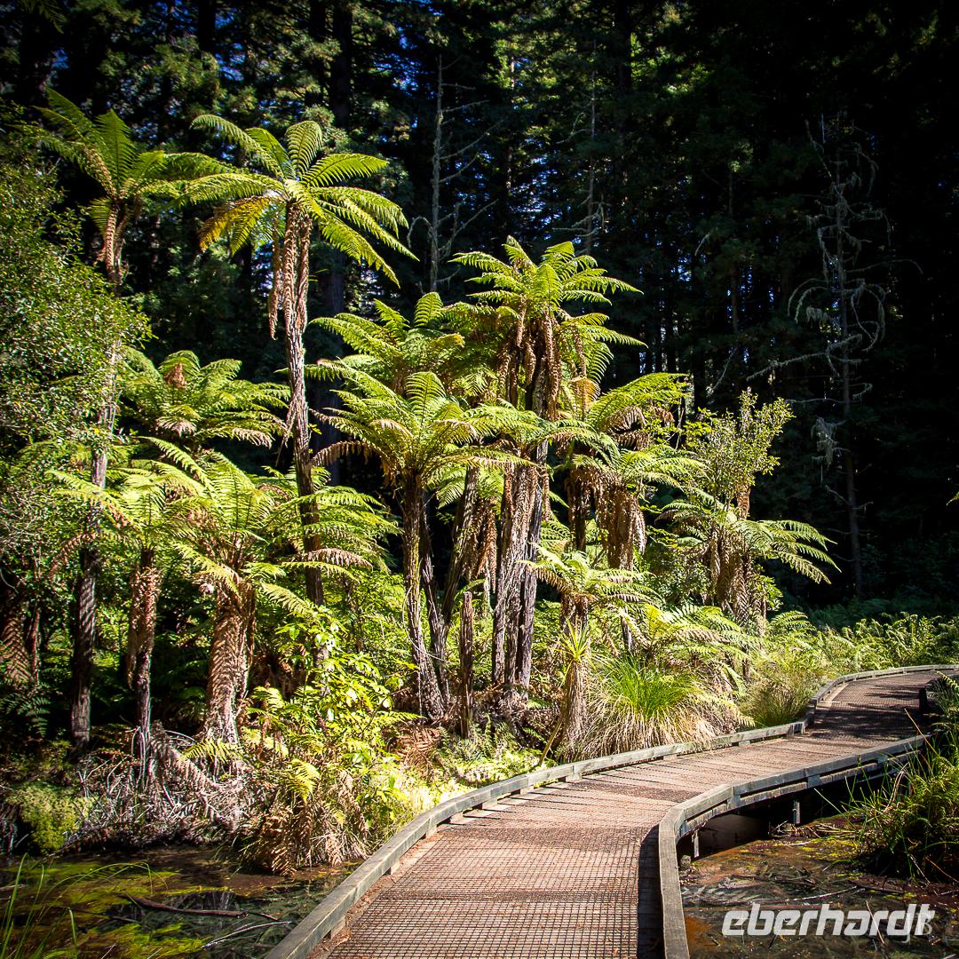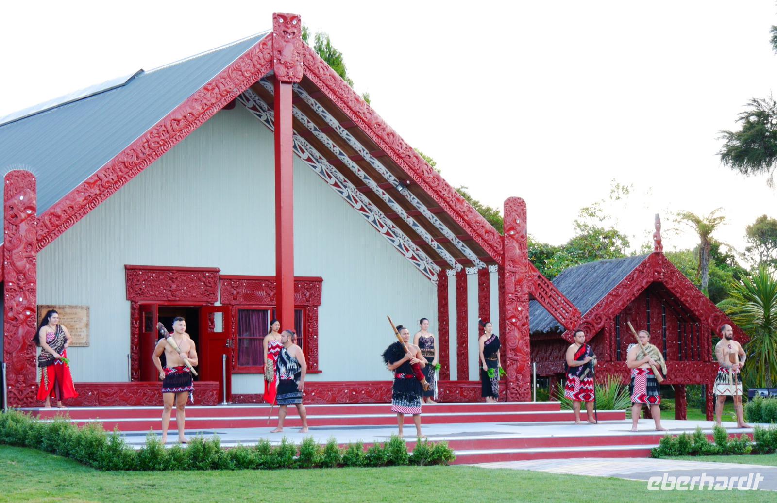 Im Großen und Ganzen gibt es zwei wichtige Gründe, Rotorua zu besuchen: geothermale Aktivitäten und Maori-Kultur. Ersteres bemerken wir spätestens ab dem Besuch der Government Gardens mit dem schmucken Badehaus von 1908. Hier bewahrheitet sich die landläufige Meinung, dass es in Rotorua immer etwas, sagen wir... unangenehm riecht. Der Abend steht ganz im Zeichen der Maori. Bei einem Hangi im Te Puia bekommen wir einen Eindruck von den Traditionen der Ureinwohner Neuseelands und auch das anschließende Essen, das zum Teil im Erdofen gegart wird, ist äußerst schmackhaft. Ein Krönchen wird diesem Tag später mit einem Bad im privaten Pool auf der Terrasse aufgesetzt. PS: Besonderer Dank gilt hier natürlich „unserem Praktikanten" alias Poolboy, Kofferträger, Film-Crew, Paparazzo, Pianist, gute-Laune-Macher etc. ;-)
