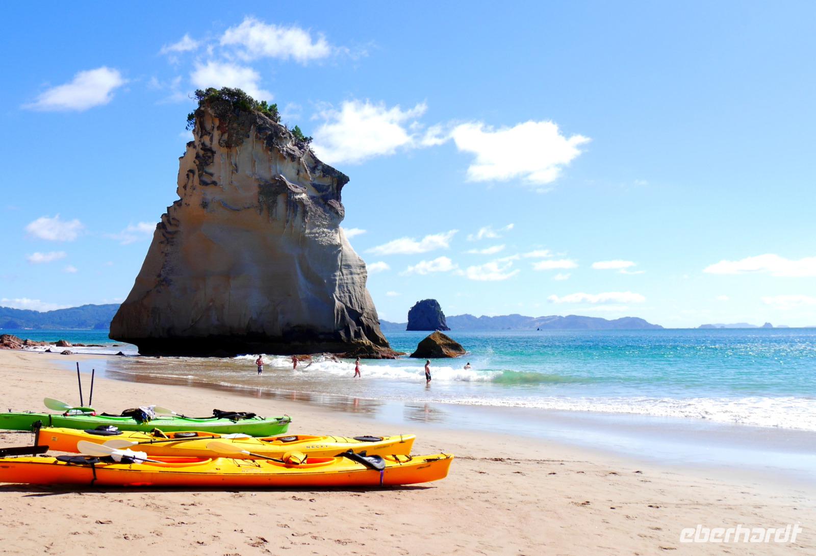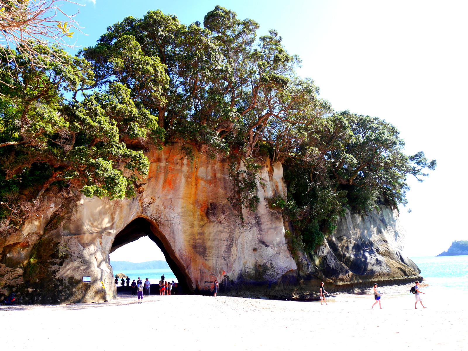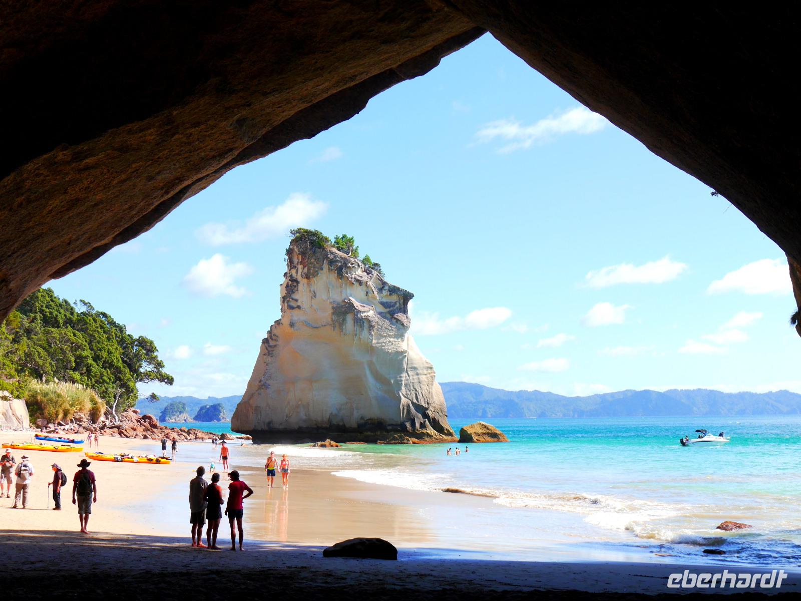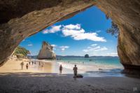 Coromandel hat nur wenige gerade Straßen... somit windet sich die Route entlang der Ostküste der zauberhaften Halbinsel zum Ausgangspunkt unserer kleinen Wanderung. Mit der Aussicht auf zahlreiche kleine Inseln und den leuchtend blauen Pazifik wandern wir hinab zum Strand und dem Felsentor Cathedral Cove - ein herrlicher Fleck zum Verweilen, Fotos schießen oder ein erfrischendes Bad zu nehmen. Nach der Mittagspause im kleinen Strandort Hahei geht es weiter zum Hot Water Beach. Mit Schaufel und vollstem Körpereinsatz ;-) buddeln uns die Männer einen Pool in den Sand, der sich mit warmen Wasser aus unterirdischen Quellen füllt. Wer möchte, erklimmt zum späten Nachmittag noch den Gipfel des Paku Hill, von wo sich ein fantastischer 360 Grad Rundumblick auf die Siedlung, die Boote, das Inlet und den Strand der beiden gegenüber liegenden Halbinseln bietet. Ein erlebnisreicher Tag findet seinen Ausklang bei Fish & Chips und einem Glas Wein. Was will man mehr?!