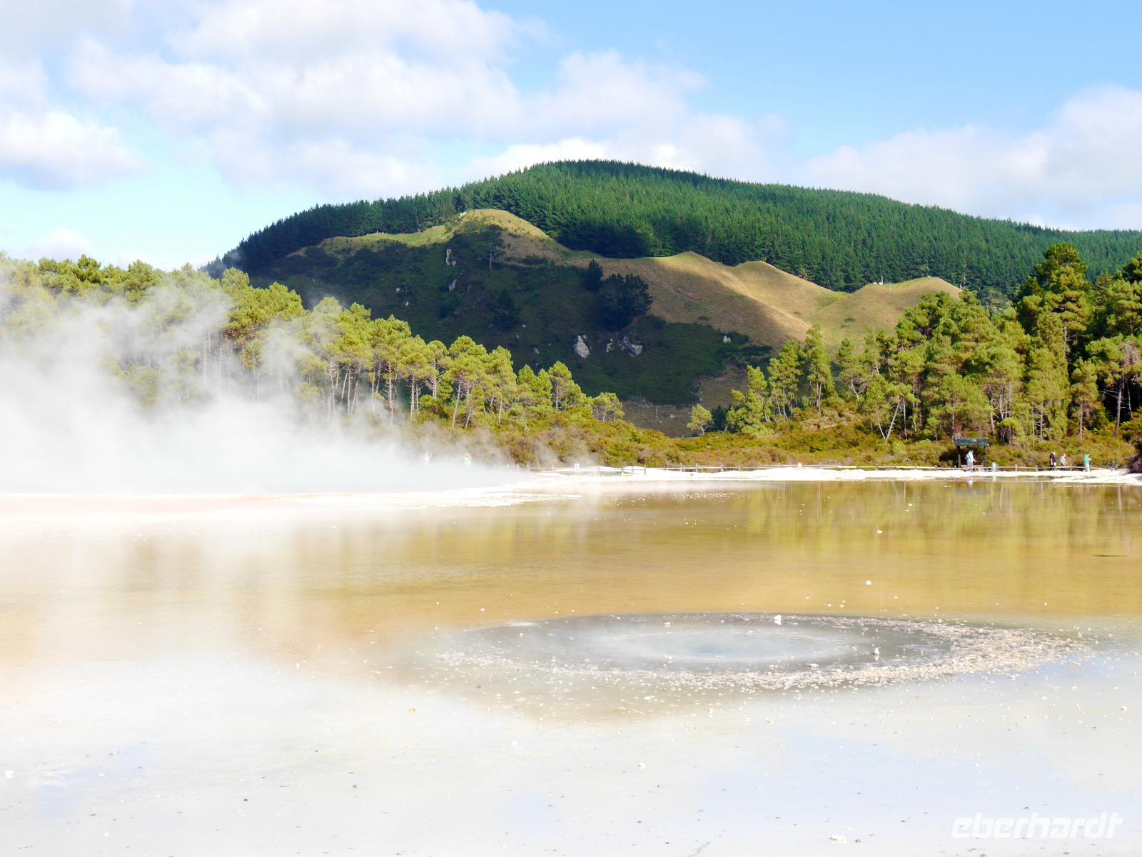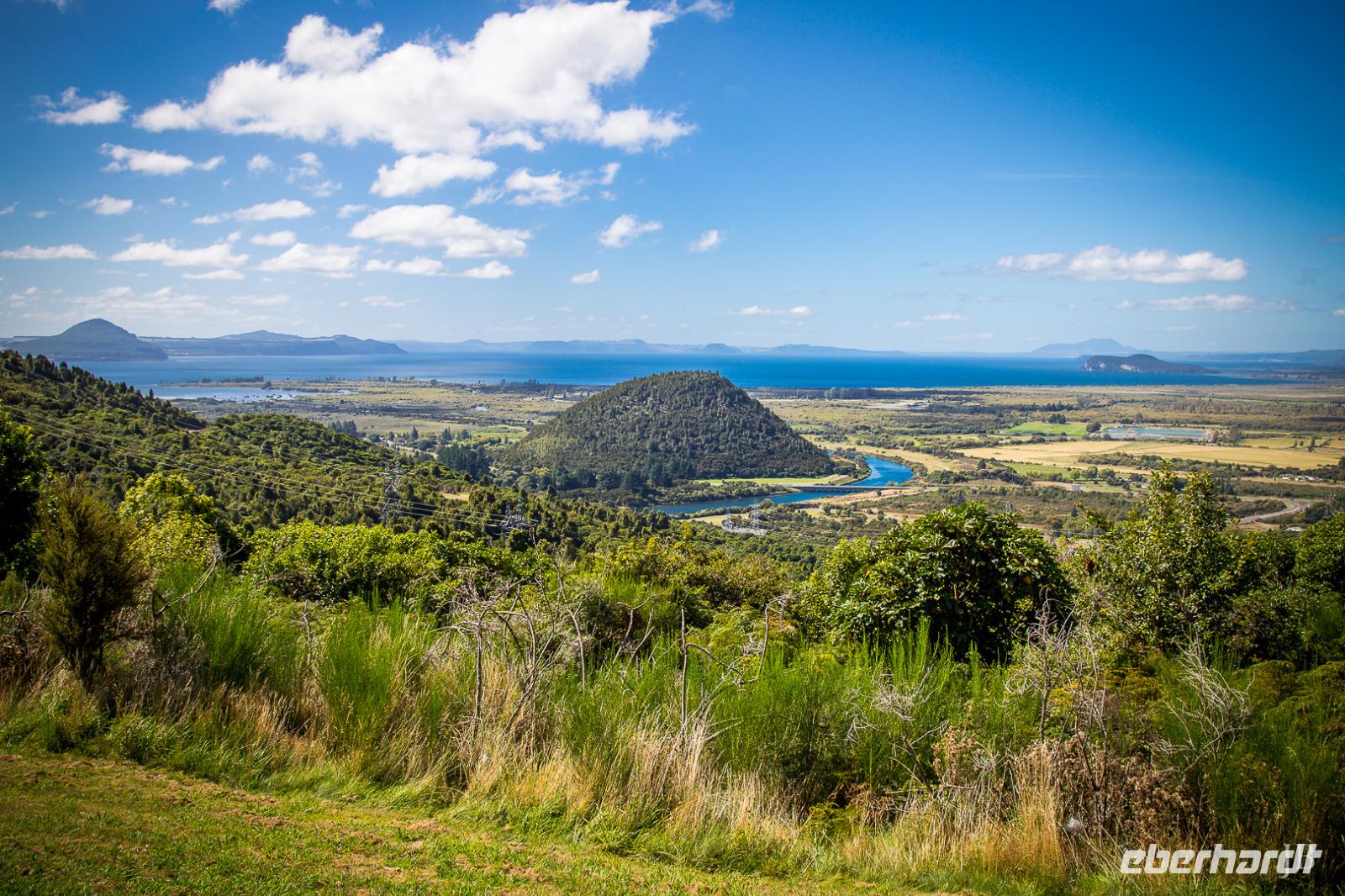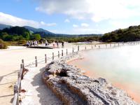 Die Region Waikato ist heute besonders durch die Milchwirtschaft (dairy farming) bekannt. Die früheren Kiefernwälder mussten aus ökonomischen Gründen den Kuhweiden weichen. Unser erster Stopp ist dem geothermalen Wunderland Wai-O-Tapu gewidmet. Das ganze Gebiet ist übersät mit kollabierten Kratern, heißen Seen, Schlammtümpeln und dampfenden Erdspalten, die so bildhafte Namen tragen wie Devils Home und Devils Bath (Heim und Bad des Teufels), Palette des Künstlers und Champagner Pool. Und tatsächlich hat die Natur hier ein kleines Kunstwerk der Farben und Formen geschaffen. Vorbei an Taupo und dem gleichnamigen See führt uns die Reise schließlich in eine völlig andere Welt - in die Welt der Vulkane. Auf ca. 1.200 Meter finden wir unsere gemütliche Herberge (das höchste Hotel Neuseelands) für die nächsten zwei Tage vor der Kulisse der mächtigen Feuerberge.