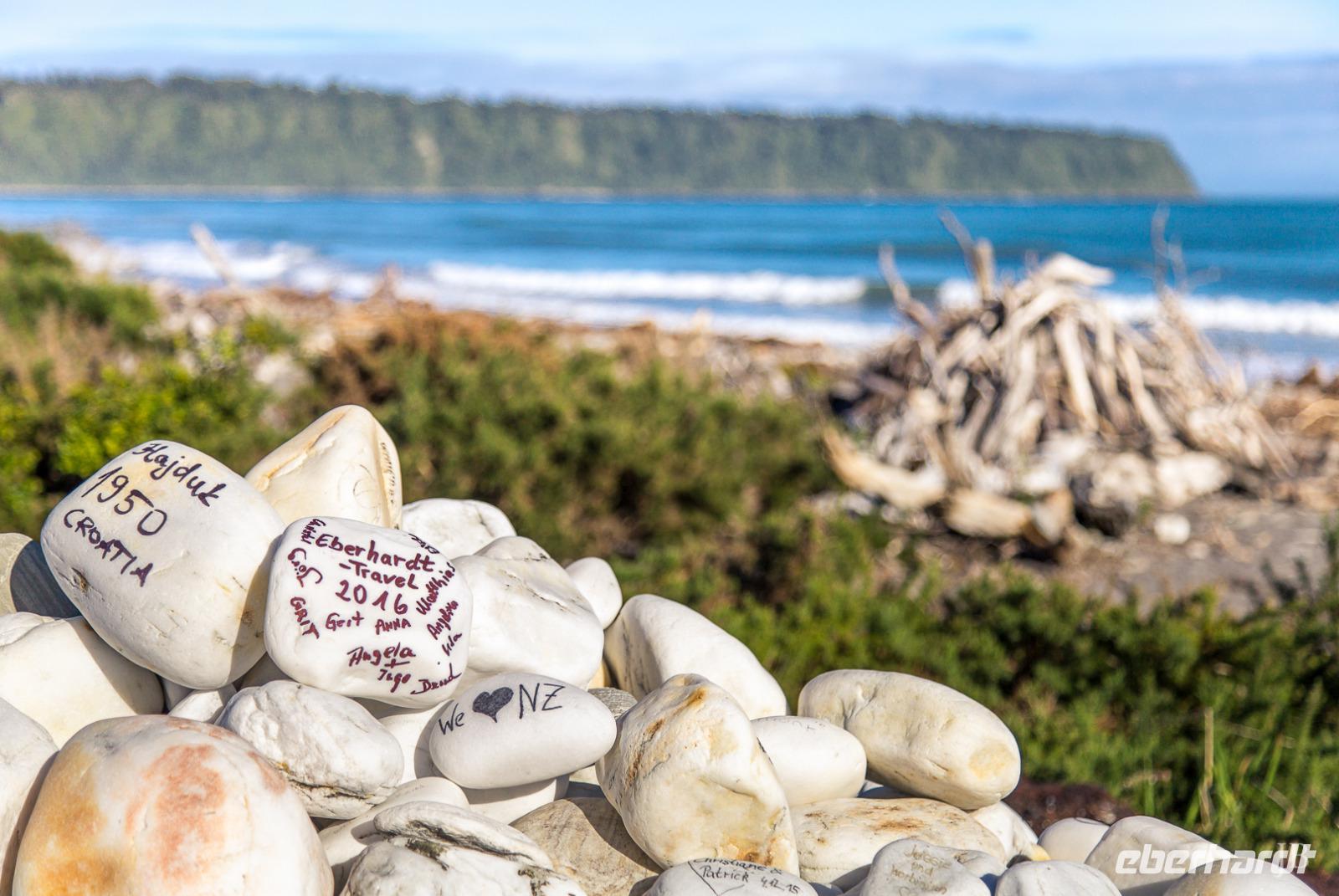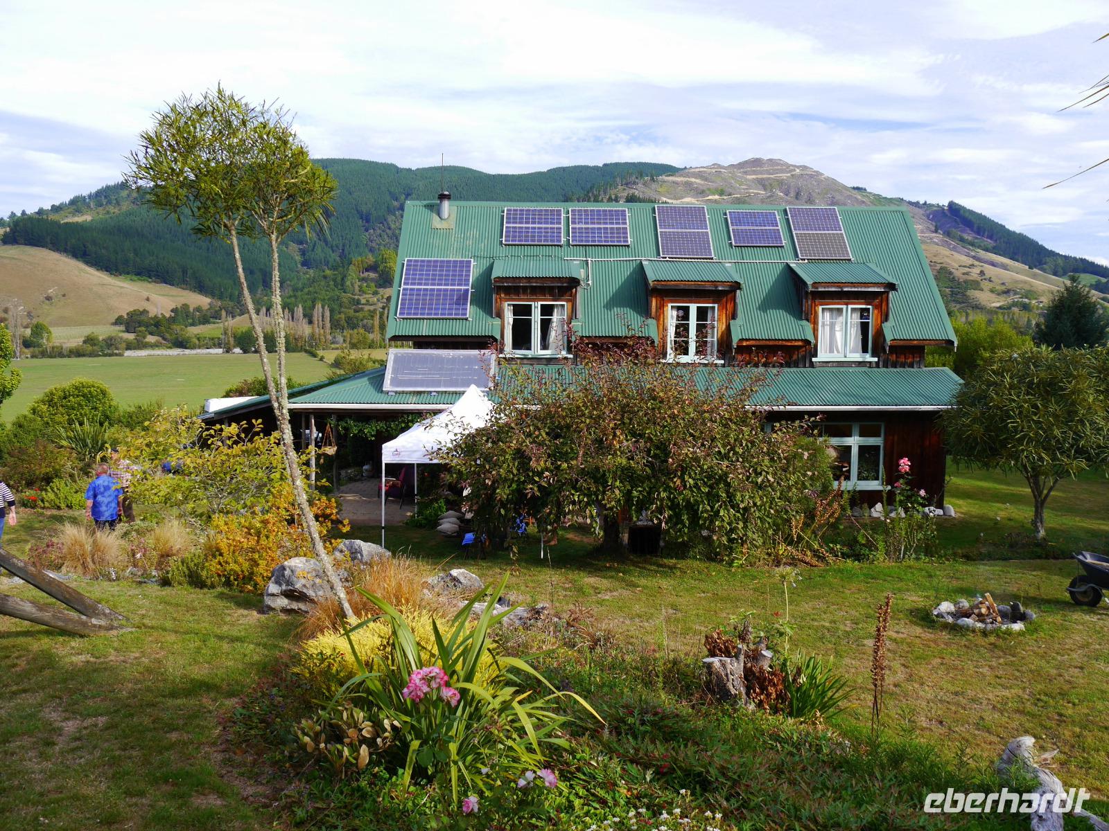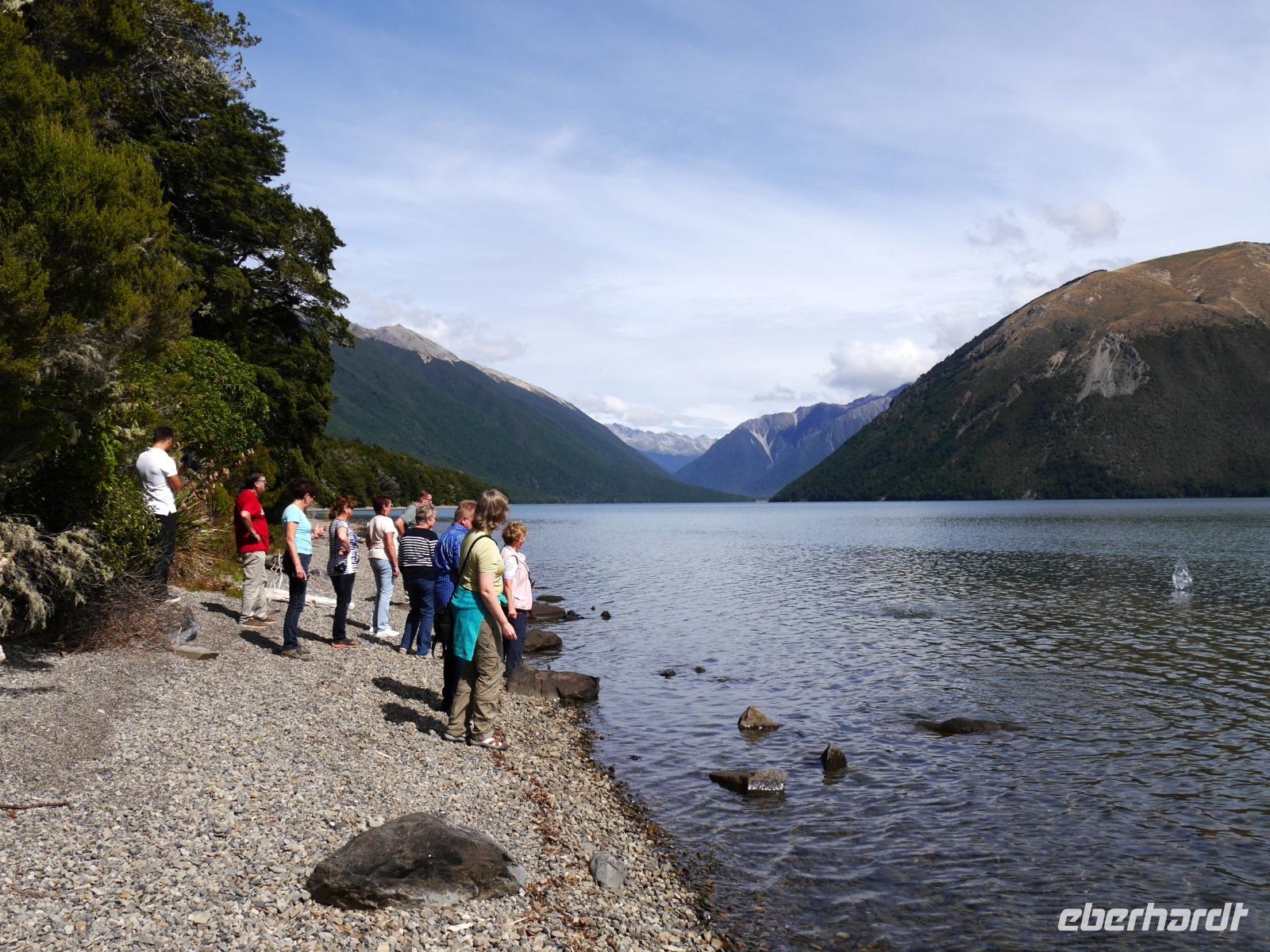 Heute geht unsere Reise weiter auf die Südinsel und wir freuen uns auf neue Abenteuer! Die Cook Strait beschert uns eine ruhige Überfahrt, so dass wir das Auslaufen aus dem Hafen von Wellington genießen können. Die Schifffahrt durch die Marlborough Sounds, einem Labyrinth aus Halbinseln und Inseln im Meer, gibt den gebührenden Auftakt für unseren zweiten Reiseabschnitt. Die Bäume und Sträucher strahlen im Sonnenlicht in unendlichen Schattierungen von Grün und das Wasser glitzert in tiefblau. Im Hafenstädtchen Picton rollen wir von Bord der Fähre und durchqueren bei Blenheim eines der wichtigsten Weinanbaugebiete Neuseelands (Marlborough). Vor der Kulisse der Richmond Range reihen sich die Reben malerisch aneinander. Schon jetzt bemerken wir, wie viel ruhiger es auf der Südinsel ist, schließlich lebt hier nur ein Viertel der Gesamtbevölkerung. Die Route führt uns durch St. Arnaud, wo wir einen Abstecher zum Lake Rotoiti unternehmen. Ein kurzer Spaziergang durch Südbuchenwald beschert uns ein wunderbares Willkommens-Konzert von Bellbird & Co. Bald geht es abseits jeglicher touristischer Routen, „off the beaten Track" wie der Neuseeländer sagt. Unser Ziel ist heute zu Hause... nicht unseres, sondern Bernd seins: der „Reiter-Tribe" heißt uns zu einem BBQ willkommen. So bekommen wir einen ganz privaten Eindruck vom Leben der Auswanderer... einfach gemütlich und besonders lecker. Vielen vielen Dank dafür!
