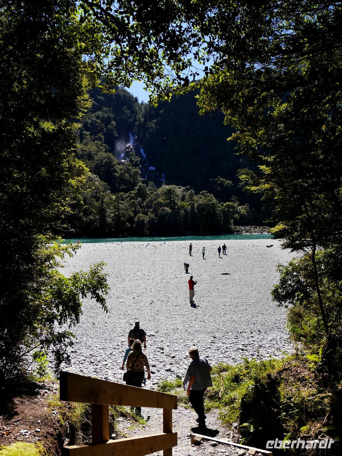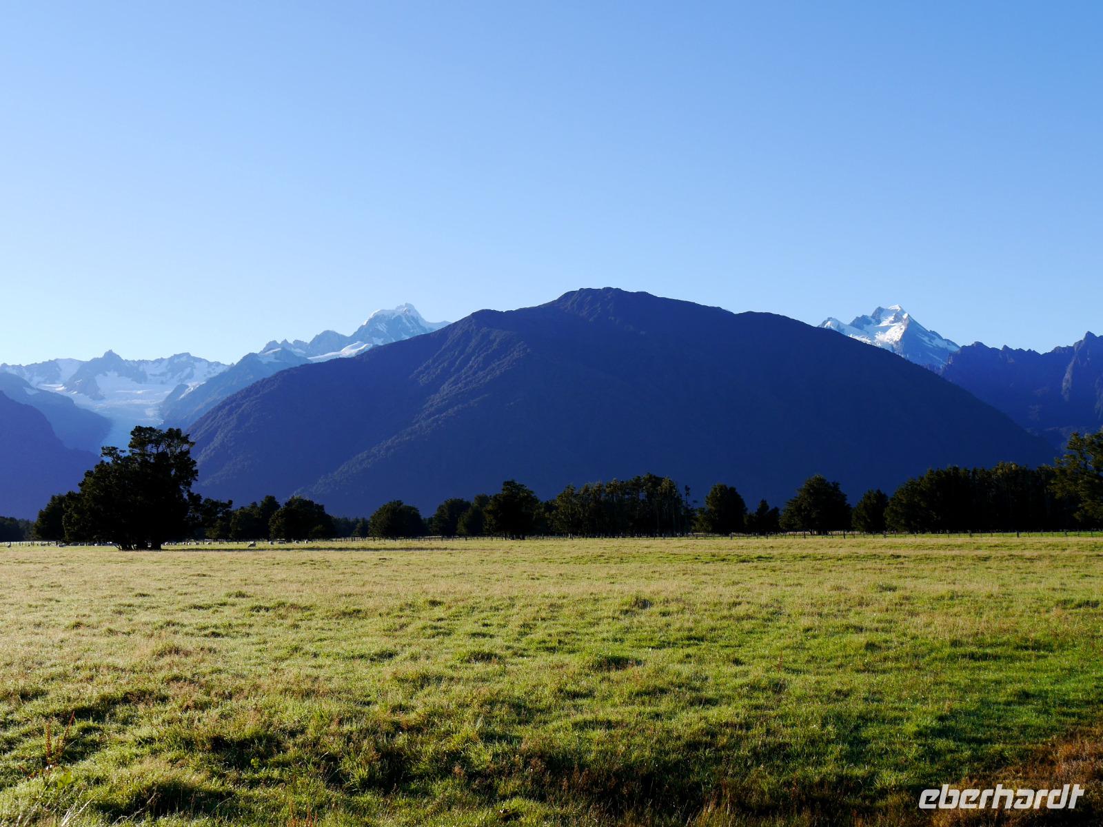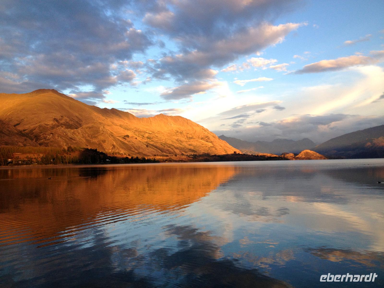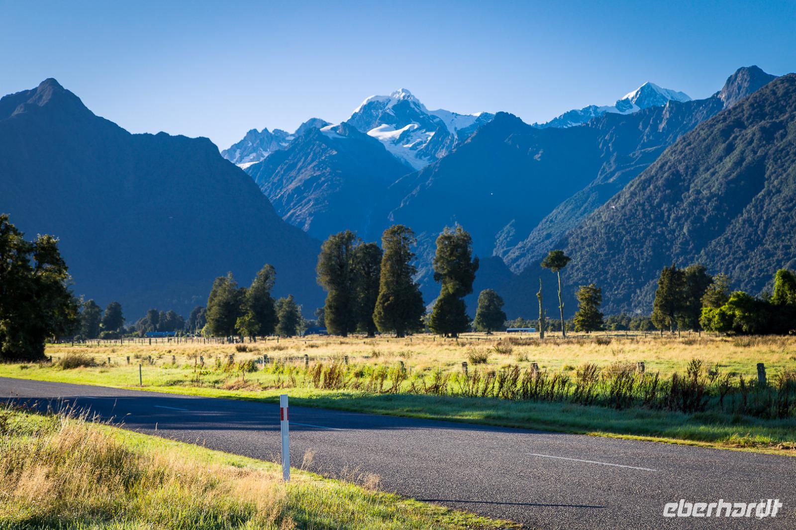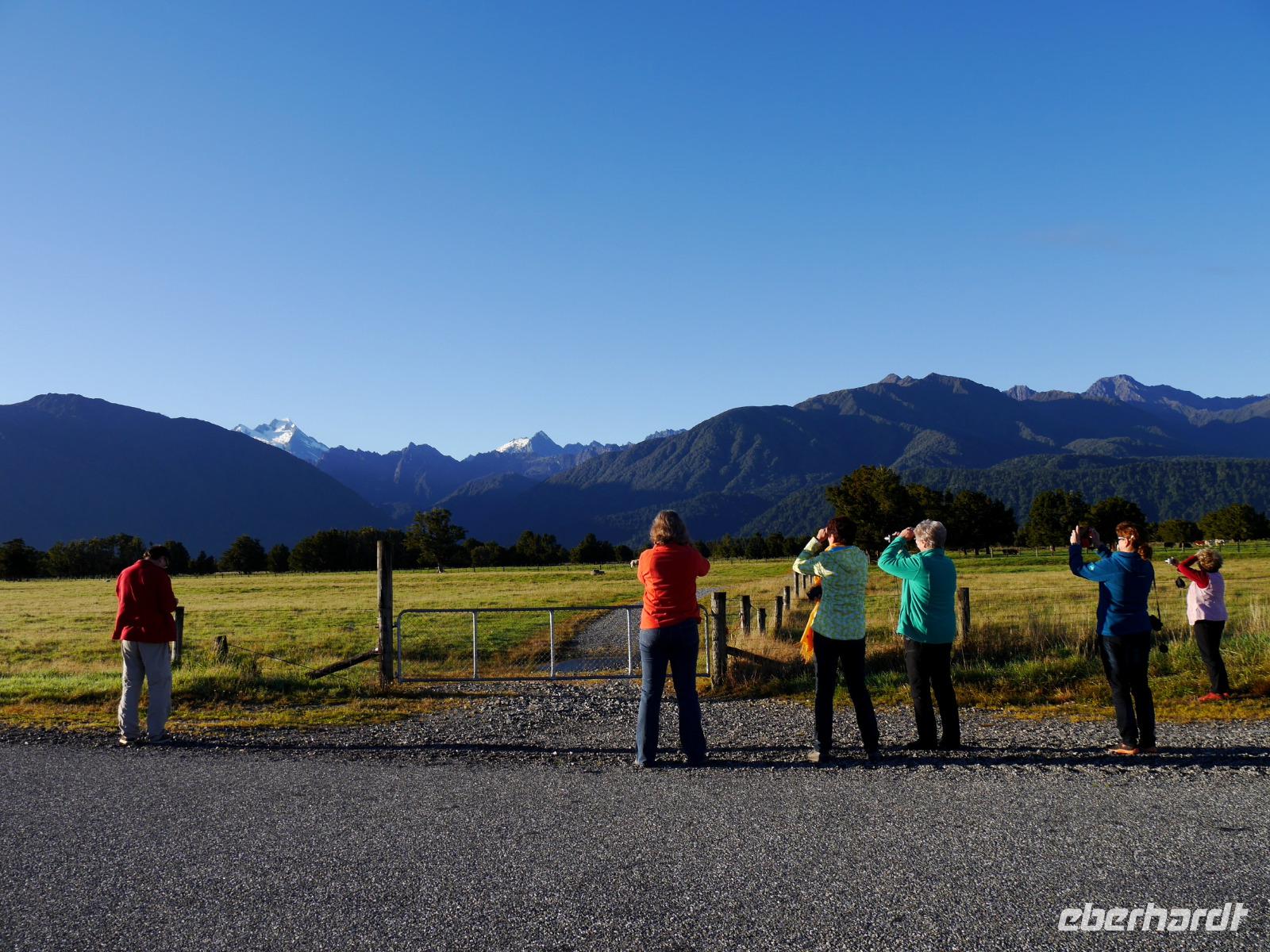 Es gibt nur wenige dieser Tage hier: blauer Himmel, die Sonne lacht vom Himmel und präsentiert uns Mount Cook (mit 3.724 Metern der höchste Berg im Südpazifik), Mount Tasman und die beiden Gletscherzungen Franz Josef und Fox in voller Pracht. Wenn selbst die örtlichen Reiseleiter Fotos schießen, will das schon was heißen! Das Westland gehört zu den am dünnsten besiedelten Regionen Neuseelands und bietet unendlich viel Natur. Bis zum Haast-Pass bewegen wir uns im Westland-Nationalpark, der wie der Fiordland-, Mount-Aspiring- und Mount Cook-Nationalpark auch zum Weltnaturerbe der UNESCO zählt (zusammen nehmen die vier Nationalparks 10% der Landesfläche ein). Nach kurzen Stopps am Strand (Achtung Sandflies!), am Lake Paringa und Knights Point spazieren wir zum Roaring Billing Wasserfall. Die Route führt uns mit fantastischen Landschaftsbildern weiter entlang des Haast River über den Haast-Pass, den mit 563 Meter tiefst gelegenen und südlichsten der drei Alpenpässe. Und mit einem Schlag ändert sich auch die Vegetation - das dominante Grün des Regenwaldes weicht den goldenen Ebenen und Berghängen von Central Otago. Bald passieren wir den Lake Wanaka und Lake Hawea und lassen uns von der beschaulichen Atmosphäre im kleinen Städtchen Wanaka einfangen. Diese malerische Kulisse verdient eine kleine Eberhardt-Fiesta und es darf gern zugegriffen werden! Überhaupt ist das Essen in Neuseeland (leider) viel zu gut ;-)... Lamm, Steak, Wild, Fisch und Meeresfrüchte kommen hier oft auf den Tisch.