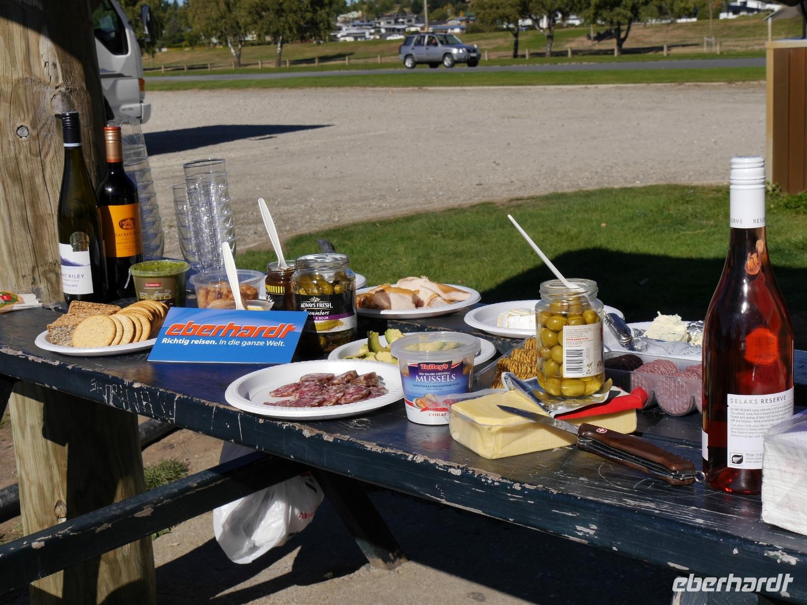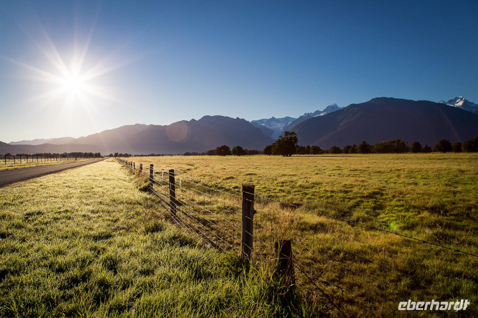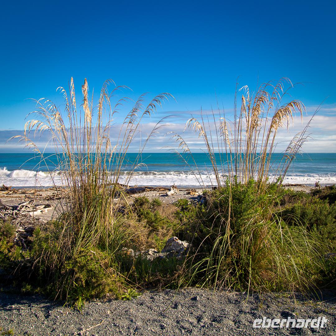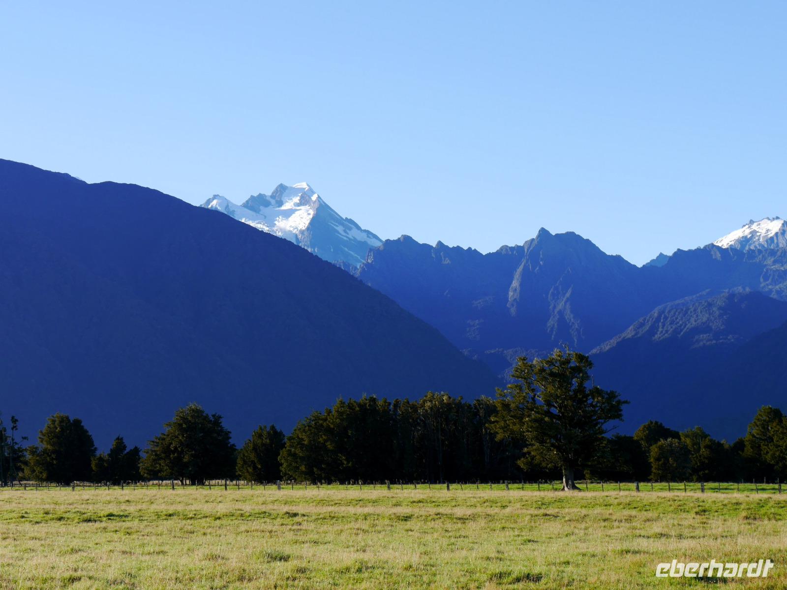 Es gibt nur wenige dieser Tage hier: blauer Himmel, die Sonne lacht vom Himmel und präsentiert uns Mount Cook (mit 3.724 Metern der höchste Berg im Südpazifik), Mount Tasman und die beiden Gletscherzungen Franz Josef und Fox in voller Pracht. Wenn selbst die örtlichen Reiseleiter Fotos schießen, will das schon was heißen! Das Westland gehört zu den am dünnsten besiedelten Regionen Neuseelands und bietet unendlich viel Natur. Bis zum Haast-Pass bewegen wir uns im Westland-Nationalpark, der wie der Fiordland-, Mount-Aspiring- und Mount Cook-Nationalpark auch zum Weltnaturerbe der UNESCO zählt (zusammen nehmen die vier Nationalparks 10% der Landesfläche ein). Nach kurzen Stopps am Strand (Achtung Sandflies!), am Lake Paringa und Knights Point spazieren wir zum Roaring Billing Wasserfall. Die Route führt uns mit fantastischen Landschaftsbildern weiter entlang des Haast River über den Haast-Pass, den mit 563 Meter tiefst gelegenen und südlichsten der drei Alpenpässe. Und mit einem Schlag ändert sich auch die Vegetation - das dominante Grün des Regenwaldes weicht den goldenen Ebenen und Berghängen von Central Otago. Bald passieren wir den Lake Wanaka und Lake Hawea und lassen uns von der beschaulichen Atmosphäre im kleinen Städtchen Wanaka einfangen. Diese malerische Kulisse verdient eine kleine Eberhardt-Fiesta und es darf gern zugegriffen werden! Überhaupt ist das Essen in Neuseeland (leider) viel zu gut ;-)... Lamm, Steak, Wild, Fisch und Meeresfrüchte kommen hier oft auf den Tisch.