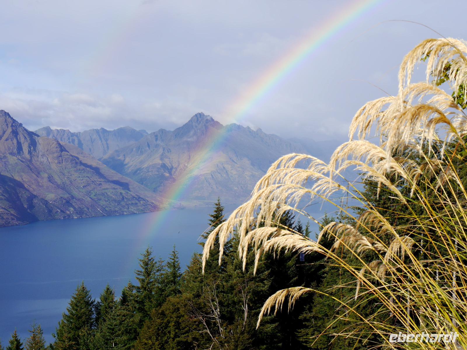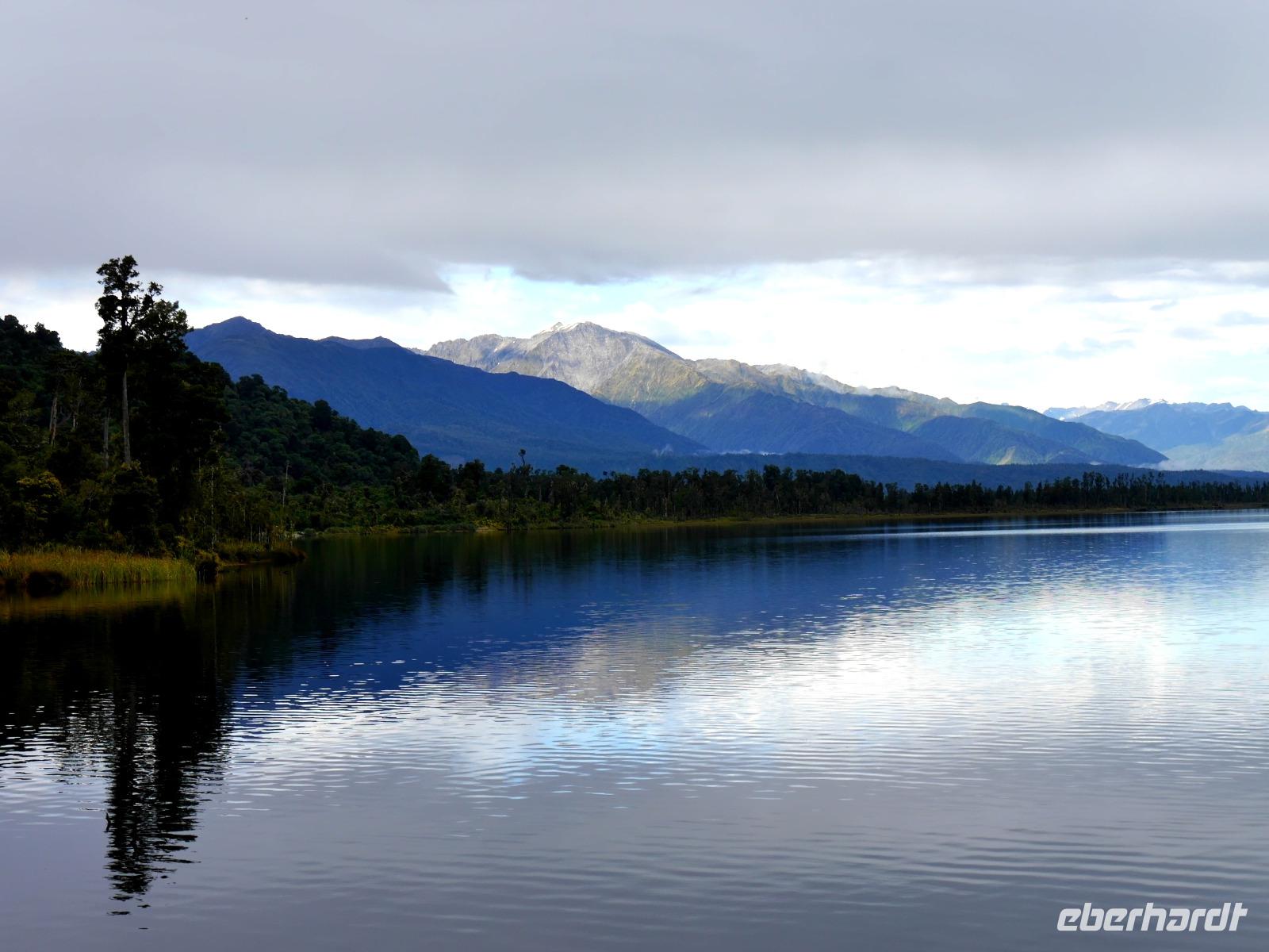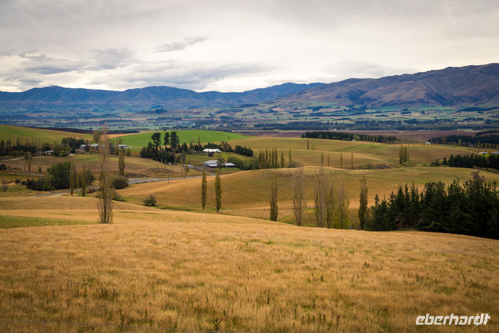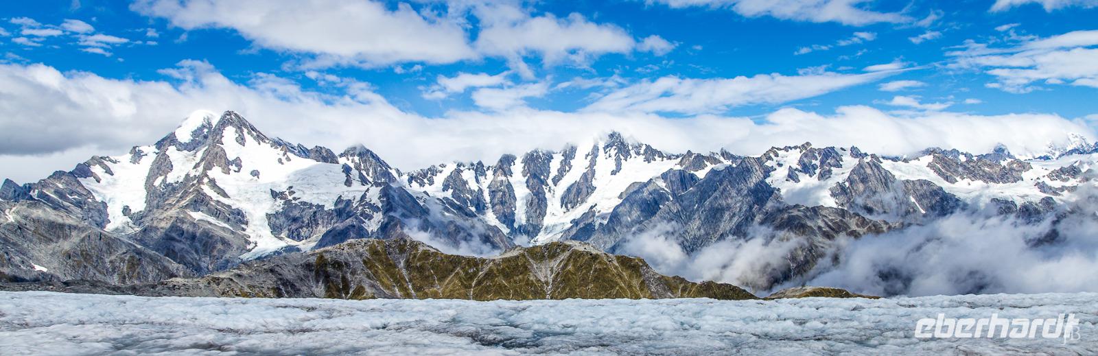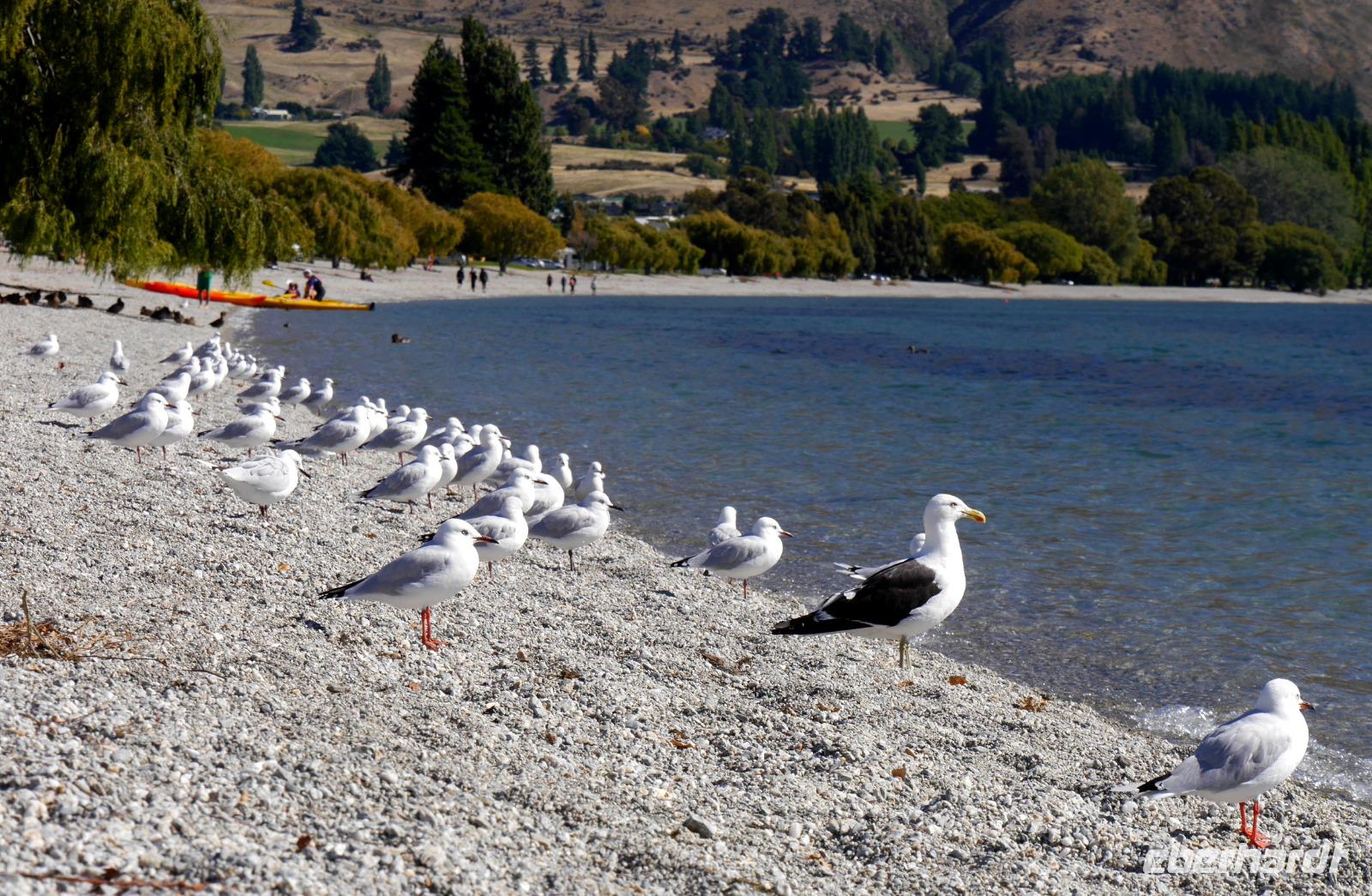 Es gibt nur wenige dieser Tage hier: blauer Himmel, die Sonne lacht vom Himmel und präsentiert uns Mount Cook (mit 3.724 Metern der höchste Berg im Südpazifik), Mount Tasman und die beiden Gletscherzungen Franz Josef und Fox in voller Pracht. Wenn selbst die örtlichen Reiseleiter Fotos schießen, will das schon was heißen! Das Westland gehört zu den am dünnsten besiedelten Regionen Neuseelands und bietet unendlich viel Natur. Bis zum Haast-Pass bewegen wir uns im Westland-Nationalpark, der wie der Fiordland-, Mount-Aspiring- und Mount Cook-Nationalpark auch zum Weltnaturerbe der UNESCO zählt (zusammen nehmen die vier Nationalparks 10% der Landesfläche ein). Nach kurzen Stopps am Strand (Achtung Sandflies!), am Lake Paringa und Knights Point spazieren wir zum Roaring Billing Wasserfall. Die Route führt uns mit fantastischen Landschaftsbildern weiter entlang des Haast River über den Haast-Pass, den mit 563 Meter tiefst gelegenen und südlichsten der drei Alpenpässe. Und mit einem Schlag ändert sich auch die Vegetation - das dominante Grün des Regenwaldes weicht den goldenen Ebenen und Berghängen von Central Otago. Bald passieren wir den Lake Wanaka und Lake Hawea und lassen uns von der beschaulichen Atmosphäre im kleinen Städtchen Wanaka einfangen. Diese malerische Kulisse verdient eine kleine Eberhardt-Fiesta und es darf gern zugegriffen werden! Überhaupt ist das Essen in Neuseeland (leider) viel zu gut ;-)... Lamm, Steak, Wild, Fisch und Meeresfrüchte kommen hier oft auf den Tisch.