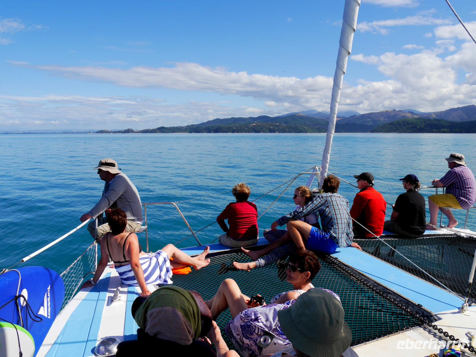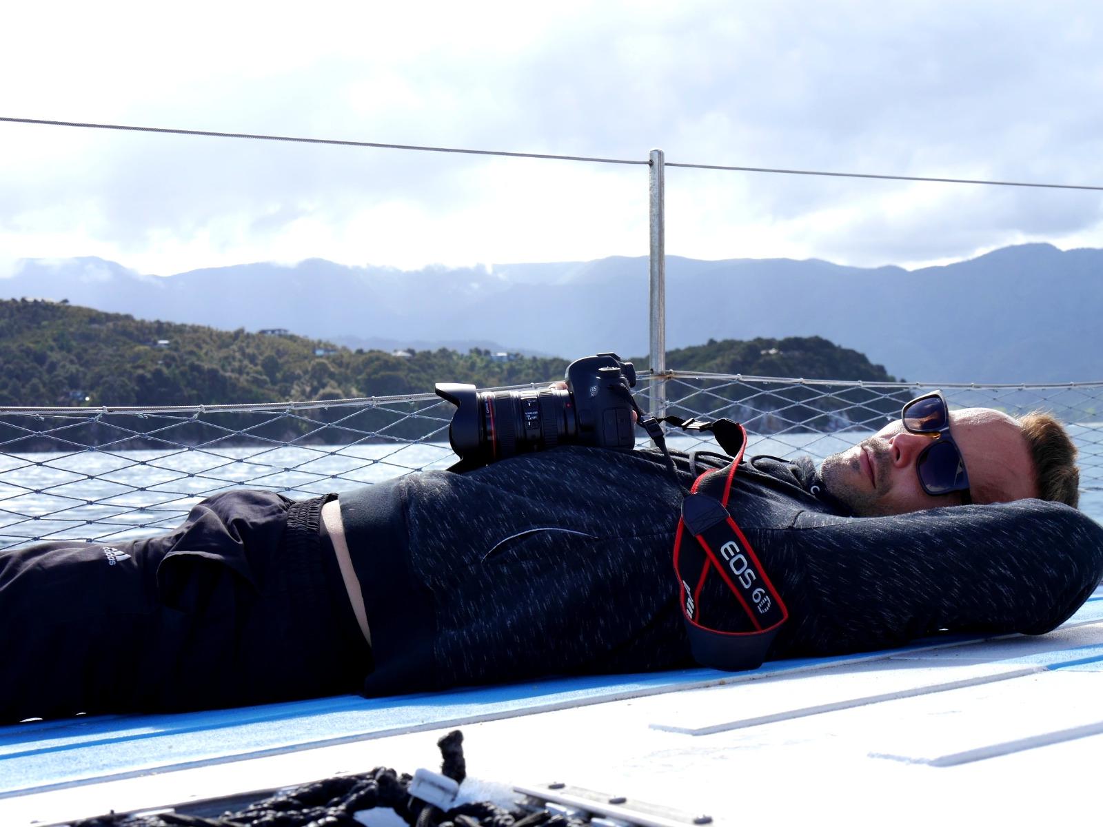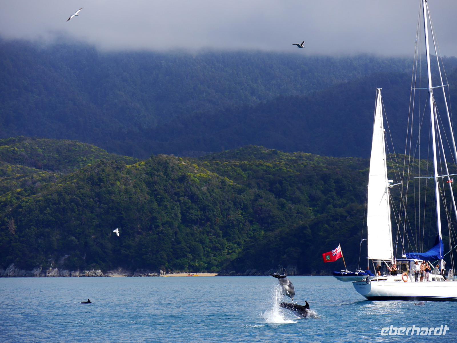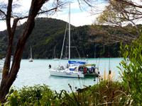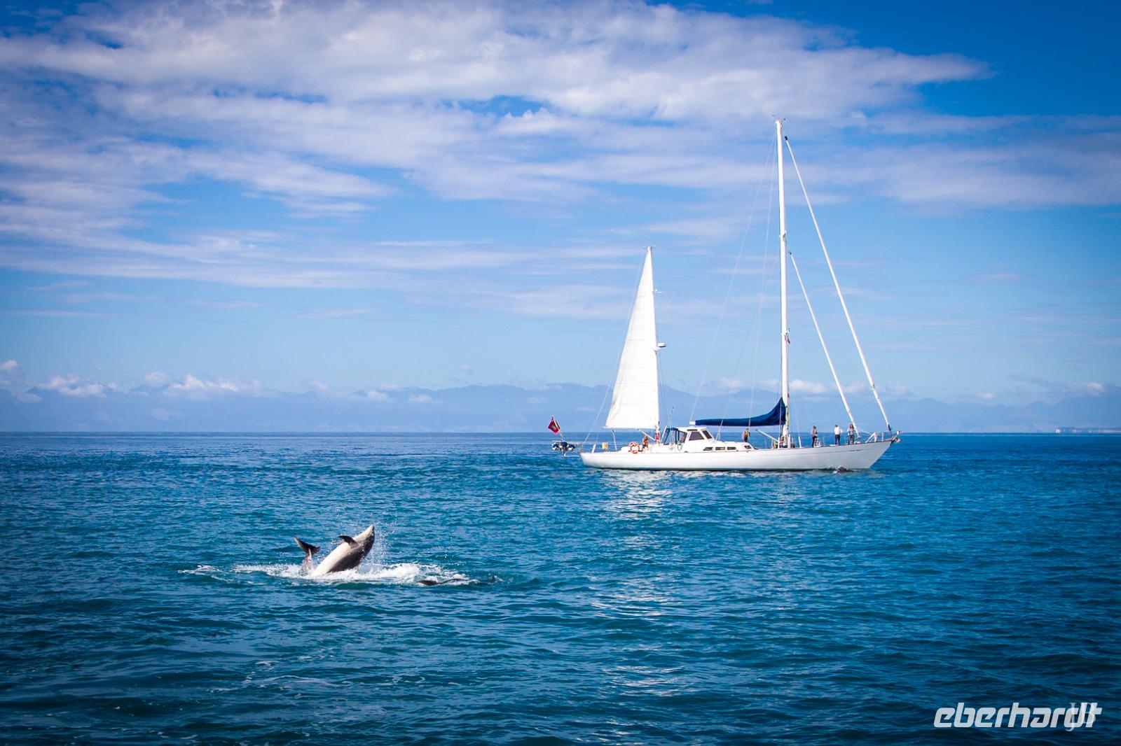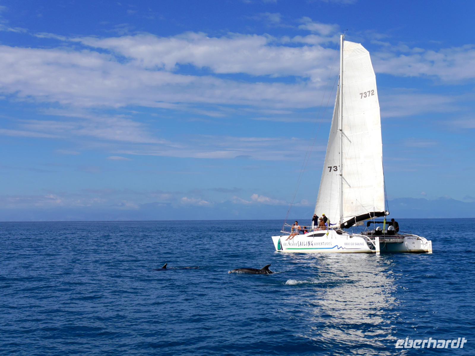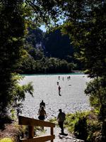 So schön ist Neuseeland - goldgelbe Sandstrände und türkisfarbenes Meer! Willkommen im Abel Tasman Nationalpark! Nach kurzer Fahrt von Motueka erreichen wir diese sonnenverwöhnte Gegend im Norden der Südinsel. In Kaiteriteri steigen wir vom Bus auf den eigens für uns gecharterten Katamaran und unser Skipper Martin schippert mit uns entlang der traumhaften Küste. Es ist ein perfekter Tag zum Segeln: ruhige See, herrliches Wetter UND plötzlich tauchen auch noch Delfine auf! Ein Schule Großer Tümmler begleitet unser Boot - sie schwimmen in der Bugwelle, springen und tauchen unter uns durch. Ein unvergessliches Erlebnis! Wer den Sprung ins Wasser wagt, kann sogar mit den sanften Tieren schwimmen! In der Te Puketea Bay gehen wir schließlich vor Anker. Wer mag nimmt ein Bad im Meer oder unternimmt eine kurze Wanderung durch einen herrlichen Wald aus Baumfarnen, Südbuchen und Manuka zur Anchorage Bay. Zwischen dem Grün der Bäume leuchtet das Meer und die goldenen Strände. Nach dem leckeren Mittagessen an Bord bietet sich bei Flut noch einmal die Gelegenheit zum Baden oder Standup Paddeling. Auf der Rückfahrt passieren wir das Vogelschutzgebiet Adele Island und wir haben neben dem „bird singing" noch einmal tolle Ausblicke auf die wunderbare Landschaft! Am Abend kehren wir zurück nach Motueka zur Übernachtung.