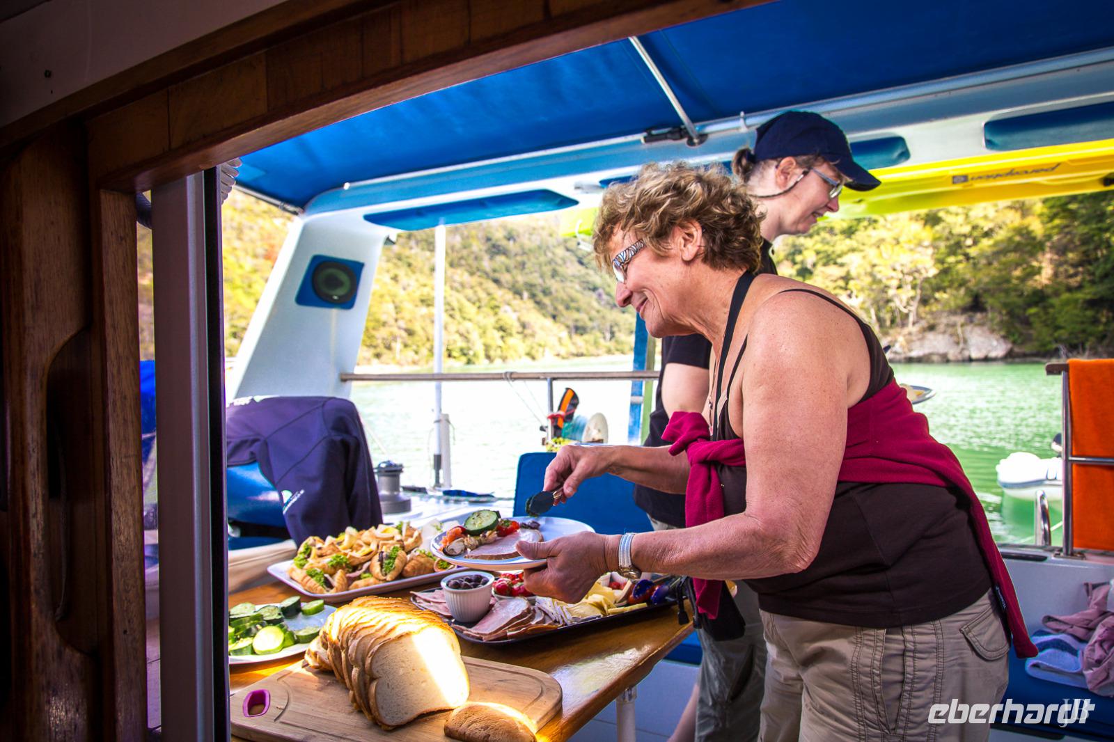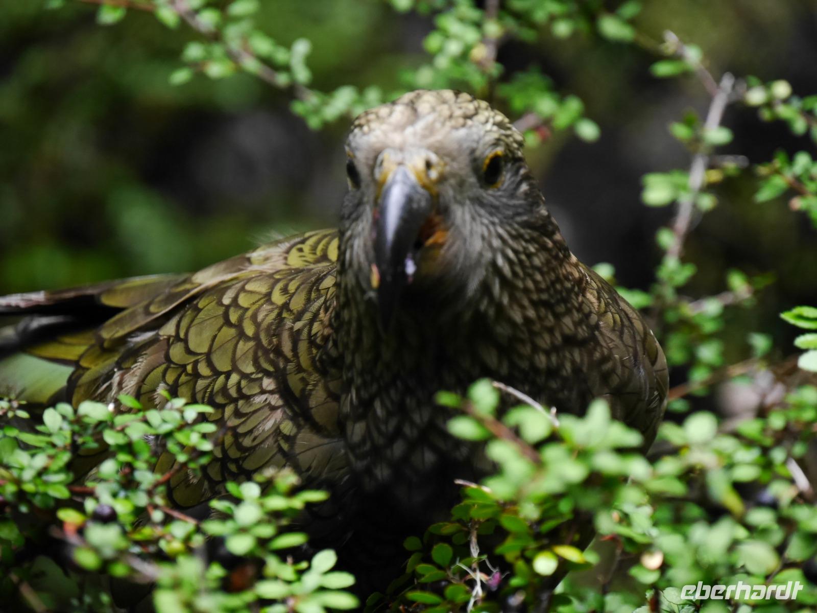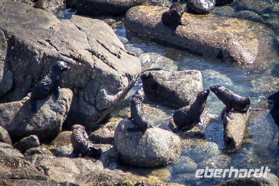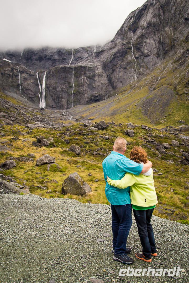 Zur gewohnten Zeit geht es los in Te Anau mit Ziel Milford Sound, einem weiteren Höhepunkt unserer Reise. Für die knapp 120 km lange Strecke von Te Anau haben wir genügend Zeit, um auf dem Weg einige Fotostopps einzulegen: vom Lake Te Anau mit seiner umgebenden Gebirgskette über die Milford Road geht es entlang des Eglinton River durch das gleichnamige Tal in eine subalpine Wunderwelt. Nach den vergangenen regenreichen Tagen im Fiordland stürzen zahlreiche Wasserfälle von den Bergen hinab. Am Mirror Lake können wir die sich im Wasser spiegelnden Gipfel perfekt vor der Linse positionieren (und eine hübsche Paradise Duck... oder war es doch die äußerst seltene Blue Duck??). Nach Überquerung des 45. Breitengrades folgen wir dem Hollyford River. Die Berge werden immer höher und die Wasserfälle dementsprechend umso beeindruckender. Hinter dem Homer-Tunnel ist der Milford Sound schon greifbar nah und wir erreichen entspannt unser Boot. Bisher hat das Wetter super mitgespielt, aber kurz nach dem Ablegen fängt es doch noch ordentlich zu regnen an. Aber nicht so schlimm, denn zum einen hatte uns Bernd versprochen, dass der Milford Sound bei jedem Wetter wunderschön ist und des Weiteren ist ein Lunch Buffet für uns vorbereitet, an dem wir unseren Gaumen Gutes tun können. Während der zweistündigen Bootsfahrt durch den 15 Kilometer langen Fjord sehen wir unzählige Wasserfälle und beeindruckende steile Felswände. Die Berggipfel verstecken sich in den tief hängenden Wolken, was eine mystische Stimmung zaubert. Mit 1.692 Metern ist der Mitre Peak (die Bischofsmütze) einer der weltweit höchsten Berge, der direkt vom Meeresboden hochsteigt. Unterwegs begleitet uns kurz eine Delfinfamilie und in der Seebärenkolonie herrscht eher verhaltene Motivation, Großes zu bewegen. Auf der Rückfahrt verabschieden uns vor dem Homer-Tunnel noch zwei freche Keas. Wie klug und raffiniert diese einzigartigen Vögel sind, wird in einem Bericht dokumentiert: sie lassen sich auf Autodächern durch den Tunnel fahren, weil sie zu faul sind über den Berg zu fliegen! Inwieweit das stimmt, kann natürlich auf die Schnelle von der Redaktion nicht geprüft werden. Auf jeden Fall waren SIE auch neugierig, was WIR da so im Bus tun... Fotografieren natürlich!